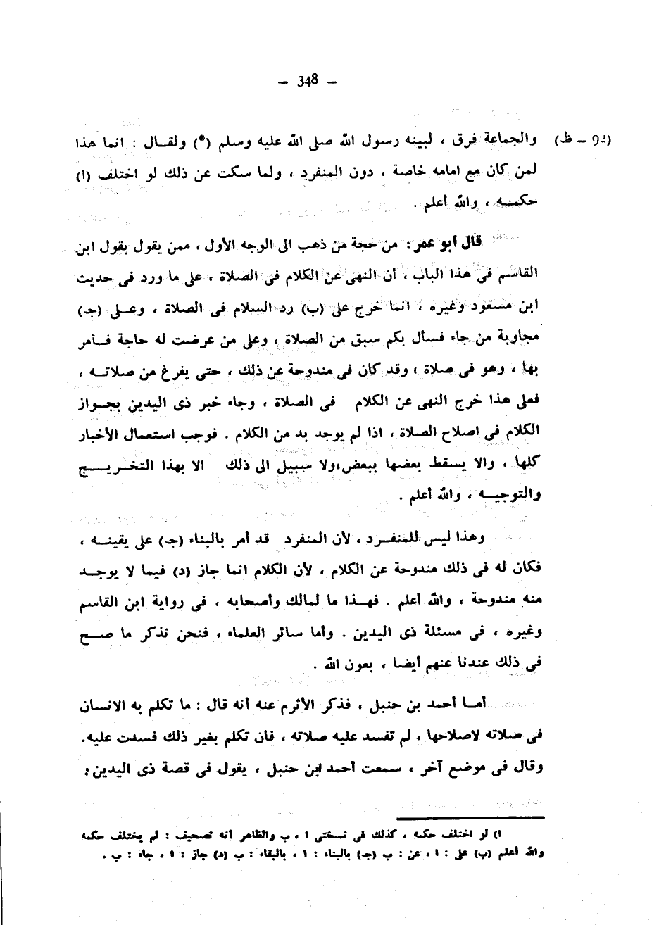 وَالْجَمَاعَةِ فَرْقٌ لَبَيَّنَهُ رَسُولُ اللَّهِ صَلَّى اللَّهُ عَلَيْهِ وَسَلَّمَ (*) وَلَقَالَ إِنَّمَا هَذَا لِمَنْ كَانَ مَعَ إِمَامِهِ خَاصَّةً دُونَ الْمُنْفَرِدِ وَلَمَا سَكَتَ عَنْ ذَلِكَ لَوِ اخْتَلَفَ حُكْمُهُ وَاللَّهُ أَعْلَمُ قَالَ أَبُو عُمَرَ مِنْ حُجَّةِ مَنْ ذَهَبَ إِلَى الْوَجْهِ الْأَوَّلِ مِمَّنْ يَقُولُ بِقَوْلِ ابْنِ الْقَاسِمِ فِي هَذَا الْبَابِ أَنَّ النَّهْيَ عَنِ الْكَلَامِ فِي الصَّلَاةِ عَلَى مَا وَرَدَ فِي حَدِيثِ ابْنِ مَسْعُودٍ وَغَيْرِهِ إِنَّمَا خَرَجَ عَلَى رَدِّ السَّلَامِ فِي الصَّلَاةِ وَعَلَى مُجَاوَبَةِ مَنْ جَاءَ فَسَأَلَ بِكَمْ سُبِقَ مِنَ الصَّلَاةِ وَعَلَى مَنْ عَرَضَتْ لَهُ حَاجَةٌ فَأَمَرَ بِهَا وَهُوَ فِي صَلَاةٍ وَقَدْ كَانَ فِي مَنْدُوحَةٍ عَنْ ذَلِكَ حَتَّى يَفْرُغَ مِنْ صَلَاتِهِ فَعَلَى هَذَا خَرَجَ النَّهْيُ عَنِ الْكَلَامِ فِي الصَّلَاةِ وَجَاءَ خبر ذي اليدين بجواز الكلام في إصلاحا الصَّلَاةِ إِذَا لَمْ يُوجَدْ بُدٌّ مِنَ الْكَلَامِ فَوَجَبَ اسْتِعْمَالُ الْأَخْبَارِ كُلِّهَا وَإِلَّا يَسْقُطُ بَعْضُهَا بِبَعْضٍ وَلَا سَبِيلَ إِلَى ذَلِكَ إِلَّا بِهَذَا التَّخْرِيجِ وَالتَّوْجِيهِ وَاللَّهُ أَعْلَمُ وَهَذَا لَيْسَ لِلْمُنْفَرِدِ لِأَنَّ الْمُنْفَرِدَ قَدْ أُمِرَ بِالْبِنَاءِ عَلَى يَقِينِهِ فَكَانَ لَهُ فِي ذَلِكَ مَنْدُوحَةٌ عَنِ الْكَلَامِ لِأَنَّ الْكَلَامَ إِنَّمَا جَازَ فِيمَا لَا يُوجَدُ مِنْهُ مَنْدُوحَةٌ وَاللَّهُ أَعْلَمُ فَهَذَا مَا لِمَالِكٍ وَأَصْحَابِهِ فِي رِوَايَةِ ابْنِ الْقَاسِمِ وَغَيْرِهِ فِي مسئلة ذِي الْيَدَيْنِ وَأَمَّا سَائِرُ الْعُلَمَاءِ فَنَحْنُ نَذْكُرُ مَا صَحَّ فِي ذَلِكَ عِنْدَنَا عَنْهُمْ أَيْضًا بِعَوْنِ اللَّهِ أَمَّا أَحْمَدُ بْنُ حَنْبَلٍ فَذَكَرَ الْأَثْرَمُ عَنْهُ أَنَّهُ قَالَ مَا تَكَلَّمَ بِهِ الْإِنْسَانُ فِي صَلَاتِهِ لِإِصْلَاحِهَا لَمْ تَفْسُدْ عَلَيْهِ صَلَاتُهُ فَإِنْ تَكَلَّمَ بِغَيْرِ ذَلِكَ فَسَدَتْ عَلَيْهِ وقال في موضع آخر سمعت أحمد ابن حَنْبَلٍ يَقُولُ فِي قِصَّةِ ذِي الْيَدَيْنِ