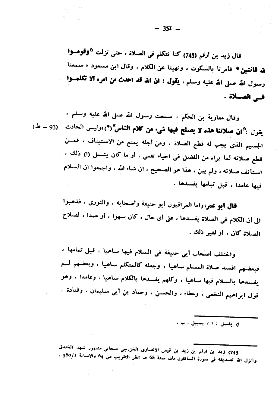 قَالَ زَيْدُ بْنُ أَرْقَمَ كُنَّا نَتَكَلَّمُ فِي الصَّلَاةِ حَتَّى نَزَلَتْ وَقُومُوا لِلَّهِ قَانِتِينَ فَأُمِرْنَا بِالسُّكُوتِ وَنُهِينَا عَنِ الْكَلَامِ وَقَالَ ابْنُ مَسْعُودٍ سَمِعْنَا رَسُولَ اللَّهِ صَلَّى اللَّهُ عَلَيْهِ وَسَلَّمَ يَقُولُ إِنَّ اللَّهَ قَدْ أَحْدَثَ مِنْ أَمْرِهِ أَلَّا تَكَلَّمُوا فِي الصَّلَاةِ وَقَالَ مُعَاوِيَةُ بْنُ الْحَكَمِ سَمِعْتُ رَسُولَ اللَّهِ صَلَّى اللَّهُ عَلَيْهِ وَسَلَّمَ يَقُولُ إِنَّ صَلَاتَنَا هَذِهِ لَا يَصْلُحْ فِيهَا شَيْءٌ مِنْ كَلَامِ النَّاسِ (*) وَلَيْسَ الْحَادِثُ الْجَسِيمُ الَّذِي يَجِبُ لَهُ قَطْعُ الصَّلَاةِ وَمِنْ أَجْلِهِ يُمْنَعُ مِنَ الِاسْتِينَافِ فَمَنْ قَطَعَ صَلَاتَهُ لِمَا يَرَاهُ مِنَ الْفَضْلِ فِي إِحْيَاءِ نَفْسٍ أَوْ مَا كَانَ يَشْمَلُ ذَلِكَ اسْتَأْنَفَ صَلَاتَهُ وَلَمْ يَبْنِ هَذَا هُوَ الصَّحِيحُ إِنْ شَاءَ اللَّهُ وَأَجْمَعُوا أَنَّ السَّلَامَ فِيهَا عَامِدًا قَبْلَ تَمَامِهَا يُفْسِدُهَا قَالَ أَبُو عُمَرَ وَأَمَّا الْعِرَاقِيُّونَ أَبُو حَنِيفَةَ وَأَصْحَابُهُ وَالثَّوْرِيُّ فَذَهَبُوا إِلَى أَنَّ الْكَلَامَ فِي الصَّلَاةِ يُفْسِدُهَا عَلَى أَيِّ حَالٍ كَانَ سَهْوًا أَوْ عَمْدًا لِصَلَاحِ الصَّلَاةِ كَانَ أَوْ لِغَيْرِ ذَلِكَ وَاخْتَلَفَ أَصْحَابُ أَبِي حَنِيفَةَ فِي السَّلَامِ فِيهَا سَاهِيًا قَبْلَ تَمَامِهَا فَبَعْضُهُمْ أَفْسَدَ صَلَاةَ الْمُسَلِّمِ سَاهِيًا وَجَعَلَهُ كَالْمُتَكَلِّمِ سَاهِيًا وبعضهم لم يفسدها بالسلام فيها سهيا وَكُلُّهُمْ يُفْسِدُهَا بِالْكَلَامِ سَاهِيًا وَعَامِدًا وَهُوَ قَوْلُ إِبْرَاهِيمَ النَّخَعِيِّ وَعَطَاءٍ وَالْحَسَنِ وَحَمَّادِ بْنِ أَبِي سليمان وقتادة