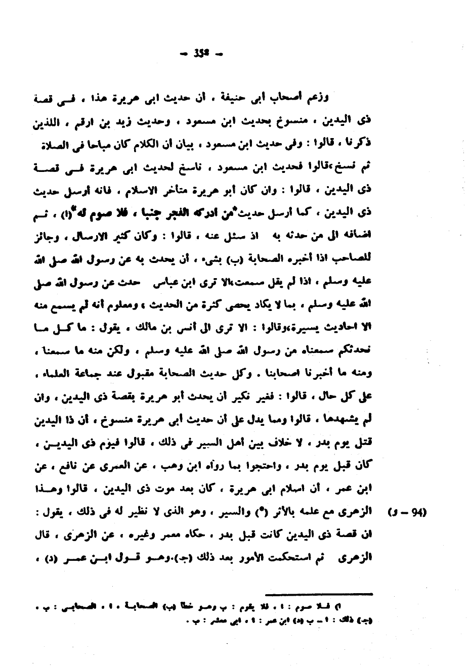 وَزَعَمَ أَصْحَابُ أَبِي حَنِيفَةَ أَنَّ حَدِيثَ أَبِي هُرَيْرَةَ هَذَا فِي قِصَّةِ ذِي الْيَدَيْنِ مَنْسُوخٌ بِحَدِيثِ ابْنِ مَسْعُودٍ وَحَدِيثِ زَيْدِ بْنِ أَرْقَمَ اللَّذَيْنِ ذَكَرْنَا قَالُوا وَفِي حَدِيثِ ابْنِ مَسْعُودٍ بَيَانُ أَنَّ الْكَلَامَ كَانَ مُبَاحًا فِي الصَّلَاةِ ثُمَّ نُسِخَ قَالُوا فَحَدِيثُ ابْنِ مَسْعُودٍ نَاسِخٌ لِحَدِيثِ أَبِي هُرَيْرَةَ فِي قِصَّةِ ذِي الْيَدَيْنِ قَالُوا وَإِنْ كَانَ أَبُو هُرَيْرَةَ مُتَأَخِّرَ الْإِسْلَامِ فَإِنَّهُ أَرْسَلَ حَدِيثَ ذِي الْيَدَيْنِ كَمَا أَرْسَلَ حَدِيثَ مَنْ أَدْرَكَهُ الْفَجْرُ جُنُبًا فَلَا صَوْمَ لَهُ ثُمَّ أَضَافَهُ إِلَى مَنْ حَدَّثَهُ بِهِ إِذْ سُئِلَ عَنْهُ قَالُوا وَكَانَ كَثِيرَ الْإِرْسَالِ وَجَائِزٌ لِلصَّاحِبِ إِذَا أَخْبَرَهُ الصَّحَابَةُ بِشَيْءٍ أَنْ يُحَدِّثَ بِهِ عَنْ رَسُولِ اللَّهِ صَلَّى اللَّهُ عَلَيْهِ وَسَلَّمَ إِذَا لَمْ يَقُلْ سَمِعْتُ أَلَا تَرَى ابْنَ عَبَّاسٍ حَدَّثَ عَنْ رَسُولِ اللَّهِ صَلَّى اللَّهُ عَلَيْهِ وَسَلَّمَ بِمَا لَا يَكَادُ يُحْصَى كَثْرَةً مِنَ الْحَدِيثِ وَمَعْلُومٌ أَنَّهُ لَمْ يسمع منه إلا أحاديث يسيرة وقولوا أَلَا تَرَى إِلَى أَنَسِ بْنِ مَالِكٍ يَقُولُ مَا كُلُّ مَا نُحَدِّثُكُمْ سَمِعْنَاهُ مِنْ رَسُولِ اللَّهِ صَلَّى اللَّهُ عَلَيْهِ وَسَلَّمَ وَلَكِنْ مِنْهُ مَا سَمِعْنَا وَمِنْهُ مَا أَخْبَرَنَا أَصْحَابُنَا وَكُلٌّ حديث الصحابة مَقْبُولٌ عِنْدَ جَمَاعَةِ الْعُلَمَاءِ عَلَى كُلِّ حَالٍ قَالُوا فَغَيْرُ نَكِيرٍ أَنْ يُحَدِّثَ أَبُو هُرَيْرَةَ بِقِصَّةِ ذِي الْيَدَيْنِ وَإِنْ لَمْ يَشْهَدْهَا قَالُوا وَمِمَّا يَدُلُّ عَلَى أَنَّ حَدِيثَ أَبِي هُرَيْرَةَ مَنْسُوخٌ أَنَّ ذَا الْيَدَيْنِ قُتِلَ يَوْمَ بَدْرٍ لَا خِلَافَ بَيْنَ أَهْلِ السِّيَرِ فِي ذَلِكَ قَالُوا فَيَوْمُ ذِي الْيَدَيْنِ كَانَ قَبْلَ يَوْمِ بَدْرٍ وَاحْتَجُّوا بِمَا رَوَاهُ ابْنُ وَهْبٍ عَنِ الْعُمَرِيِّ عَنْ نَافِعٍ عَنِ ابْنِ عُمَرَ أَنَّ إِسْلَامَ أَبِي هُرَيْرَةَ كَانَ بَعْدَ مَوْتِ ذِي الْيَدَيْنِ قَالُوا وَهَذَا الزُّهُرِيُّ مَعَ عِلْمِهِ بِالْأَثَرِ (*) وَالسِّيَرِ وَهُوَ الَّذِي لَا نَظِيرَ لَهُ فِي ذَلِكَ يَقُولُ إِنَّ قِصَّةَ ذِي الْيَدَيْنِ كَانَتْ قَبْلَ بَدْرٍ حَكَاهُ مَعْمَرٌ وَغَيْرُهُ عَنِ الزُّهُرِيِّ قَالَ الزُّهُرِيُّ ثُمَّ اسْتُحْكِمَتِ الْأُمُورُ بَعْدَ ذَلِكَ وَهُوَ قَوْلُ ابْنِ عُمَرَ
