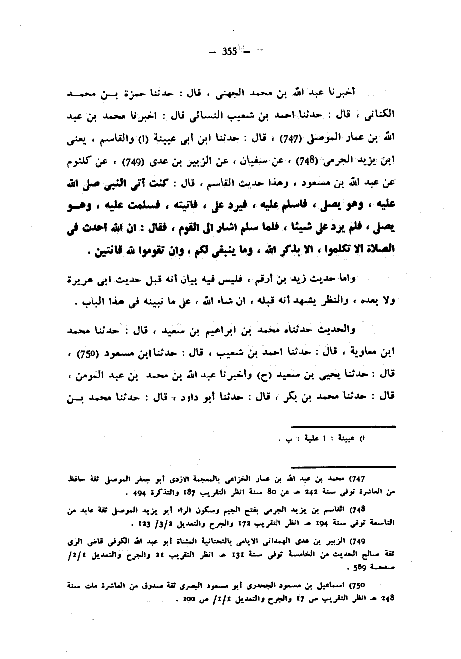أَخْبَرَنَا عَبْدُ اللَّهِ بْنُ مُحَمَّدٍ الْجُهَنِيُّ قَالَ حَدَّثَنَا حَمْزَةُ بْنُ مُحَمَّدٍ الْكِنَانِيُّ قَالَ حَدَّثَنَا أَحْمَدُ بْنُ شُعَيْبٍ النَّسَائِيُّ قَالَ أَخْبَرَنَا مُحَمَّدُ بْنُ عَبْدِ اللَّهِ بْنِ عَمَّارٍ الْمَوْصِلِيُّ قَالَ حَدَّثَنَا ابْنُ أَبِي عُيَيْنَةَ وَالْقَاسِمُ يَعْنِي ابْنَ يَزِيدَ الْجَرْمِيَّ عَنْ سُفْيَانَ عَنِ الزُّبَيْرِ بْنِ عَدِيٍّ عَنْ كُلْثُومٍ عَنْ عَبْدِ اللَّهِ بْنِ مَسْعُودٍ وَهَذَا حَدِيثُ الْقَاسِمِ قَالَ كُنْتُ آتِي النَّبِيَّ صَلَّى اللَّهُ عَلَيْهِ وَسَلَّمَ وَهُوَ يُصَلِّي فَأُسَلِّمُ عَلَيْهِ فَيَرُدُّ عَلَيَّ فَأَتَيْتُهُ فَسَلَّمْتُ عَلَيْهِ وهو يصلي فلم يرد علي شيئا فلم سَلَّمَ أَشَارَ إِلَى الْقَوْمِ فَقَالَ إِنَّ اللَّهَ أَحْدَثَ فِي الصَّلَاةِ أَلَّا تَكَلَّمُوا إِلَّا بِذِكْرِ اللَّهِ وَمَا يَنْبَغِي لَكُمْ وَأَنْ تَقُومُوا لِلَّهِ قَانِتِينَ وَأَمَّا حَدِيثُ زَيْدَ بْنِ أَرْقَمَ فَلَيْسَ فِيهِ بَيَانُ أَنَّهُ قَبْلَ حَدِيثِ أَبِي هُرَيْرَةَ وَلَا بَعْدَهُ وَالنَّظَرُ يَشْهَدُ أَنَّهُ قَبْلَهُ إِنْ شَاءَ اللَّهُ عَلَى مَا نُبَيِّنُهُ فِي هَذَا الْبَابِ وَالْحَدِيثُ حَدَّثَنَاهُ مُحَمَّدُ بْنُ إِبْرَاهِيمَ بْنِ سَعِيدٍ قَالَ حَدَّثَنَا محمد ابن مُعَاوِيَةَ قَالَ حَدَّثَنَا أَحْمَدُ بْنُ شُعَيْبٍ قَالَ حَدَّثَنَا ابْنُ مَسْعُودٍ قَالَ حَدَّثَنَا يَحْيَى بْنُ سَعِيدٍ وَأَخْبَرَنَا عَبْدُ اللَّهِ بْنُ مُحَمَّدِ بْنِ عَبْدِ الْمُؤْمِنِ قَالَ حَدَّثَنَا مُحَمَّدُ بْنُ بَكْرٍ قَالَ حَدَّثَنَا أَبُو دَاوُدَ قَالَ حَدَّثَنَا مُحَمَّدُ بْنُ