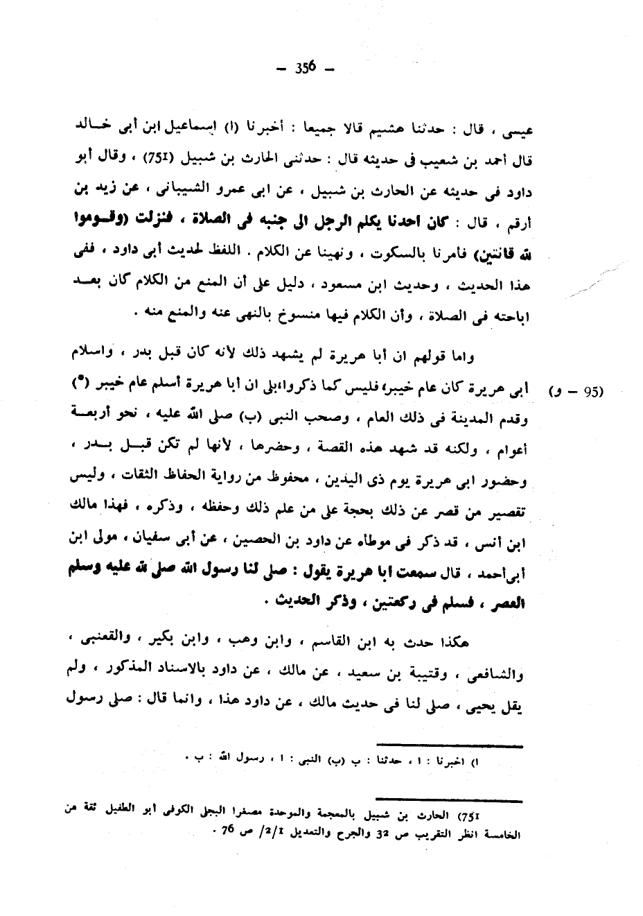 عِيسَى قَالَ حَدَّثَنَا هُشَيْمٌ قَالَا جَمِيعًا أخبرنا إسماعيل ابن أَبِي خَالِدٍ قَالَ أَحْمَدُ بْنُ شُعَيْبٍ فِي حَدِيثِهِ قَالَ حَدَّثَنِي الْحَارِثُ بْنُ شُبَيْلٍ وَقَالَ أَبُو دَاوُدَ فِي حَدِيثِهِ عَنِ الْحَارِثِ بْنِ شُبَيْلٍ عَنْ أَبِي عَمْرٍو الشَّيْبَانِيِّ عَنْ زَيْدِ بْنِ أَرْقَمَ قَالَ كَانَ أَحَدُنَا يُكَلِّمُ الرَّجُلَ إِلَى جَنْبِهِ فِي الصَّلَاةِ فَنَزَلَتْ وَقُومُوا لِلَّهِ قَانِتِينَ فَأُمِرْنَا بِالسُّكُوتِ وَنُهِينَا عَنِ الْكَلَامِ اللَّفْظُ لِحَدِيثِ أَبِي دَاوُدَ فَفِي هَذَا الْحَدِيثِ وَحَدِيثِ ابْنِ مَسْعُودٍ دَلِيلٌ عَلَى أَنَّ الْمَنْعَ مِنَ الْكَلَامِ كَانَ بَعْدَ إِبَاحَتِهِ فِي الصَّلَاةِ وَأَنَّ الْكَلَامَ فِيهَا مَنْسُوخٌ بِالنَّهْيِ عَنْهُ وَالْمَنْعِ مِنْهُ وَأَمَّا قَوْلُهُمْ إِنَّ أَبَا هُرَيْرَةَ لَمْ يَشْهَدْ ذَلِكَ لِأَنَّهُ كَانَ قَبْلَ بَدْرٍ وَإِسْلَامُ أَبِي هُرَيْرَةَ كَانَ عَامَ خَيْبَرَ فَلَيْسَ كَمَا ذَكَرُوا بَلَى إِنَّ أَبَا هُرَيْرَةَ أَسْلَمَ عَامَ خَيْبَرَ (*) وَقَدِمَ الْمَدِينَةَ فِي ذَلِكَ الْعَامِ وَصَحِبَ النَّبِيَّ صلى الله عليه وسلم نحو أربعة أعوم وَلَكِنَّهُ قَدْ شَهِدَ هَذِهِ الْقِصَّةَ وَحَضَرَهَا لِأَنَّهَا لَمْ تَكُنْ قَبْلَ بَدْرٍ وَحُضُورُ أَبِي هُرَيْرَةَ يَوْمَ ذِي الْيَدَيْنِ مَحْفُوظٌ مِنْ رِوَايَةِ الْحُفَّاظِ الثِّقَاتِ وَلَيْسَ تَقْصِيرُ مَنْ قَصَّرَ عَنْ ذَلِكَ بِحُجَّةٍ عَلَى مَنْ عَلِمَ ذَلِكَ وَحَفِظَهُ وَذَكَرَهُ فهذا مالك ابن أنس قد ذكر في موطأه عن داود بن الحصين عن أبي سفيان مَوْلَى ابْنِ أَبِي أَحْمَدَ قَالَ سَمِعْتُ أَبَا هُرَيْرَةَ يَقُولُ صَلَّى لَنَا رَسُولُ اللَّهِ صَلَّى اللَّهُ عَلَيْهِ وَسَلَّمَ الْعَصْرَ فَسَلَّمَ فِي رَكْعَتَيْنِ وَذَكَرَ الْحَدِيثَ هَكَذَا حَدَّثَ بِهِ ابْنُ الْقَاسِمِ وَابْنُ وَهْبٍ وَابْنُ بُكَيْرٍ وَالْقَعْنَبِيُّ وَالشَّافِعِيُّ وَقُتَيْبَةُ بْنُ سَعِيدٍ عَنْ مَالِكٍ عَنْ دَاوُدَ بِالْإِسْنَادِ الْمَذْكُورِ وَلَمْ يَقُلْ يَحْيَى صَلَّى لَنَا فِي حَدِيثِ مَالِكٍ عَنْ دَاوُدَ هَذَا وَإِنَّمَا قَالَ صَلَّى رَسُولُ