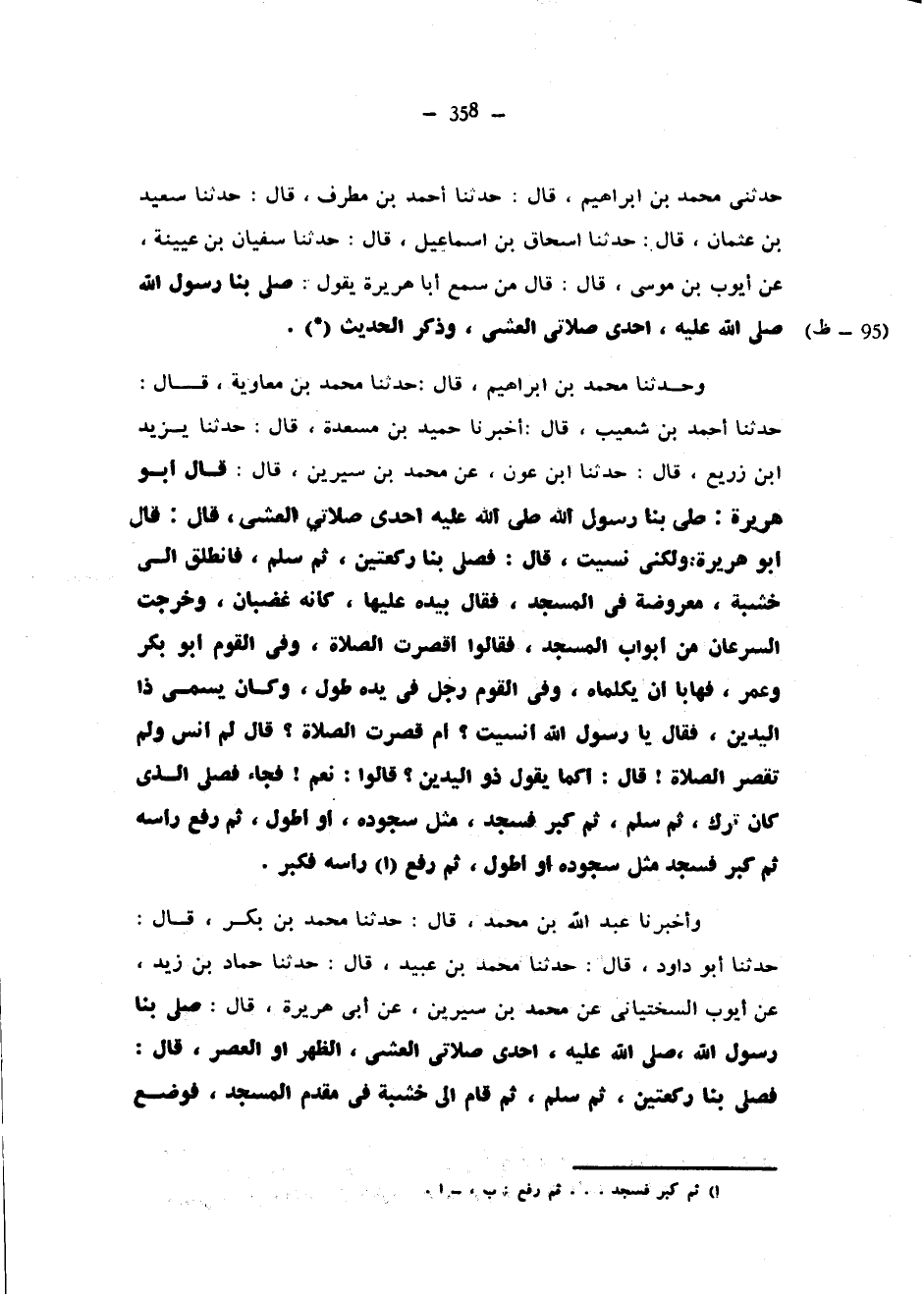 حَدَّثَنِي مُحَمَّدُ بْنُ إِبْرَاهِيمَ قَالَ حَدَّثَنَا أَحْمَدُ بْنُ مُطَرِّفٍ قَالَ حَدَّثَنَا سَعِيدُ بْنُ عُثْمَانَ قَالَ حَدَّثَنَا إِسْحَاقُ بْنُ إِسْمَاعِيلَ قَالَ حَدَّثَنَا سُفْيَانُ بْنُ عُيَيْنَةَ عَنْ أَيُّوبَ بْنِ مُوسَى قَالَ قَالَ مَنْ سَمِعَ أَبَا هُرَيْرَةَ يَقُولُ صَلَّى بِنَا رَسُولُ اللَّهِ صَلَّى اللَّهُ عَلَيْهِ وسلم إِحْدَى صَلَاتَيِ الْعَشِيِّ وَذَكَرَ الْحَدِيثَ (*) وَحَدَّثَنَا مُحَمَّدُ بْنُ إِبْرَاهِيمَ قَالَ حَدَّثَنَا مُحَمَّدُ بْنُ مُعَاوِيَةَ قَالَ حَدَّثَنَا أَحْمَدُ بْنُ شُعَيْبٍ قَالَ أَخْبَرَنَا حميد بن مسعدة قال حدثنا يزيد ابن زُرَيْعٍ قَالَ حَدَّثَنَا ابْنُ عَوْنٍ عَنْ مُحَمَّدِ بْنِ سِيرِينَ قَالَ قَالَ أَبُو هُرَيْرَةَ صَلَّى بِنَا رَسُولُ اللَّهِ صَلَّى اللَّهُ عَلَيْهِ وَسَلَّمَ إِحْدَى صَلَاتَيِ الْعَشِيِّ قَالَ قَالَ أَبُو هُرَيْرَةَ وَلَكِنِّي نَسِيتُ قَالَ فَصَلَّى بِنَا رَكْعَتَيْنِ ثُمَّ سَلَّمَ فَانْطَلَقَ إِلَى خَشَبَةٍ مَعْرُوضَةٍ فِي الْمَسْجِدِ فَقَالَ بِيَدِهِ عَلَيْهَا كَأَنَّهُ غَضْبَانُ وَخَرَجَتِ السَّرَعَانُ مِنْ أَبْوَابِ الْمَسْجِدِ فَقَالُوا أَقَصُرَتِ الصَّلَاةُ وَفِي الْقَوْمِ أَبُو بَكْرٍ وَعُمَرُ فَهَابَا أَنْ يُكَلِّمَاهُ وَفِي الْقَوْمِ رَجُلٌ فِي يَدِهِ طُولٌ وَكَانَ يُسَمَّى ذا اليدين فقال يا رسول الله أنسيت أَمْ قَصُرَتِ الصَّلَاةُ قَالَ لَمْ أَنْسَ وَلَمْ تَقْصُرِ الصَّلَاةُ قَالَ أَكَمَا يَقُولُ ذُو الْيَدَيْنِ قَالُوا نَعَمْ فَجَاءَ فَصَلَّى الَّذِي كَانَ تَرَكَ ثُمَّ سَلَّمَ ثُمَّ كَبَّرَ فَسَجَدَ مِثْلَ سُجُودِهِ أَوْ أَطْوَلَ ثُمَّ رَفَعَ رَأْسَهُ ثُمَّ كَبَّرَ فَسَجَدَ مِثْلَ سُجُودِهِ أَوْ أَطْوَلَ ثُمَّ رَفَعَ رَأْسَهُ فَكَبَّرَ وَأَخْبَرَنَا عَبْدُ اللَّهِ بْنُ مُحَمَّدٍ قَالَ حَدَّثَنَا مُحَمَّدُ بْنُ بَكْرٍ قَالَ حَدَّثَنَا أَبُو دَاوُدَ قَالَ حَدَّثَنَا مُحَمَّدُ بْنُ عُبَيْدٍ قَالَ حَدَّثَنَا حَمَّادُ بْنُ زَيْدٍ عَنْ أَيُّوبَ السِّخْتِيَانِيِّ عَنْ مُحَمَّدِ بْنِ سِيرِينَ عَنْ أَبِي هُرَيْرَةَ قَالَ صَلَّى بِنَا رَسُولُ اللَّهِ صَلَّى اللَّهُ عليه وسلم إِحْدَى صَلَاتَيِ الْعَشِيِّ الظُّهْرَ أَوِ الْعَصْرَ قَالَ فَصَلَّى بِنَا رَكْعَتَيْنِ ثُمَّ سَلَّمَ ثُمَّ قَامَ إِلَى خَشَبَةٍ فِي مُقَدَّمِ الْمَسْجِدِ فَوَضَعَ