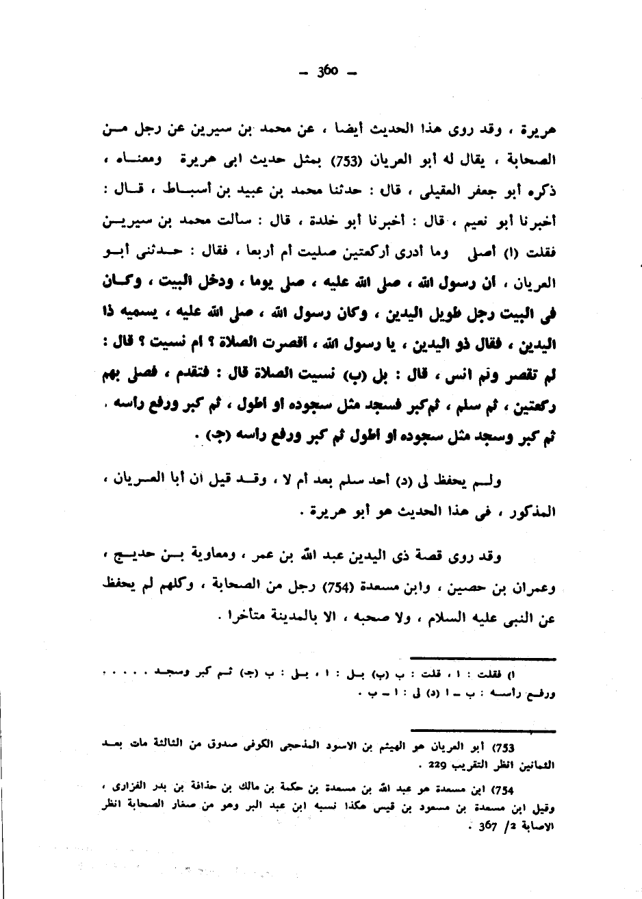 هُرَيْرَةَ وَقَدْ رُوِيَ هَذَا الْحَدِيثُ أَيْضًا عَنْ مُحَمَّدِ بْنِ سِيرِينَ عَنْ رَجُلٍ مِنَ الصَّحَابَةِ يُقَالُ لَهُ أَبُو الْعُرْيَانِ بِمِثْلِ حَدِيثِ أَبِي هُرَيْرَةَ وَمَعْنَاهُ ذَكَرَهُ أَبُو جَعْفَرٍ الْعُقَيْلِيُّ قَالَ حَدَّثَنَا مُحَمَّدُ بْنُ عُبَيْدِ بْنِ أَسْبَاطٍ قَالَ أَخْبَرَنَا أَبُو نُعَيْمٍ قَالَ أَخْبَرَنَا أَبُو خَلْدَةَ قَالَ سَأَلْتُ مُحَمَّدَ بْنَ سِيرِينَ فَقُلْتُ أُصَلِّي وَمَا أَدْرِي أَرَكْعَتَيْنِ صَلَّيْتُ أَمْ أَرْبَعًا فَقَالَ حَدَّثَنِي أَبُو الْعُرْيَانِ أَنَّ رَسُولَ اللَّهِ صَلَّى اللَّهُ عَلَيْهِ صَلَّى يَوْمًا وَدَخَلَ الْبَيْتَ وَكَانَ فِي الْبَيْتِ رَجُلٌ طَوِيلُ الْيَدَيْنِ وَكَانَ رَسُولُ اللَّهِ صَلَّى اللَّهُ عَلَيْهِ وَسَلَّمَ يُسَمِّيهِ ذَا الْيَدَيْنِ فَقَالَ ذُو الْيَدَيْنِ يَا رَسُولَ اللَّهِ أَقْصُرَتِ الصَّلَاةُ أَمْ نَسِيتَ قَالَ لَمْ تَقْصُرْ وَلَمْ أَنْسَ قَالَ بَلْ نَسِيتَ الصَّلَاةَ قَالَ فَتَقَدَّمَ فَصَلَّى بِهِمْ رَكْعَتَيْنِ ثُمَّ سَلَّمَ ثُمَّ كَبَّرَ فَسَجَدَ مِثْلَ سُجُودِهِ أَوْ أَطْوَلَ ثُمَّ كَبَّرَ وَرَفَعَ رَأْسَهُ ثُمَّ كَبَّرَ وَسَجَدَ مِثْلَ سُجُودِهِ أَوْ أَطْوَلَ ثُمَّ كَبَّرَ وَرَفَعَ رَأْسَهُ وَلَمْ يَحْفَظْ لِي أَحَدٌ سَلَّمَ بَعْدُ أَمْ لَا وَقَدْ قِيلَ إِنَّ أَبَا الْعُرْيَانِ الْمَذْكُورَ فِي هَذَا الْحَدِيثِ هُوَ أَبُو هُرَيْرَةَ وَقَدْ رَوَى قِصَّةَ ذِي الْيَدَيْنِ عَبْدُ اللَّهِ بْنُ عُمَرَ وَمُعَاوِيَةُ بْنُ حُدَيْجٍ وَعِمْرَانُ بْنُ حُصَيْنٍ وَابْنُ مَسْعَدَةَ رَجُلٌ مِنَ الصَّحَابَةِ وَكُلُّهُمْ لَمْ يَحْفَظْ عَنِ النَّبِيِّ عَلَيْهِ السَّلَامُ وَلَا صَحِبَهُ إِلَّا بِالْمَدِينَةِ مُتَأَخِّرًا