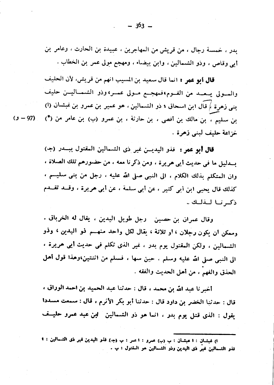 بَدْرٍ خَمْسَةُ رِجَالٍ مِنْ قُرَيْشٍ مِنَ الْمُهَاجِرِينَ عُبَيْدَةُ بْنُ الْحَارِثِ وَعَامِرُ بْنُ أَبِي وَقَّاصٍ وَذُو الشِّمَالَيْنِ وَابْنُ بَيْضَاءَ وَمِهْجَعٌ مَوْلَى عُمَرَ بْنِ الْخَطَّابِ قَالَ أَبُو عُمَرَ إِنَّمَا قَالَ سَعِيدُ بْنُ الْمُسَيَّبِ إِنَّهُمْ مِنْ قُرَيْشٍ لِأَنَّ الْحَلِيفَ وَالْمَوْلَى يُعَدُّ مِنَ الْقَوْمِ فَمِهْجَعٌ مَوْلَى عُمَرَ وَذُو الشِّمَالَيْنِ حَلِيفُ بَنِي زُهْرَةَ قَالَ ابن إسحق ذُو الشِّمَالَيْنِ هُوَ عُمَيْرُ بْنُ عَمْرِو بْنِ غَبْشَانَ بْنِ سُلَيْمِ بْنِ مَالِكِ بْنِ أَفْضَى بْنِ حَارِثَةَ بْنِ عَمْرِو بْنِ عَامِرٍ مِنْ (*) خُزَاعَةَ حَلِيفٌ لِبَنِي زُهْرَةَ قَالَ أَبُو عُمَرَ فَذُو الْيَدَيْنِ غَيْرُ ذِي الشِّمَالَيْنِ الْمَقْتُولِ بِبَدْرٍ بِدَلِيلِ مَا فِي حَدِيثِ أَبِي هُرَيْرَةَ وَمَنْ ذَكَرْنَا مَعَهُ مِنْ حُضُورِهِمْ تِلْكَ الصَّلَاةَ وَأَنَّ الْمُتَكَلِّمَ بِذَلِكَ الْكَلَامِ إِلَى النَّبِيِّ صَلَّى اللَّهُ عَلَيْهِ وَسَلَّمَ رَجُلٌ مِنْ بَنِي سُلَيْمٍ كَذَلِكَ قَالَ يَحْيَى ابن أَبِي كَثِيرٍ عَنْ أَبِي سَلَمَةَ عَنْ أَبِي هُرَيْرَةَ وَقَدْ تَقَدَّمَ ذِكْرُنَا لِذَلِكَ وَقَالَ عِمْرَانُ بْنُ حُصَيْنٍ رَجُلٌ طَوِيلُ الْيَدَيْنِ يُقَالُ لَهُ الْخِرْبَاقُ وَمُمْكِنٌ أَنْ يَكُونَ رَجُلَانِ أَوْ ثَلَاثَةً يُقَالُ لِكُلِّ وَاحِدٍ مِنْهُمْ ذُو الْيَدَيْنِ وَذُو الشِّمَالَيْنِ وَلَكِنَّ الْمَقْتُولَ يَوْمَ بَدْرٍ غَيْرُ الَّذِي تَكَلَّمَ فِي حَدِيثِ أَبِي هُرَيْرَةَ إِلَى النَّبِيِّ صَلَّى اللَّهُ عَلَيْهِ وَسَلَّمَ حِينَ سَهَا فَسَلَّمَ مِنِ اثْنَتَيْنِ وَهَذَا قَوْلُ أَهْلِ الْحِذْقِ وَالْفَهْمِ مِنْ أَهْلِ الْحَدِيثِ وَالْفِقْهِ أَخْبَرَنَا عَبْدُ اللَّهِ بْنُ مُحَمَّدٍ قَالَ حَدَّثَنَا عَبْدُ الْحَمِيدِ بْنُ أَحْمَدَ الْوَرَّاقُ قَالَ حَدَّثَنَا الْخَضِرُ بْنُ دَاوُدَ قَالَ حَدَّثَنَا أَبُو بَكْرٍ الْأَثْرَمُ قَالَ سَمِعْتُ مُسَدَّدًا يَقُولُ الَّذِي قُتِلَ يَوْمَ بَدْرٍ إِنَّمَا هُوَ ذُو الشِّمَالَيْنِ ابْنُ عَبْدِ عَمْرٍو حَلِيفٌ