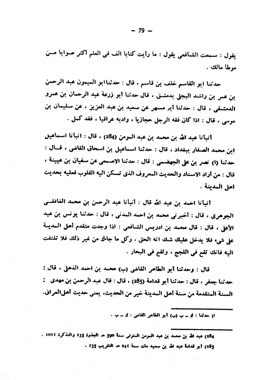 يَقُولُ سَمِعْتُ الشَّافِعِيَّ يَقُولُ مَا رَأَيْتُ كِتَابًا أُلِّفَ فِي الْعِلْمِ أَكْثَرَ صَوَابًا مِنْ مُوَطَّأِ مالك حدثا أَبُو الْقَاسِمِ خَلَفُ بْنُ قَاسِمٍ قَالَ حَدَّثَنَا أَبُو الْمَيْمُونِ عَبْدُ الرَّحْمَنِ بْنُ عُمَرَ بْنِ رَاشِدٍ الْبَجَلِيُّ بِدِمَشْقَ قَالَ حَدَّثَنَا أَبُو زُرْعَةَ عَبْدُ الرحمان بْنُ عَمْرٍو الدِّمَشْقِيُّ قَالَ حَدَّثَنَا أَبُو مُسْهِرٍ عَنْ سَعِيدِ بْنِ عَبْدِ الْعَزِيزِ عَنْ سُلَيْمَانَ بْنِ مُوسَى قَالَ إِذَا كَانَ فِقْهُ الرَّجُلِ حِجَازِيًّا وَأَدَبُهُ عِرَاقِيًّا فَقَدْ كَمُلَ أَنْبَأَنَا عَبْدُ اللَّهِ بْنُ مُحَمَّدِ بْنِ عَبْدِ الْمُؤْمِنِ قال أَنْبَأَنَا إِسْمَاعِيلُ بْنُ مُحَمَّدٍ الصَّفَّارُ بِبَغْدَادَ قَالَ حَدَّثَنَا إِسْمَاعِيلُ بْنُ إِسْحَاقَ الْقَاضِي قَالَ حَدَّثَنَا نَصْرُ بْنُ عَلِيٍّ الْجَهْضَمِيُّ قَالَ حَدَّثَنَا الْأَصْمَعِيُّ عَنْ سُفْيَانَ بْنِ عُيَيْنَةَ قَالَ مَنْ أَرَادَ الْإِسْنَادَ وَالْحَدِيثَ الْمَعْرُوفَ الَّذِي تَسْكُنُ إِلَيْهِ الْقُلُوبُ فَعَلَيْهِ بِحَدِيثِ أَهْلِ الْمَدِينَةِ أَنْبَأَنَا أَحْمَدُ بْنُ عَبْدِ اللَّهِ قَالَ أَنْبَأَنَا عَبْدُ الرَّحْمَنِ بْنُ مُحَمَّدٍ الْغَافِقِيُّ الْجَوْهَرِيُّ قَالَ أَخْبَرَنِي مُحَمَّدُ بْنُ أَحْمَدَ الْمَدَنِيُّ قَالَ حَدَّثَنَا يُونُسُ بْنُ عَبْدِ الْأَعْلَى قَالَ قَالَ مُحَمَّدُ بْنُ إِدْرِيسَ الشَّافِعِيُّ إِذَا وَجَدْتَ مُتَقَدِّمَ أَهْلِ الْمَدِينَةِ عَلَى شَيْءٍ فَلَا يَدْخُلُ عَلَيْكَ شَكٌّ أَنَّهُ الْحَقُّ وَكُلُّ مَا جَاءَكَ مِنْ غَيْرِ ذَلِكَ فَلَا تَلْتَفِتْ إِلَيْهِ فَإِنَّكَ تَقَعُ فِي اللُّجُجِ وَتَقَعُ فِي الْبِحَارِ قَالَ وَحَدَّثَنَا أَبُو الطَّاهِرِ الْقَاضِي مُحَمَّدُ بْنُ أَحْمَدَ الذُّهْلِيُّ قَالَ حَدَّثَنَا جَعْفَرٌ قَالَ حَدَّثَنَا أَبُو قُدَامَةَ قَالَ قَالَ عَبْدُ الرَّحْمَنِ بن مهدي السنة المتقدمة من سنة أهل الْمَدِينَةِ خَيْرٌ مِنَ الْحَدِيثِ يَعْنِي حَدِيثَ أَهْلِ العراق