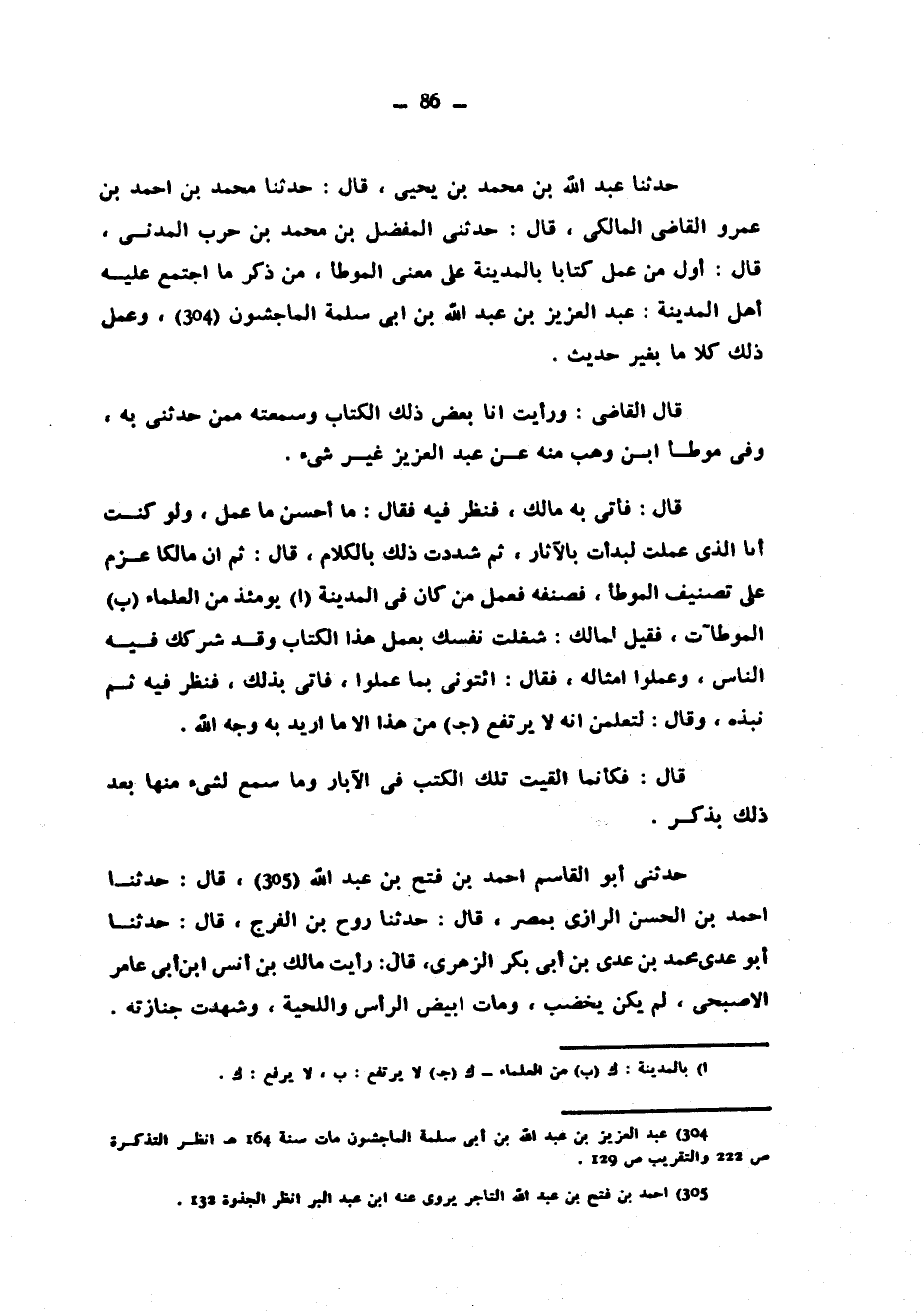 حَدَّثَنَا عَبْدُ اللَّهِ بْنُ مُحَمَّدِ بْنِ يَحْيَى قَالَ حَدَّثَنَا مُحَمَّدُ بْنُ أَحْمَدَ بْنِ عَمْرٍو الْقَاضِي الْمَالِكِيُّ قَالَ حَدَّثَنِي الْمُفَضَّلُ بْنُ مُحَمَّدِ بْنِ حَرْبٍ الْمَدَنِيُّ قَالَ أَوَّلُ مَنْ عَمِلَ كِتَابًا بِالْمَدِينَةِ عَلَى مَعْنَى الْمُوَطَّأِ مِنْ ذِكْرِ مَا اجْتَمَعَ عَلَيْهِ أَهْلُ الْمَدِينَةِ عَبْدُ الْعَزِيزِ بْنُ عَبْدِ اللَّهِ بْنِ أَبِي سَلَمَةَ الْمَاجِشُونُ وعمل ذلك كلا ما يغير حَدِيثٍ قَالَ الْقَاضِي وَرَأَيْتُ أَنَا بَعْضَ ذَلِكَ الْكِتَابِ وَسَمِعْتُهُ مِمَّنْ حَدَّثَنِي بِهِ وَفِي مُوَطَّأِ ابن وهب منه عن عبد العزيز غير شيء قال فأتى به مالك فَنَظَرَ فِيهِ فَقَالَ مَا أَحْسَنَ مَا عَمِلَ ولو كنت أنا الذي علمت لَبَدَأْتُ بِالْآثَارِ ثُمَّ شَدَدْتُ ذَلِكَ بِالْكَلَامِ قَالَ ثُمَّ إِنَّ مَالِكًا عَزَمَ عَلَى تَصْنِيفِ الْمُوَطَّأِ فَصَنَّفَهُ فَعَمِلَ مَنْ كَانَ فِي الْمَدِينَةِ يَوْمَئِذٍ مِنَ الْعُلَمَاءِ الْمُوطَّآتِ فَقِيلَ لِمَالِكٍ شَغَلْتَ نَفْسَكَ بِعَمَلِ هَذَا الْكِتَابِ وَقَدْ شَرَكَكَ فِيهِ النَّاسُ وَعَمِلُوا أَمْثَالَهُ فَقَالَ ائْتُونِي بِمَا عَمِلُوا فَأُتِيَ بِذَلِكَ فَنَظَرَ فِيهِ ثُمَّ نَبَذَهُ وَقَالَ لَتَعْلَمُنَّ أَنَّهُ لَا يَرْتَفِعُ مِنْ هَذَا إِلَّا مَا أُرِيدَ بِهِ وَجْهَ اللَّهِ قَالَ فَكَأَنَّمَا أُلْقِيَتْ تِلْكَ الْكُتُبُ فِي الْآبَارِ وَمَا سُمِعَ لِشَيْءٍ مِنْهَا بَعْدَ ذَلِكَ بِذِكْرٍ حَدَّثَنِي أَبُو الْقَاسِمِ أَحْمَدُ بْنُ فَتْحِ بْنِ عَبْدِ اللَّهِ قَالَ حَدَّثَنَا أَحْمَدُ بْنُ الْحَسَنِ الرَّازِيُّ بِمِصْرَ قَالَ حَدَّثَنَا رُوحُ بْنُ الْفَرَجِ قَالَ حَدَّثَنَا أَبُو عَدِيٍّ مُحَمَّدُ بْنُ عَدِيِّ بْنِ أَبِي بَكْرٍ الزهري قال رأيت مالك بن أنس ابن أَبِي عَامِرٍ الْأَصْبَحِيَّ لَمْ يَكُنْ يُخَضِّبُ وَمَاتَ أَبْيَضَ الرَّأْسِ وَاللِّحْيَةِ وَشَهِدْتُ جِنَازَتَهُ