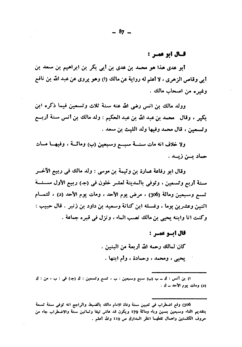 قَالَ أَبُو عُمَرَ أَبُو عَدِيٍّ هَذَا هُوَ مُحَمَّدُ بْنُ عَدِيِّ بْنِ أَبِي بَكْرِ بْنِ إِبْرَاهِيمَ بْنِ سَعْدِ بْنِ أَبِي وَقَّاصٍ الزُّهْرِيُّ لَا أَعْلَمُ لَهُ رِوَايَةً عَنْ مَالِكٍ وَهُوَ يَرْوِي عَنْ عَبْدِ اللَّهِ بْنِ نَافِعٍ وَغَيْرِهِ مِنْ أَصْحَابِ مَالِكٍ وَوُلِدَ مَالِكُ بْنُ أَنَسٍ رَضِيَ اللَّهُ عَنْهُ سَنَةَ ثَلَاثٍ وَتِسْعِينَ فِيمَا ذَكَرَهُ ابْنُ بُكَيْرٍ وَقَالَ مُحَمَّدُ بْنُ عَبْدِ اللَّهِ بْنِ عَبْدِ الْحَكِيمِ وُلِدَ مَالِكُ بْنُ أَنَسٍ سَنَةَ أَرْبَعٍ وَتِسْعِينَ قَالَ مُحَمَّدٌ وَفِيهَا وُلِدَ اللَّيْثُ بْنُ سَعْدٍ وَلَا خِلَافَ أَنَّهُ مَاتَ سَنَةَ سَبْعٍ وَسَبْعِينَ وَمِائَةٍ وَفِيهَا مَاتَ حَمَّادُ بْنُ زَيْدٍ وَقَالَ أَبُو رِفَاعَةَ عِمَارَةُ بْنُ وَثِيمَةَ بْنِ مُوسَى وُلِدَ مَالِكٌ فِي رَبِيعٍ الْآخَرِ سَنَةَ أَرْبَعٍ وَتِسْعِينَ وَتُوفِّيَ بِالْمَدِينَةِ لِعَشْرٍ خَلَوْنَ فِي رَبِيعِ الْأَوَّلِ سَنَةَ تِسْعٍ وَسَبْعِينَ وَمِائَةٍ مَرِضَ يَوْمَ الْأَحَدِ وَمَاتَ يَوْمَ الْأَحَدِ لِتَمَامِ اثْنَيْنِ وَعِشْرِينَ يَوْمًا وَغَسَّلَهُ ابْنُ كِنَانَةَ وَسَعِيدُ بْنُ دَاوُدَ بْنِ زَنْبَرٍ قَالَ حَبِيبٌ وَكُنْتُ أَنَا وَابْنُهُ يَحْيَى بْنُ مَالِكٍ نَصُبُّ الْمَاءَ وَنَزَلَ فِي قَبْرِهِ جَمَاعَةٌ قَالَ أَبُو عُمَرَ كَانَ لِمَالِكٍ رَحِمَهُ اللَّهُ أَرْبَعَةٌ مِنَ الْبَنِينَ يَحْيَى وَمُحَمَّدٌ وَحَمَّادَةُ وَأُمُّ ابْنِهَا