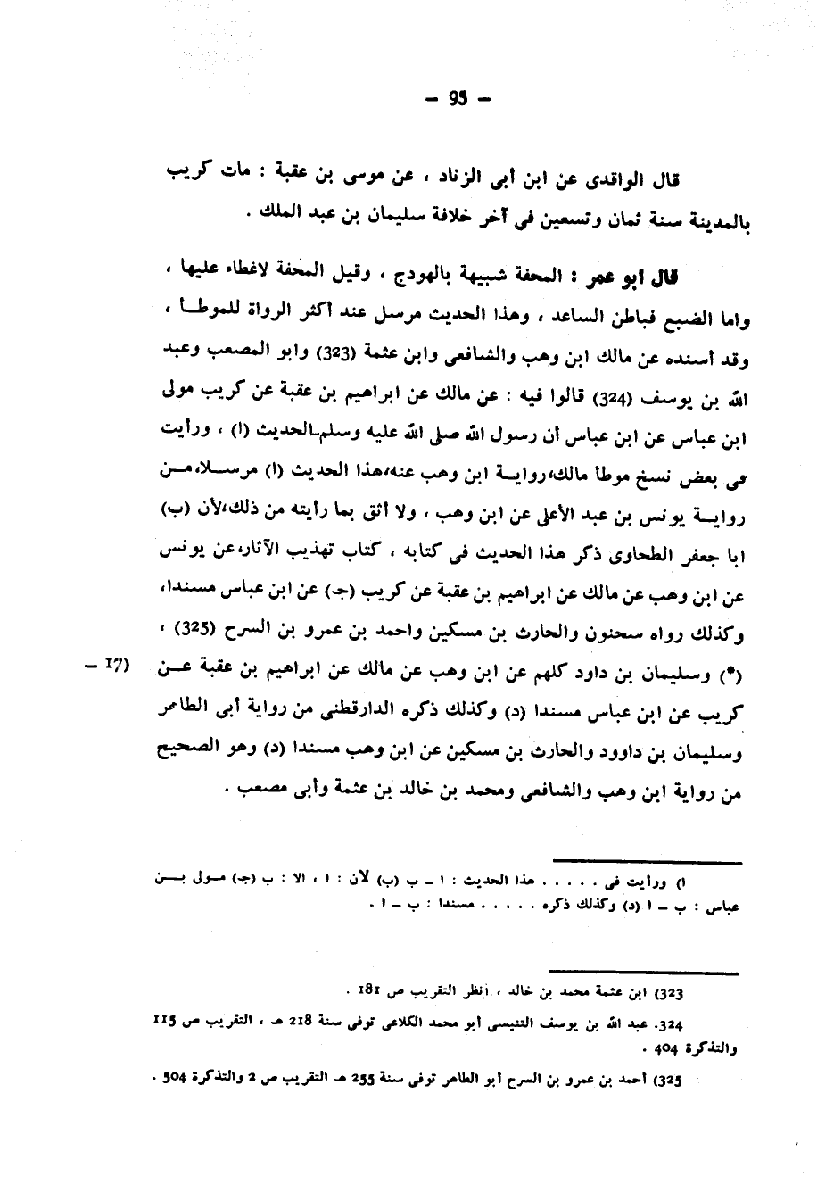 قَالَ الْوَاقِدِيُّ عَنِ ابْنِ أَبِي الزِّنَادِ عَنْ مُوسَى بْنِ عُقْبَةَ مَاتَ كُرَيْبٌ بِالْمَدِينَةِ سَنَةَ ثَمَانٍ وَتِسْعِينَ فِي آخِرِ خِلَافَةِ سُلَيْمَانَ بْنِ عَبْدِ الْمَلِكِ قَالَ أَبُو عُمَرَ الْمِحَفَّةُ شَبِيهَةٌ بالهودج وقيل المحفه لاغطاء عليها واما الضُّبْعُ فَبَاطِنُ السَّاعِدِ وَهَذَا الْحَدِيثُ مُرْسَلٌ عِنْدَ أَكْثَرِ الرُّوَاةِ لِلْمُوَطَّأِ وَقَدْ أَسْنَدَهُ عَنْ مَالِكٍ ابْنُ وَهْبٍ وَالشَّافِعِيُّ وَابْنُ عَثْمَةَ وَأَبُو الْمُصْعَبِ وَعَبْدُ اللَّهِ بْنُ يُوسُفَ قَالُوا فِيهِ عَنْ مَالِكٍ عَنْ إِبْرَاهِيمَ عَنْ عُقْبَةَ عَنْ كُرَيْبٍ مَوْلَى ابْنِ عَبَّاسٍ عَنِ ابْنِ عَبَّاسٍ أَنَّ رَسُولَ صَلَّى اللَّهُ عَلَيْهِ وَسَلَّمَ الْحَدِيثَ وَرَأَيْتُ فِي بَعْضِ نُسَخِ مُوَطَّأِ مَالِكٍ رِوَايَةَ ابْنِ وَهْبٍ عَنْهُ هَذَا الْحَدِيثَ مُرْسَلًا مِنْ رِوَايَةِ يُونُسَ بْنِ عَبْدِ الْأَعْلَى عَنِ ابْنِ وَهْبٍ وَلَا أَثِقُ بِمَا رَأَيْتُهُ مِنْ ذَلِكَ لِأَنَّ أَبَا جَعْفَرٍ الطَّحَاوِيَّ ذَكَرَ هَذَا الْحَدِيثَ فِي كِتَابِهِ كِتَابُ تَهْذِيبِ الْآثَارِ عَنْ يُونُسَ عَنِ ابن وهب عن مالك عَنْ إِبْرَاهِيمَ بْنِ عُقْبَةَ عَنْ كُرَيْبٍ عَنْ بن عَبَّاسٍ مُسْنَدًا وَكَذَلِكَ رَوَاهُ سَحْنُونٌ وَالْحَارِثُ بْنُ مِسْكِينٍ وَأَحْمَدُ بْنُ عَمْرِو بْنِ السَّرْحِ (*) وَسُلَيْمَانُ بْنُ دَاوُدَ كُلُّهُمْ عَنِ ابْنِ وَهْبٍ عَنْ مالك عَنْ إِبْرَاهِيمَ بْنِ عُقْبَةَ عَنْ كُرَيْبٍ عَنِ ابْنِ عَبَّاسٍ مُسْنَدًا وَكَذَلِكَ ذَكَرَهُ الدَّارَقُطْنِيُّ من رواية أبى الطاهر وسليمان بن داوود وَالْحَارِثِ بْنِ مِسْكِينٍ عَنِ ابْنِ وَهْبٍ مُسْنَدًا وَهُوَ الصَّحِيحُ مِنْ رِوَايَةِ ابْنِ وَهْبٍ وَالشَّافِعِيِّ وَمُحَمَّدِ بْنِ خَالِدِ بْنِ عَثْمَةَ وَأَبِي مُصْعَبٍ