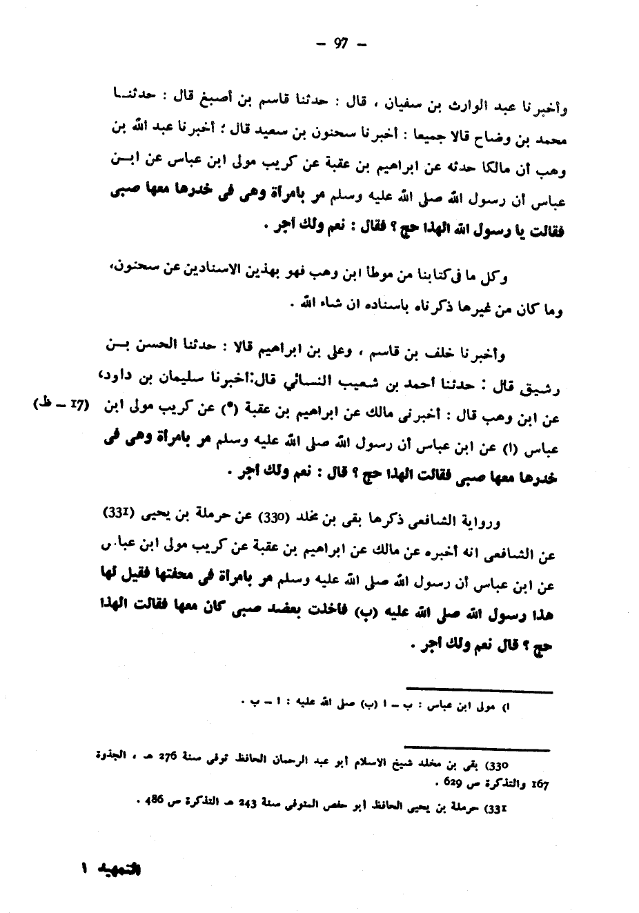 وَأَخْبَرَنَا عَبْدُ الْوَارِثِ بْنُ سُفْيَانَ قَالَ حَدَّثَنَا قَاسِمُ بْنُ أَصْبَغَ قَالَ حَدَّثَنَا مُحَمَّدُ بْنُ وَضَّاحٍ قَالَا جَمِيعًا أَخْبَرَنَا سَحْنُونُ بْنُ سَعِيدٍ قَالَ أَخْبَرَنَا عَبْدُ اللَّهِ بْنُ وَهْبٍ أَنَّ مَالِكًا حَدَّثَهُ عَنْ إِبْرَاهِيمَ بْنِ عُقْبَةَ عَنْ كُرَيْبٍ مَوْلَى ابْنِ عَبَّاسٍ عَنِ ابْنِ عَبَّاسٍ أَنَّ رَسُولَ اللَّهِ صَلَّى اللَّهُ عَلَيْهِ وسلم مَرَّ بِامْرَأَةٍ وَهِيَ فِي خِدْرِهَا مَعَهَا صَبِيٌّ فقالت يارسول اللَّهِ أَلِهَذَا حَجٌّ فَقَالَ نَعَمْ وَلَكِ أَجْرٌ وكل مافي كِتَابِنَا مِنْ مُوَطَّأِ ابْنِ وَهْبٍ فَهُوَ بِهَذَيْنِ الْإِسْنَادَيْنِ عَنْ سَحْنُونٍ وَمَا كَانَ مِنْ غَيْرِهَا ذَكَرْنَاهُ بِإِسْنَادِهِ إِنْ شَاءَ اللَّهُ وَأَخْبَرَنَا خَلَفُ بْنُ الْقَاسِمِ وَعَلِيُّ بْنُ إِبْرَاهِيمَ قالاحدثنا الْحَسَنُ بْنُ رَشِيقٍ قَالَ حَدَّثَنَا أَحْمَدُ بْنُ شُعَيْبٍ النَّسَائِيُّ قَالَ أَخْبَرَنَا سُلَيْمَانُ بْنُ دَاوُدَ عَنِ ابْنِ وَهْبٍ قَالَ أَخْبَرَنِي مَالِكٌ عَنْ إِبْرَاهِيمَ بْنِ عُقْبَةَ عَنْ كُرَيْبٍ مَوْلَى ابْنِ عَبَّاسٍ عَنِ ابْنِ عَبَّاسٍ أَنَّ رَسُولَ اللَّهِ صَلَّى اللَّهُ عَلَيْهِ سلم مَرَّ بِامْرَأَةٍ وَهِيَ فِي خِدْرِهَا مَعَهَا صَبِيٌّ فَقَالَتْ أَلِهَذَا حَجٌّ قَالَ نَعَمْ وَلَكِ أَجْرٌ وَرِوَايَةُ الشَّافِعِيِّ ذَكَرَهَا بَقِيُّ بْنُ مَخْلَدٍ عَنْ حَرْمَلَةَ بْنِ يَحْيَى عَنِ الشَّافِعِيِّ أَنَّهُ أَخْبَرَهُ عَنْ مَالِكٍ عَنْ إِبْرَاهِيمَ بْنِ عُقْبَةَ عَنْ كُرَيْبٍ مَوْلَى ابْنِ عَبَّاسٍ عَنِ ابْنِ عَبَّاسٍ أَنَّ رَسُولَ اللَّهِ صَلَّى اللَّهُ عَلَيْهِ وسلم مَرَّ بِامْرَأَةٍ فِي مِحَفَّتِهَا فَقِيلَ لَهَا هَذَا رَسُولُ اللَّهِ صَلَّى اللَّهُ عَلَيْهِ فَأَخَذَتْ بِعَضُدِ صَبِيٍّ كَانَ مَعَهَا فَقَالَتْ أَلِهَذَا حَجٌّ قَالَ نَعَمْ وَلَكِ أَجْرٌ