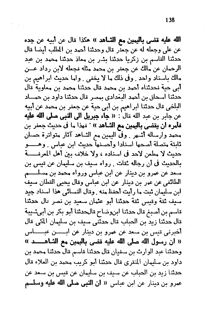 اللَّهُ عَلَيْهِ وَسَلَّمَ قَضَى بِالْيَمِينِ مَعَ الشَّاهِدِ هَكَذَا قَالَ عَنْ أَبِيهِ عَنْ جَدِّهِ عَنْ عَلِيٍّ وَجَعَلَهُ لَهُ عَنْ جَعْفَرٍ قَالَ وَحَدَّثَنَا أَحْمَدُ بْنُ الْمُطَّلِبِ أَيْضًا قَالَ حَدَّثَنَا الْقَاسِمُ بْنُ زَكَرِيَّا حَدَّثَنَا بِشْرُ بْنُ مُعَاذٍ حَدَّثَنَا محمد بن عبد الرحمان عَنْ مَالِكٍ عَنْ جَعْفَرِ بْنِ مُحَمَّدٍ مِثْلَهُ فَجَعَلَهُ لِابْنِ رَدَّادٍ عَنْ مَالِكٍ بِإِسْنَادٍ وَاحِدٍ وَفِي ذَلِكَ مَا لَا يَخْفَى وَأَمَّا حَدِيثُ إِبْرَاهِيمَ بْنِ أَبِي حَيَّةَ فَحَدَّثَنَاهُ أَحْمَدُ بْنُ مُحَمَّدٍ قَالَ حَدَّثَنَا مُحَمَّدُ بْنُ مُعَاوِيَةَ قَالَ حَدَّثَنَا إِسْحَاقُ بْنُ أَحْمَدَ الْبَغْدَادِيُّ بِمِصْرَ قَالَ حَدَّثَنَا دَاوُدُ بْنُ حَمَّادٍ الْبَلْخِيُّ قَالَ حَدَّثَنَا إِبْرَاهِيمُ بْنُ أَبِي حَيَّةَ عَنْ جَعْفَرِ بْنِ مُحَمَّدٍ عَنْ أَبِيهِ عَنْ جَابِرِ بْنِ عَبْدِ اللَّهِ قَالَ جَاءَ جِبْرِيلُ إِلَى النَّبِيِّ صَلَّى اللَّهُ عَلَيْهِ وَسَلَّمَ فَأَمَرَهُ أَنْ يَقْضِيَ بِالْيَمِينِ مَعَ الشَّاهِدِ فَهَذَا مَا فِي حَدِيثِ جَعْفَرِ بْنِ مُحَمَّدٍ وَإِرْسَالُهُ أَشْهَرُ وَفِي الْيَمِينِ مَعَ الشَّاهِدِ آثَارٌ مُتَوَاتِرَةٌ حِسَانٌ ثَابِتَةٌ مُتَّصِلَةٌ أَصَحُّهَا إِسْنَادًا وَأَحْسَنُهَا حَدِيثُ ابْنِ عَبَّاسٍ وَهُوَ حَدِيثٌ لامطعن لِأَحَدٍ فِي إِسْنَادِهِ وَلَا خِلَافَ بَيْنِ أَهْلِ الْمَعْرِفَةِ بِالْحَدِيثِ فِي أَنَّ رِجَالَهُ ثِقَاتٌ رَوَاهُ سيف بن سليمان عن قيس بْنُ سَعْدٍ عَنْ عَمْرِو بْنِ دِينَارٍ عَنِ ابْنِ عَبَّاسٍ ورواه محمد بن مسلم الطائفي عن عمر بْنِ دِينَارٍ عَنِ ابْنِ عَبَّاسٍ وَقَالَ يَحْيَى القطان سيف ابن سُلَيْمَانَ ثَبْتٌ مَا رَأَيْتُ أَحْفَظَ مِنْهُ وَقَالَ النَّسَائِيُّ هَذَا إِسْنَادٌ جَيِّدٌ سَيْفٌ ثِقَةٌ وَقَيْسٌ ثِقَةٌ حَدَّثَنَا أَبُو عُثْمَانَ سَعِيدُ بْنُ نَصْرٍ قَالَ حَدَّثَنَا قَاسِمُ بْنُ أَصْبَغَ قَالَ حَدَّثَنَا ابْنُ وَضَّاحٍ قَالَ حَدَّثَنَا أَبُو بَكْرِ بْنُ أَبِي شَيْبَةَ قَالَ حَدَّثَنَا زَيْدُ بْنُ الْحُبَابِ قَالَ حَدَّثَنِي سَيْفُ بْنُ سُلَيْمَانَ الْمَكِّيُّ قَالَ أَخْبَرَنِي قَيْسُ بْنُ سَعْدٍ عَنْ عَمْرِو بْنِ دِينَارٍ عَنِ ابْنِ عَبَّاسٍ أَنَّ رَسُولَ اللَّهِ صَلَّى اللَّهُ عَلَيْهِ وَسَلَّمَ قَضَى بِالْيَمِينِ مَعَ الشَّاهِدِ وَحَدَّثَنَا عَبْدُ الْوَارِثِ بْنُ سُفْيَانَ قَالَ حَدَّثَنَا قَاسِمٌ قَالَ حَدَّثَنَا مُحَمَّدُ بْنُ دَاوُدَ بْنِ سُلَيْمَانَ الْمِنْقَرِيُّ قَالَ حَدَّثَنَا أَبُو كُرَيْبٍ مُحَمَّدُ بْنُ الْعَلَاءِ قَالَ حَدَّثَنَا زَيْدُ بْنُ الْحُبَابِ عَنْ سَيْفِ بْنِ سُلَيْمَانَ عَنْ قَيْسِ بْنُ سَعْدٍ عَنْ عَمْرِو بْنِ دِينَارٍ عَنِ ابْنِ عَبَّاسٍ أَنَّ النَّبِيَّ صَلَّى اللَّهُ عَلَيْهِ وَسَلَّمَ