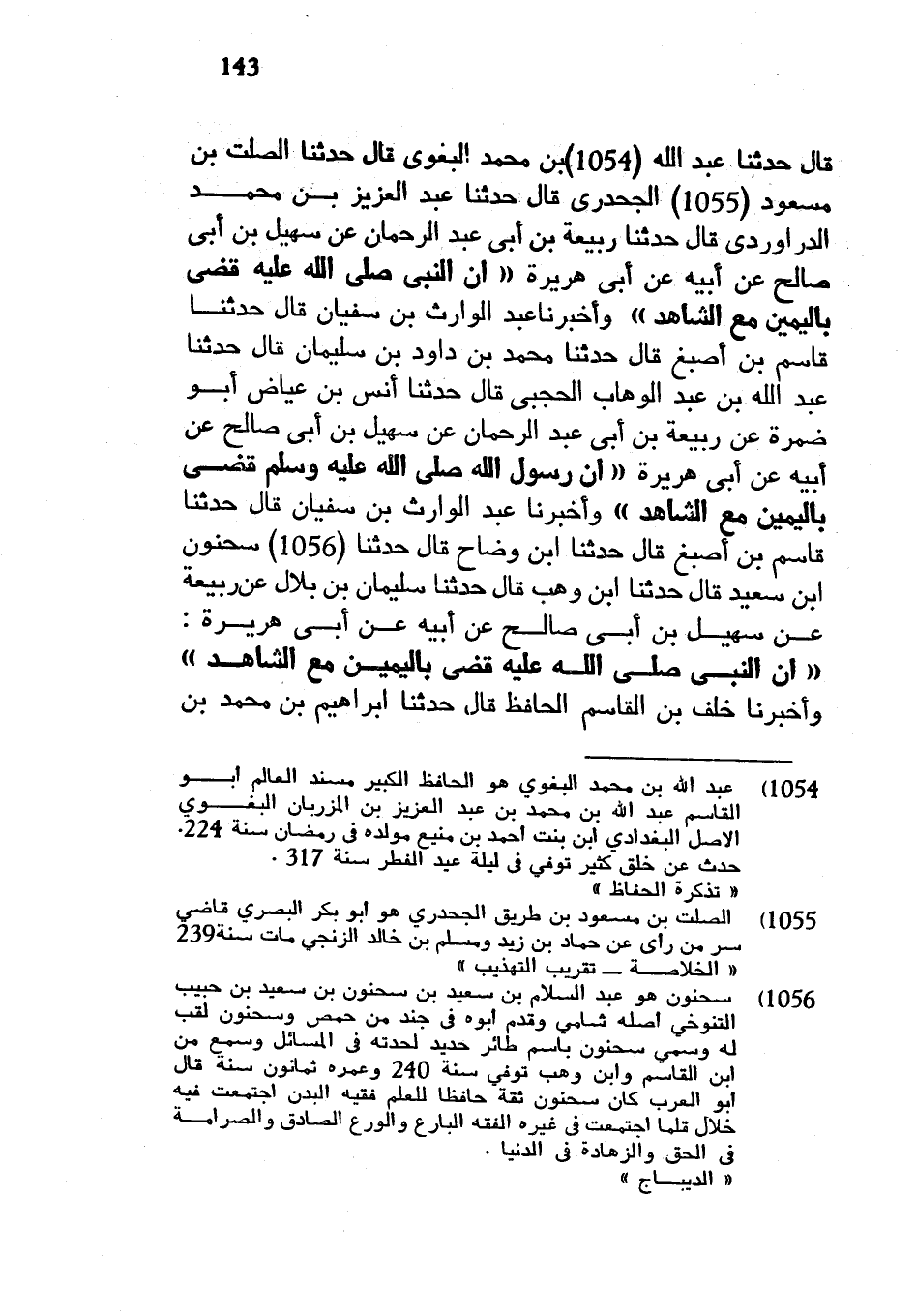 قَالَ حَدَّثَنَا عَبْدُ اللَّهِ بْنُ مُحَمَّدٍ الْبَغَوِيُّ قَالَ حَدَّثَنَا الصَّلْتُ بْنُ مَسْعُودٍ الْجَحْدَرِيُّ قَالَ حَدَّثَنَا عَبْدُ الْعَزِيزِ بْنُ مُحَمَّدٍ الدَّرَاوَرْدِيُّ قَالَ حدثنا ربيعة بن أبي عبد الرحمان عَنْ سُهَيْلِ بْنِ أَبِي صَالِحٍ عَنْ أَبِيهِ عَنْ أَبِي هُرَيْرَةَ أَنَّ النَّبِيَّ صَلَّى اللَّهُ عَلَيْهِ وَسَلَّمَ قَضَى بِالْيَمِينِ مَعَ الشَّاهِدِ وَأَخْبَرَنَا عَبْدُ الْوَارِثِ بْنُ سُفْيَانَ قَالَ حَدَّثَنَا قَاسِمُ بْنُ أَصْبَغَ قَالَ حَدَّثَنَا مُحَمَّدُ بْنُ دَاوُدَ بْنِ سُلَيْمَانَ قَالَ حَدَّثَنَا عَبْدُ اللَّهِ بْنُ عَبْدِ الْوَهَّابِ الْحَجَبِيُّ قَالَ حَدَّثَنَا أَنَسُ بْنُ عِيَاضٍ أَبُو ضَمْرَةَ عَنْ رَبِيعَةَ بْنِ أَبِي عبد الرحمان عَنْ سُهَيْلِ بْنِ أَبِي صَالِحٍ عَنْ أَبِيهِ عَنْ أَبِي هُرَيْرَةَ أَنَّ رَسُولَ اللَّهِ صَلَّى اللَّهُ عَلَيْهِ وَسَلَّمَ قَضَى بِالْيَمِينِ مَعَ الشَّاهِدِ وَأَخْبَرَنَا عَبْدُ الْوَارِثِ بْنُ سُفْيَانَ قَالَ حَدَّثَنَا قَاسِمُ بْنُ أَصْبَغَ قَالَ حَدَّثَنَا ابْنُ وَضَّاحٍ قال حدثنا سحنون ابن سَعِيدٍ قَالَ حَدَّثَنَا ابْنُ وَهْبٍ قَالَ حَدَّثَنَا سُلَيْمَانُ بْنُ بِلَالٍ عَنْ رَبِيعَةَ عَنْ سُهَيْلِ بْنِ أَبِي صَالِحٍ عَنْ أَبِيهِ عَنْ أَبِي هُرَيْرَةَ أَنَّ النَّبِيَّ صَلَّى اللَّهُ عَلَيْهِ وَسَلَّمَ قَضَى بِالْيَمِينِ مَعَ الشَّاهِدِ وَأَخْبَرَنَا خَلَفُ بْنُ الْقَاسِمِ الْحَافِظُ قَالَ حَدَّثَنَا إِبْرَاهِيمُ بْنُ مُحَمَّدِ بْنِ