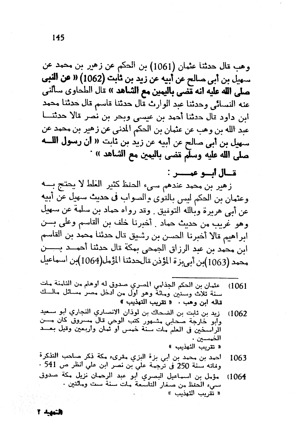 وَهْبٍ قَالَ حَدَّثَنَا عُثْمَانُ بْنُ الْحَكَمِ عَنْ زهير بن محمد عَنْ سُهَيْلِ بْنِ أَبِي صَالِحٍ عَنْ أَبِيهِ عَنْ زَيْدِ بْنِ ثَابِتٍ عَنِ النَّبِيِّ صَلَّى اللَّهُ عَلَيْهِ وَسَلَّمَ أَنَّهُ قَضَى بِالْيَمِينِ مَعَ الشَّاهِدِ قَالَ الطَّحَاوِيُّ سَأَلَنِي عَنْهُ النَّسَائِيُّ وَحَدَّثَنَا عَبْدُ الْوَارِثِ قَالَ حَدَّثَنَا قَاسِمٌ قَالَ حدثنا محمد ابْنُ دَاوُدَ قَالَ حَدَّثَنَا أَحْمَدُ بْنُ عِيسَى وَبَحْرُ بْنُ نَصْرٍ قَالَا حَدَّثَنَا عَبْدُ اللَّهِ بْنُ وَهْبٍ عَنْ عُثْمَانَ بْنِ الْحَكَمِ الْمَدَنِيِّ عَنْ زُهَيْرِ بْنِ مُحَمَّدٍ عَنْ سُهَيْلِ بْنِ أَبِي صَالِحٍ عَنْ أَبِيهِ عَنْ زَيْدِ بْنِ ثَابِتٍ أَنَّ رَسُولَ اللَّهِ صَلَّى الله عليه وَسَلَّمَ قَضَى بِالْيَمِينِ مَعَ الشَّاهِدِ قَالَ أَبُو عمر زهير بن محمد عندهم سيء الْحِفْظِ كَثِيرُ الْغَلَطِ لَا يُحْتَجُّ بِهِ وَعُثْمَانُ بْنُ الْحَكَمِ لَيْسَ بِالْقَوِيِّ وَالصَّوَابُ فِي حَدِيثِ سُهَيْلٍ عَنْ أَبِيهِ عَنْ أَبِي هُرَيْرَةَ وَبِاللَّهِ التَّوْفِيقُ وَقَدْ رَوَاهُ حَمَّادُ بْنُ سَلَمَةَ عَنْ سُهَيْلٍ وَهُوَ غَرِيبٌ مِنْ حَدِيثِ حَمَّادٍ أَخْبَرَنَا خَلَفُ بْنُ الْقَاسِمِ وَعَلِيُّ بْنُ إِبْرَاهِيمَ قَالَا أَخْبَرَنَا الْحَسَنُ بْنُ رَشِيقٍ قَالَ حَدَّثَنَا مُحَمَّدُ بن القاسم ابن مُحَمَّدِ بْنِ عَبْدِ الرَّزَّاقِ الْجُمَحِيُّ بِمَكَّةَ قَالَ حَدَّثَنَا أَحْمَدُ بْنُ مُحَمَّدِ بْنِ أَبِي بَزَّةَ الْمُؤَذِّنُ قَالَ حَدَّثَنَا الْمُؤَمَّلُ بْنُ إِسْمَاعِيلَ