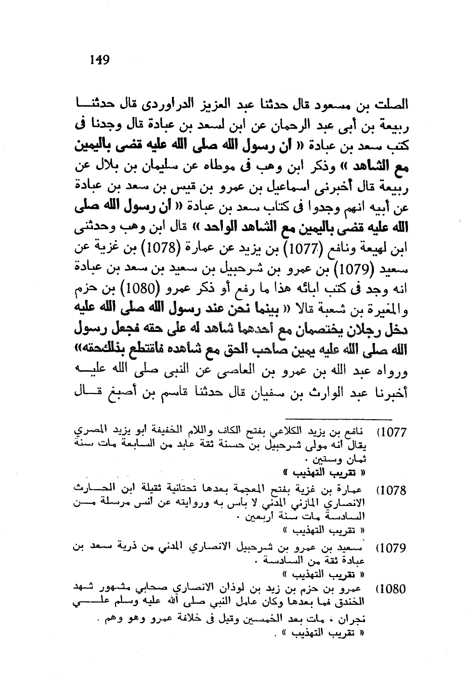 الصَّلْتُ بْنُ مَسْعُودٍ قَالَ حَدَّثَنَا عَبْدُ الْعَزِيزِ الدَّرَاوَرْدِيُّ قَالَ حَدَّثَنَا رَبِيعَةُ بْنُ أَبِي عَبْدِ الرحمان عَنِ ابْنٍ لِسَعْدِ بْنِ عُبَادَةَ قَالَ وَجَدْنَا فِي كُتُبِ سَعْدِ بْنِ عُبَادَةَ أَنَّ رَسُولَ اللَّهِ صَلَّى اللَّهُ عَلَيْهِ وَسَلَّمَ قَضَى بِالْيَمِينِ مع الشاهد وذكر ابن وهب في موطاه عَنْ سُلَيْمَانَ بْنِ بِلَالٍ عَنْ رَبِيعَةَ قَالَ أَخْبَرَنِي إِسْمَاعِيلُ بْنُ عَمْرِو بْنِ قَيْسِ بْنِ سعد بن عبادة عن أبيه أنه وَجَدُوا فِي كِتَابِ سَعْدِ بْنِ عُبَادَةَ أَنَّ رَسُولَ اللَّهِ صَلَّى اللَّهُ عَلَيْهِ وَسَلَّمَ قَضَى بِالْيَمِينِ مَعَ الشَّاهِدِ الْوَاحِدِ قَالَ ابْنُ وَهْبٍ وَحَدَّثَنِي ابْنُ لَهِيعَةَ وَنَافِعُ بْنُ يَزِيدَ عَنْ عُمَارَةَ بْنِ غَزِيَّةَ عَنْ سَعِيدِ بْنِ عَمْرِو بْنِ شُرَحْبِيلَ بْنِ سَعِيدِ بن سعد بن عُبَادَةَ أَنَّهُ وَجَدَ فِي كُتُبِ آبَائِهِ هَذَا مَا رَفَعَ أَوْ ذَكَرَ عَمْرُو 01080) بْنُ حَزْمٍ وَالْمُغِيرَةُ بْنُ شُعْبَةَ قَالَا بَيْنَمَا نَحْنُ عِنْدَ رَسُولِ اللَّهِ صَلَّى اللَّهُ عَلَيْهِ وَسَلَّمَ دخل رَجُلَانِ يَخْتَصِمَانِ مَعَ أَحَدِهِمَا شَاهِدٌ لَهُ عَلَى حَقِّهِ فَجَعَلَ رَسُولُ اللَّهِ صَلَّى اللَّهُ عَلَيْهِ وَسَلَّمَ يَمِينَ صَاحِبِ الْحَقِّ مَعَ شَاهِدِهِ فَاقْتَطَعَ بِذَلِكَ حَقَّهُ وَرَوَاهُ عَبْدُ اللَّهِ بْنُ عَمْرِو بْنِ الْعَاصِي عَنِ النَّبِيِّ صَلَّى اللَّهُ عَلَيْهِ وَسَلَّمَ أَخْبَرَنَا عَبْدُ الوارث بن سفيان قال حدثنا قاسم بْنُ أَصْبَغَ قَالَ