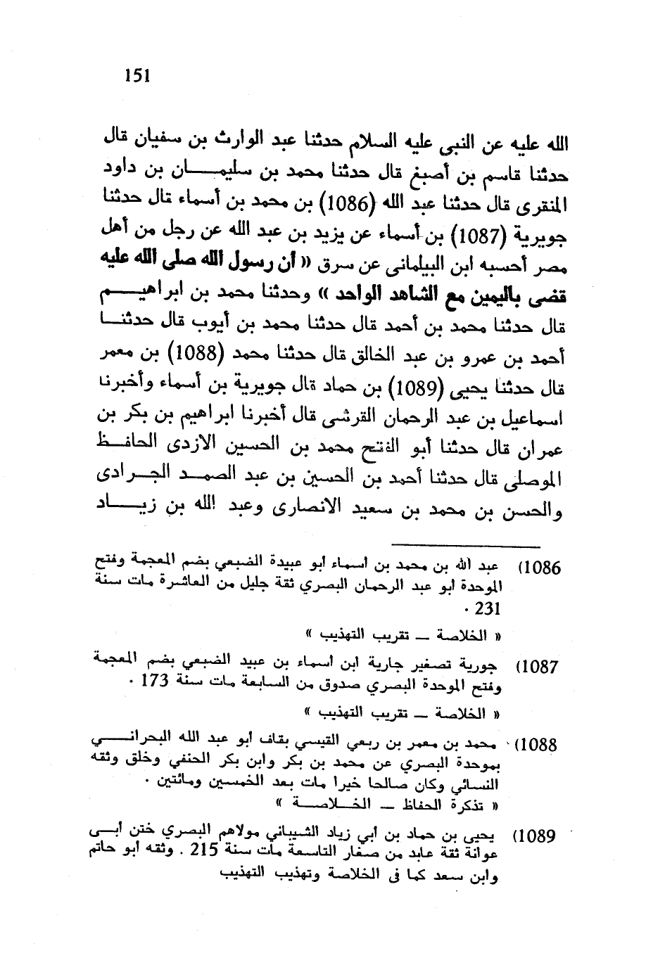 اللَّهُ عَلَيْهِ وَسَلَّمَ عَنِ النَّبِيِّ عَلَيْهِ السَّلَامُ حَدَّثَنَا عَبْدُ الْوَارِثِ بْنُ سُفْيَانَ قَالَ حَدَّثَنَا قَاسِمُ بْنُ أَصْبَغَ قَالَ حَدَّثَنَا مُحَمَّدُ بْنُ سُلَيْمَانَ بْنِ دَاوُدَ الْمِنْقَرِيُّ قَالَ حَدَّثَنَا عَبْدُ اللَّهِ بْنُ مُحَمَّدِ بْنِ أَسْمَاءَ قَالَ حَدَّثَنَا جُوَيْرِيَةُ بْنُ أَسْمَاءَ عَنْ يَزِيدَ بْنِ عَبْدِ اللَّهِ عَنْ رَجُلٍ مِنْ أَهْلِ مِصْرَ أَحْسَبُهُ ابْنَ الْبَيْلَمَانِيِّ عَنْ سُرَّقٍ أَنَّ رَسُولَ اللَّهِ صَلَّى اللَّهُ عَلَيْهِ وَسَلَّمَ قَضَى بِالْيَمِينِ مَعَ الشَّاهِدِ الْوَاحِدِ وَحَدَّثَنَا مُحَمَّدُ بْنُ إِبْرَاهِيمَ قَالَ حَدَّثَنَا مُحَمَّدُ بْنُ أَحْمَدَ قَالَ حَدَّثَنَا مُحَمَّدُ بْنُ أَيُّوبَ قَالَ حَدَّثَنَا أَحْمَدُ بْنُ عَمْرِو بْنِ عَبْدِ الْخَالِقِ قَالَ حَدَّثَنَا مُحَمَّدُ بْنُ مَعْمَرٍ قَالَ حَدَّثَنَا يَحْيَى بْنُ حَمَّادٍ قَالَ جُوَيْرِيَةُ بْنُ أَسْمَاءَ وَأَخْبَرَنَا إِسْمَاعِيلُ بْنُ عَبْدِ الرحمان الْقُرَشِيُّ قَالَ أَخْبَرَنَا إِبْرَاهِيمُ بْنُ بَكْرِ بْنِ عِمْرَانَ قَالَ حَدَّثَنَا أَبُو الْفَتْحِ مُحَمَّدُ بْنُ الْحُسَيْنِ الْأَزْدِيُّ الْحَافِظُ الْمَوْصِلِيُّ قَالَ حَدَّثَنَا أَحْمَدُ بْنُ الْحُسَيْنِ بْنِ عَبْدِ الصَّمَدِ الْجَرَادِيُّ وَالْحَسَنُ بْنُ مُحَمَّدِ بْنِ سَعِيدٍ الْأَنْصَارِيُّ وَعَبْدُ اللَّهِ بن زياد
