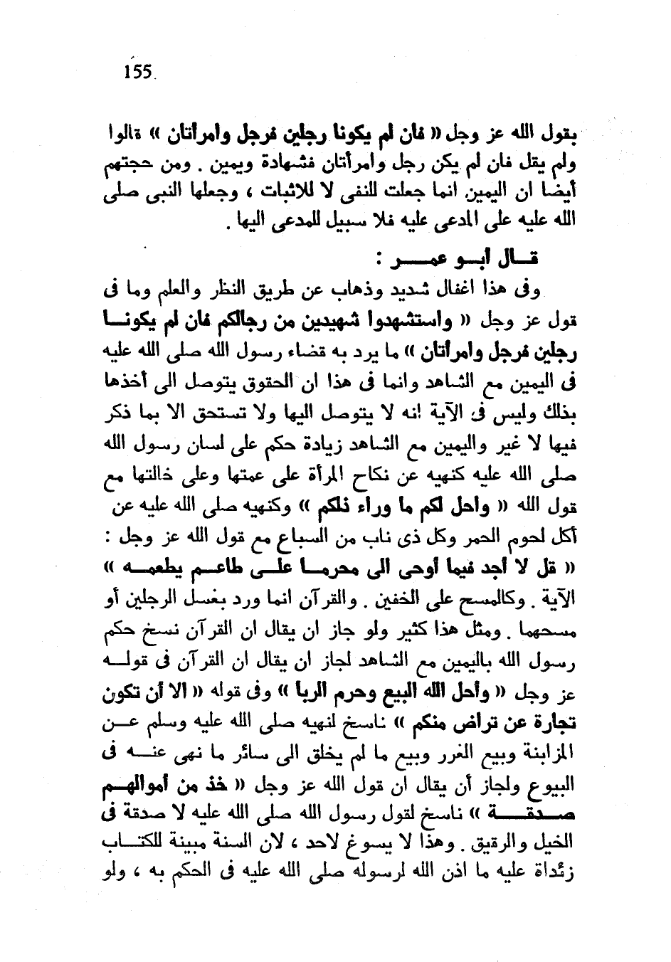 بِقَوْلِ اللَّهِ عَزَّ وَجَلَّ فَإِنْ لَمْ يَكُونَا رَجُلَيْنِ فَرَجُلٌ وَامْرَأَتَانِ قَالُوا وَلَمْ يَقُلْ فَإِنْ لَمْ يَكُنْ رَجُلٌ وَامْرَأَتَانِ فَشَهَادَةٌ وَيَمِينٌ وَمِنْ حُجَّتِهِمْ أَيْضًا أَنَّ الْيَمِينَ إِنَّمَا جُعِلَتْ لِلنَّفْيِ لَا لِلْإِثْبَاتِ وَجَعَلَهَا النَّبِيُّ صَلَّى اللَّهُ عَلَيْهِ وَسَلَّمَ عَلَى الْمُدَّعَى عَلَيْهِ فَلَا سَبِيلَ لِلْمُدَّعِي إِلَيْهَا قَالَ أَبُو عُمَرَ وَفِي هَذَا إِغْفَالٌ شَدِيدٌ وَذَهَابٌ عَنْ طَرِيقِ النَّظَرِ وَالْعِلْمِ وَمَا في قول عَزَّ وَجَلَّ وَاسْتَشْهِدُوا شَهِيدَيْنِ مِنْ رِجَالِكُمْ فَإِنْ لَمْ يَكُونَا رَجُلَيْنِ فَرَجُلٌ وَامْرَأَتَانِ مَا يُرَدُّ بِهِ قَضَاءُ رَسُولِ اللَّهِ صَلَّى اللَّهُ عَلَيْهِ وَسَلَّمَ فِي الْيَمِينِ مَعَ الشَّاهِدِ وَإِنَّمَا فِي هَذَا أَنَّ الْحُقُوقَ يُتَوَصَّلُ إِلَى أَخْذِهَا بِذَلِكَ وَلَيْسَ فِي الْآيَةِ أَنَّهُ لَا يُتَوَصَّلُ إِلَيْهَا وَلَا تُسْتَحَقُّ إِلَّا بِمَا ذُكِرَ فِيهَا لَا غَيْرَ وَالْيَمِينُ مَعَ الشَّاهِدِ زِيَادَةُ حُكْمٍ عَلَى لِسَانِ رَسُولِ اللَّهِ صَلَّى اللَّهُ عَلَيْهِ وَسَلَّمَ كَنَهْيِهِ عَنْ نِكَاحِ الْمَرْأَةِ عَلَى عَمَّتِهَا وَعَلَى خَالَتِهَا مَعَ قَوْلِ اللَّهِ وَأُحِلَّ لَكُمْ مَا وَرَاءَ ذَلِكُمْ وَكَنَهْيِهِ صَلَّى اللَّهُ عَلَيْهِ وَسَلَّمَ عَنْ أَكْلِ لُحُومِ الْحُمُرِ وَكُلِّ ذِي نَابٍ من السباع مَعَ قَوْلِ اللَّهِ عَزَّ وَجَلَّ قُلْ لَا أَجِدُ فيما أُوحِيَ إِلَيَّ مُحَرَّمًا عَلَى طَاعِمٍ يَطْعَمُهُ الْآيَةَ وَكَالْمَسْحِ عَلَى الْخُفَّيْنِ وَالْقُرْآنُ إِنَّمَا وَرَدَ بِغَسْلِ الرِّجْلَيْنِ أَوْ مَسْحِهِمَا وَمِثْلُ هَذَا كَثِيرٌ وَلَوْ جَازَ أَنْ يُقَالَ إِنَّ الْقُرْآنَ نَسَخَ حُكْمَ رَسُولِ اللَّهِ بِالْيَمِينِ مَعَ الشَّاهِدِ لَجَازَ أَنْ يُقَالَ إِنَّ الْقُرْآنَ فِي قَوْلِهِ عَزَّ وَجَلَّ وَأَحَلَّ اللَّهُ الْبَيْعَ وَحَرَّمَ الرِّبَا وَفِي قَوْلِهِ إِلَّا أَنْ تَكُونَ تِجَارَةً عَنْ تَرَاضٍ مِنْكُمْ نَاسِخٌ لِنَهْيِهِ صَلَّى اللَّهُ عَلَيْهِ وَسَلَّمَ عَنِ الْمُزَابَنَةِ وَبَيْعِ الْغَرَرِ وَبَيْعِ مَا لَمْ يُخْلَقْ إِلَى سَائِرِ مَا نَهَى عَنْهُ فِي الْبُيُوعِ وَلَجَازَ أَنْ يُقَالَ إِنَّ قَوْلَ اللَّهِ عَزَّ وَجَلَّ خُذْ مِنْ أَمْوَالِهِمْ صَدَقَةً نَاسِخٌ لِقَوْلِ رَسُولِ اللَّهِ صَلَّى اللَّهُ عَلَيْهِ وَسَلَّمَ لا صَدَقَةَ فِي الْخَيْلِ وَالرَّقِيقِ وَهَذَا لَا يَسُوغُ لِأَحَدٍ لِأَنَّ السُّنَّةَ مُبَيِّنَةٌ لِلْكِتَابِ زَائِدَةٌ عَلَيْهِ مَا أَذِنَ اللَّهُ لِرَسُولِهِ صَلَّى اللَّهُ عَلَيْهِ وَسَلَّمَ فِي الْحُكْمِ بِهِ وَلَوْ