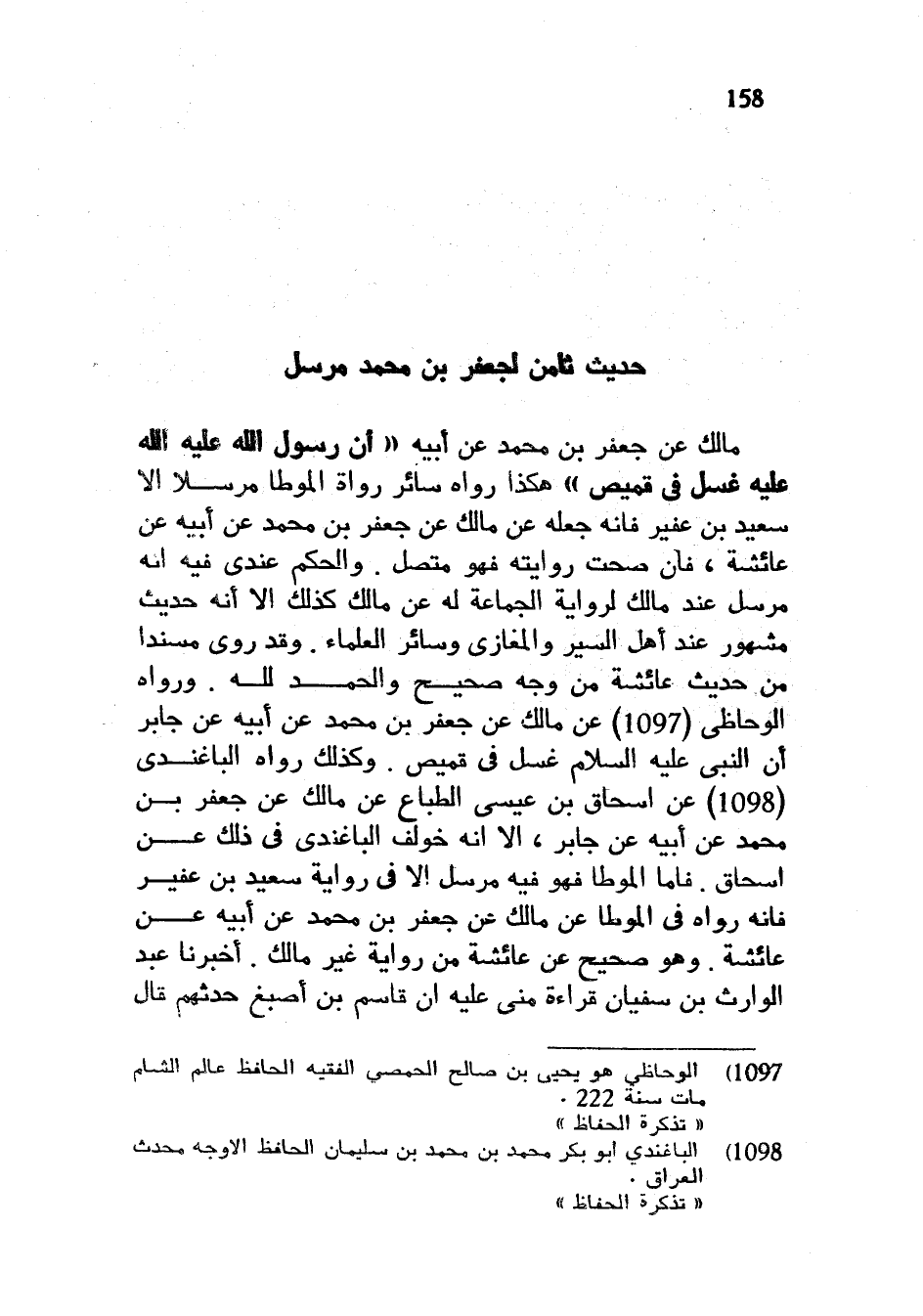 حَدِيثٌ ثَامِنٌ لِجَعْفَرِ بْنِ مُحَمَّدٍ مُرْسَلٌ مَالِكٌ عَنْ جَعْفَرِ بْنِ مُحَمَّدٍ عَنْ أَبِيهِ أَنَّ رَسُولِ اللَّهِ صَلَّى اللَّهُ عَلَيْهِ وَسَلَّمَ غُسِّلَ فِي قَمِيصٍ هَكَذَا رَوَاهُ سَائِرُ رُوَاةِ الْمُوَطَّأِ مُرْسَلًا إِلَّا سَعِيدَ بْنَ عُفَيْرٍ فَإِنَّهُ جَعَلَهُ عَنْ مَالِكٍ عَنْ جَعْفَرِ بْنِ مُحَمَّدٍ عَنْ أَبِيهِ عَنْ عَائِشَةَ فَإِنْ صَحَّتْ رِوَايَتُهُ فَهُوَ مُتَّصِلٌ وَالْحُكْمُ عِنْدِي فِيهِ أَنَّهُ مُرْسَلٌ عِنْدَ مَالِكٍ لِرِوَايَةِ الْجَمَاعَةِ لَهُ عَنْ مَالِكٍ كَذَلِكَ إِلَّا أَنَّهُ حَدِيثٌ مَشْهُورٌ عِنْدَ أَهْلِ السِّيَرِ وَالْمَغَازِي وَسَائِرِ الْعُلَمَاءِ وَقَدْ رُوِيَ مُسْنَدًا مِنْ حَدِيثِ عَائِشَةَ مِنْ وَجْهٍ صَحِيحٍ وَالْحَمْدُ لِلَّهِ وَرَوَاهُ الْوُحَاظِيُّ عَنْ مَالِكٍ عَنْ جَعْفَرِ بْنِ مُحَمَّدٍ عَنْ أَبِيهِ عَنْ جَابِرٍ أَنَّ النَّبِيَّ عَلَيْهِ السَّلَامُ غُسِّلَ فِي قَمِيصٍ وَكَذَلِكَ رَوَاهُ الْبَاغَنْدِيُّ عَنْ إِسْحَاقَ بْنِ عِيسَى الطَّبَّاعِ عَنْ مَالِكٌ عَنْ جَعْفَرِ بْنِ مُحَمَّدٍ عَنْ أَبِيهِ عَنْ جَابِرٍ إِلَّا أَنَّهُ خُولِفَ الْبَاغَنْدِيُّ فِي ذَلِكَ عَنْ إِسْحَاقَ فَأَمَّا الْمُوَطَّأُ فَهُوَ فِيهِ مُرْسَلٌ إِلَّا فِي رِوَايَةِ سَعِيدِ بْنِ عُفَيْرٍ فَإِنَّهُ رَوَاهُ فِي الْمُوَطَّأِ عَنْ مَالِكٍ عَنْ جَعْفَرِ بْنِ مُحَمَّدٍ عَنْ أَبِيهِ عَنْ عَائِشَةَ وَهُوَ صَحِيحٌ عَنْ عَائِشَةَ مِنْ رِوَايَةِ غَيْرِ مَالِكٍ أَخْبَرَنَا عَبْدُ الْوَارِثِ بْنُ سُفْيَانَ قِرَاءَةً مِنِّي عَلَيْهِ أَنَّ قَاسِمَ بْنَ أَصْبَغَ حَدَّثَهُمْ قَالَ