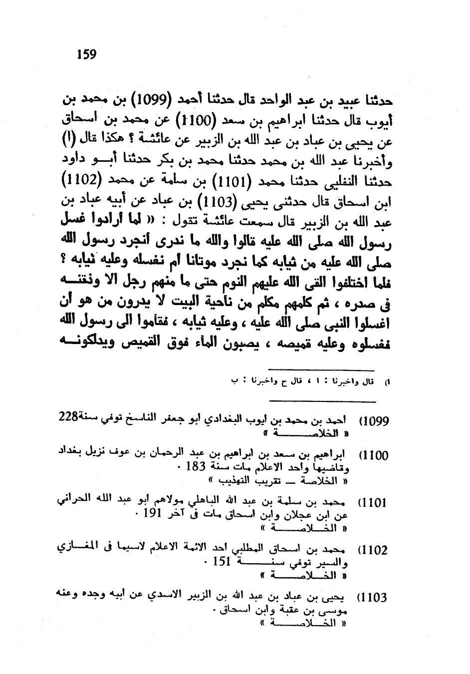 حَدَّثَنَا عُبَيْدُ بْنُ عَبْدِ الْوَاحِدِ قَالَ حَدَّثَنَا أَحْمَدُ بْنُ مُحَمَّدِ بْنِ أَيُّوبَ قَالَ حَدَّثَنَا إِبْرَاهِيمُ بْنُ سَعْدٍ عَنْ مُحَمَّدِ بْنِ إِسْحَاقَ عَنْ يَحْيَى بْنِ عَبَّادِ بْنِ عَبْدِ اللَّهِ بْنِ الزُّبَيْرِ عَنْ عَائِشَةَ هَكَذَا قَالَ وَأَخْبَرَنَا عَبْدُ اللَّهِ بْنُ مُحَمَّدٍ حَدَّثَنَا مُحَمَّدُ بْنُ بَكْرٍ حَدَّثَنَا أَبُو دَاوُدَ حَدَّثَنَا النُّفَيْلِيُّ حَدَّثَنَا مُحَمَّدُ بْنُ سَلَمَةَ عَنْ محمد ابن إِسْحَاقَ قَالَ حَدَّثَنِي يَحْيَى بْنُ عَبَّادٍ عَنْ أَبِيهِ عَبَّادِ بْنِ عَبْدِ اللَّهِ بْنِ الزُّبَيْرِ قال سمعت عائشة ونقول لَمَّا أَرَادُوا غُسْلَ رَسُولِ اللَّهِ صَلَّى اللَّهُ عَلَيْهِ وَسَلَّمَ قَالُوا وَاللَّهِ مَا نَدْرِي أَنُجَرِّدُ رسول الله صلى الله عليه وسلم من ثِيَابِهِ كَمَا نُجَرِّدُ مَوْتَانَا أَمْ نُغَسِّلُهُ وَعَلَيْهِ ثِيَابُهُ فَلَمَّا اخْتَلَفُوا أَلْقَى اللَّهُ عَلَيْهِمُ النُّوَّمَ حَتَّى مَا مِنْهُمْ رَجُلٌ إِلَّا وَذَقْنُهُ فِي صَدْرِهِ ثُمَّ كَلَّمَهُمْ مُكَلِّمٌ مِنْ نَاحِيَةِ الْبَيْتِ لَا يَدْرُونَ مَنْ هُوَ أَنِ اغْسِلُوا النَّبِيَّ صَلَّى اللَّهُ عَلَيْهِ وَسَلَّمَ وَعَلَيْهِ ثِيَابُهُ فَقَامُوا إِلَى رَسُولِ اللَّهِ فَغَسَّلُوهُ وَعَلَيْهِ قَمِيصُهُ يَصُبُّونَ الْمَاءَ فَوْقَ الْقَمِيصِ وَيُدَلِّكُونَهُ