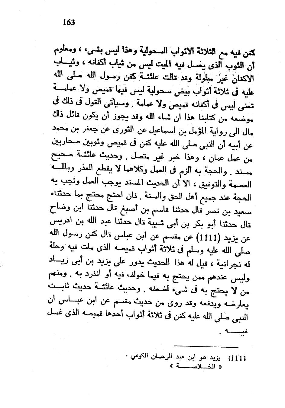 كُفِّنَ فِيهِ مَعَ الثَّلَاثَةِ الْأَثْوَابِ السُّحُولِيَّةِ وَهَذَا لَيْسَ بِشَيْءٍ وَمَعْلُومٌ أَنَّ الثَّوْبَ الَّذِي يُغَسَّلُ فِيهِ الْمَيِّتُ لَيْسَ مِنْ ثِيَابِ أَكْفَانِهِ وَثِيَابُ الْأَكْفَانِ غَيْرُ مَبْلُولَةٍ وَقَدْ قَالَتْ عَائِشَةُ كُفِّنَ رَسُولُ اللَّهِ صَلَّى اللَّهُ عَلَيْهِ وَسَلَّمَ فِي ثَلَاثَةِ أَثْوَابٍ بِيضٍ سُحُولِيَّةٍ لَيْسَ فِيهَا قَمِيصٌ وَلَا عِمَامَةٌ تَعْنِي لَيْسَ فِي أَكْفَانِهِ قَمِيصٌ وَلَا عِمَامَةٌ وَسَيَأْتِي الْقَوْلُ فِي ذَلِكَ فِي مَوْضِعِهِ مِنْ كِتَابِنَا هَذَا إِنْ شَاءَ اللَّهُ وَقَدْ يَجُوزُ أَنْ يَكُونَ قَائِلُ ذَلِكَ مَالَ إِلَى رِوَايَةِ الْمُؤَمَّلِ بْنِ إِسْمَاعِيلَ عَنِ الثَّوْرِيِّ عَنْ جَعْفَرِ بْنِ مُحَمَّدٍ عَنْ أَبِيهِ أَنَّ النَّبِيَّ صَلَّى اللَّهُ عَلَيْهِ وَسَلَّمَ كُفِّنَ فِي قَمِيصٍ وَثَوْبَيْنِ صَحَارِيَّيْنِ مِنْ عَمَلِ عَمَّانَ وَهَذَا خَبَرٌ غَيْرُ مُتَّصِلٍ وَحَدِيثُ عَائِشَةَ صَحِيحٌ مُسْنَدٌ وَالْحُجَّةُ بِهِ أَلْزَمُ فِي الْعَمَلِ وَكِلَاهُمَا لَا يَقْطَعُ الْعُذْرَ وَبِاللَّهِ الْعِصْمَةُ وَالتَّوْفِيقُ إِلَّا أَنَّ الْحَدِيثَ الْمُسْنَدَ يُوجِبُ الْعَمَلَ وَتَجِبُ بِهِ الْحُجَّةُ عند جَمِيعُ أَهْلِ الْحَقِّ وَالسُّنَّةِ فَإِنِ احْتَجَّ مُحْتَجٌّ بِمَا حَدَّثَنَاهُ سَعِيدُ بْنُ نَصْرٍ قَالَ حَدَّثَنَا قَاسِمُ بْنُ أَصْبَغَ قَالَ حَدَّثَنَا ابْنُ وَضَّاحٍ قَالَ حَدَّثَنَا أَبُو بَكْرِ بْنُ أَبِي شَيْبَةَ قَالَ حَدَّثَنَا عَبْدُ اللَّهِ بْنُ إِدْرِيسَ عَنْ يَزِيدَ عَنْ مِقْسَمٍ عَنِ ابْنِ عَبَّاسٍ قَالَ كُفِّنَ رَسُولُ اللَّهِ صَلَّى اللَّهُ عَلَيْهِ وَسَلَّمَ فِي ثَلَاثَةِ أَثْوَابٍ قَمِيصُهُ الَّذِي مَاتَ فِيهِ وَحُلَّةٌ لَهُ نَجْرَانِيَّةٌ قِيلَ لَهُ هَذَا الْحَدِيثُ يَدُورُ عَلَى يَزِيدَ بْنِ أَبِي زِيَادٍ وَلَيْسَ عِنْدَهُمْ مِمَّنْ يُحْتَجُّ بِهِ فِيمَا خُولِفَ فِيهِ أَوِ انْفَرَدَ بِهِ وَمِنْهُمْ مَنْ لَا يَحْتَجُّ بِهِ فِي شَيْءٍ لِضَعْفِهِ وَحَدِيثُ عَائِشَةَ حَدِيثٌ ثَابِتٌ يُعَارِضُهُ وَيَدْفَعُهُ وَقَدْ رُوِيَ مِنْ حَدِيثِ مِقْسَمٍ عَنِ ابْنِ عَبَّاسٍ أَنَّ النَّبِيَّ صَلَّى اللَّهُ عَلَيْهِ وَسَلَّمَ كُفِّنَ فِي ثَلَاثَةِ أَثْوَابٍ أَحَدُهَا قَمِيصُهُ الَّذِي غُسِّلَ فِيهِ