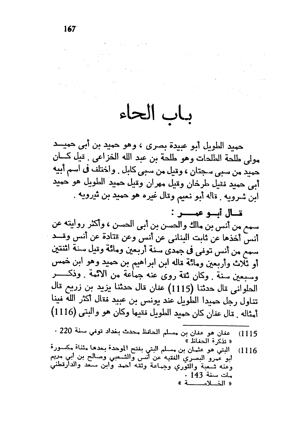 باب الحاء حُمَيْدٌ الطَّوِيلُ أَبُو عُبَيْدَةَ بَصْرِيٌّ وَهُوَ حُمَيْدُ بْنُ أَبِي حُمَيْدٍ مَوْلَى طَلْحَةَ الطَّلَحَاتِ وَهُوَ طَلْحَةُ بْنُ عَبْدِ اللَّهِ الْخُزَاعِيُّ قِيلَ كَانَ حُمَيْدٌ مِنْ سَبْيِ سَجْتَانَ وَقِيلَ مِنْ سَبْيِ كَابُلَ وَاخْتُلِفَ فِي اسْمِ أَبِيهِ أَبِي حُمَيْدٍ فَقِيلَ طَرْخَانُ وَقِيلَ مِهْرَانُ وَقِيلَ حُمَيْدٌ الطَّوِيلُ هو حميد ابن شرويه قال أَبُو نُعَيْمٍ وَقَالَ غَيْرُهُ هُوَ حُمَيْدُ بْنُ ثِيرَوَيْهِ قَالَ أَبُو عُمَرَ سَمِعَ مِنْ أَنَسِ بْنِ مَالِكٍ وَالْحَسَنِ بْنِ أَبِي الْحَسَنِ وَأَكْثَرُ رِوَايَتِهِ عَنْ أَنَسٍ أَخَذَهَا عَنْ ثَابِتٍ الْبُنَانِيِّ عَنْ أَنَسٍ وَعَنْ قَتَادَةَ عَنْ أَنَسٍ وَقَدْ سَمِعَ مِنْ أَنَسٍ تُوُفِّيَ فِي جُمَادَى سَنَةَ أَرْبَعِينَ وَمِائَةٍ وَقِيلَ سَنَةَ اثْنَتَيْنِ أَوْ ثَلَاثٍ وَأَرْبَعِينَ وَمِائَةٍ قَالَهُ ابْنُ إِبْرَاهِيمَ بْنِ حُمَيْدٍ وَهُوَ ابْنُ خَمْسٍ وَسَبْعِينَ سَنَةً وَكَانَ ثِقَةً رَوَى عَنْهُ جَمَاعَةٌ مِنَ الْأَئِمَّةِ وَذَكَرَ الْحُلْوَانِيُّ قَالَ حَدَّثَنَا عَفَّانُ قَالَ حَدَّثَنَا يَزِيدُ بْنُ زُرَيْعٍ قَالَ تَنَاوَلَ رَجُلٌ حُمَيْدًا الطَّوِيلَ عِنْدَ يُونُسَ بْنِ عُبَيْدٍ فَقَالَ أَكْثَرَ اللَّهُ فِينَا أَمْثَالَهُ قَالَ عَفَّانُ كَانَ حُمَيْدٌ الطَّوِيلُ فَقِيهًا وَكَانَ هُوَ وَالْبَتِّيُّ