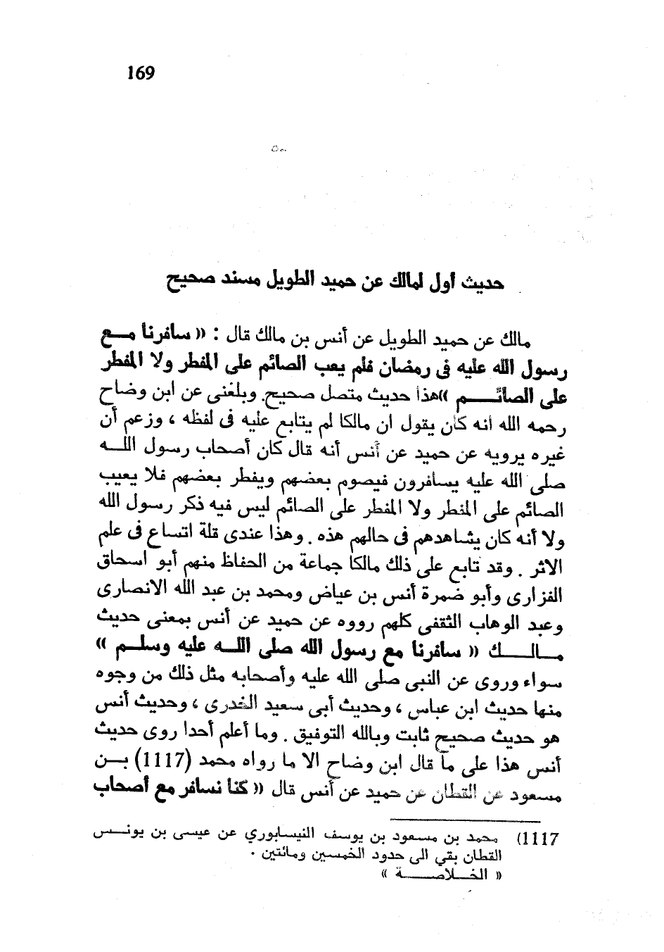 حَدِيثٌ أَوَّلُ لِمَالِكٍ عَنْ حُمَيْدٍ الطَّوِيلِ مُسْنَدٌ صَحِيحٌ مَالِكٌ عَنْ حُمَيْدٍ الطَّوِيلِ عَنْ أَنَسِ بْنِ مَالِكٍ قَالَ سَافَرْنَا مَعَ رَسُولِ اللَّهِ صَلَّى اللَّهُ عَلَيْهِ وَسَلَّمَ فِي رَمَضَانَ فَلَمْ يَعِبِ الصَّائِمُ عَلَى الْمُفْطِرِ وَلَا الْمُفْطِرُ عَلَى الصَّائِمِ هَذَا حَدِيثٌ مُتَّصِلٌ صَحِيحٌ وَبَلَغَنِي عَنِ ابْنِ وَضَّاحٍ رَحِمَهُ اللَّهُ أَنَّهُ كَانَ يَقُولُ إِنَّ مَالِكًا لَمْ يُتَابَعْ عَلَيْهِ فِي لَفْظِهِ وَزَعَمَ أَنَّ غَيْرَهُ يَرْوِيهِ عَنْ حُمَيْدٍ عَنْ أَنَسٍ أَنَّهُ قَالَ كَانَ أَصْحَابُ رَسُولِ اللَّهِ صَلَّى اللَّهُ عَلَيْهِ وَسَلَّمَ يُسَافِرُونَ فَيَصُومُ بَعْضُهُمْ وَيُفْطِرُ بَعْضُهُمْ فَلَا يَعِيبُ الصَّائِمُ عَلَى الْمُفْطِرِ وَلَا الْمُفْطِرُ عَلَى الصَّائِمِ لَيْسَ فِيهِ ذِكْرُ رَسُولُ اللَّهِ صَلَّى اللَّهُ عَلَيْهِ وَسَلَّمَ وَلَا أَنَّهُ كَانَ يُشَاهِدُهُمْ فِي حَالِهِمْ هَذِهِ وَهَذَا عِنْدِي قِلَّةُ اتِّسَاعٍ فِي عِلْمِ الْأَثَرِ وَقَدْ تَابَعَ عَلَى ذَلِكَ مَالِكًا جَمَاعَةٌ مِنَ الْحُفَّاظِ مِنْهُمْ أَبُو إِسْحَاقَ الْفَزَارِيُّ وَأَبُو ضَمْرَةَ أَنَسُ بْنُ عِيَاضٍ وَمُحَمَّدُ بْنُ عَبْدِ اللَّهِ الْأَنْصَارِيُّ وَعَبْدُ الْوَهَّابِ الثَّقَفِيُّ كُلُّهُمْ رَوَوْهُ عَنْ حُمَيْدٍ عَنْ أَنَسٍ بِمَعْنَى حَدِيثِ مَالِكٍ سَافَرْنَا مَعَ رَسُولِ اللَّهِ صَلَّى اللَّهُ عَلَيْهِ وَسَلَّمَ سَوَاءً وَرُوِيَ عَنِ النَّبِيِّ صَلَّى اللَّهُ عَلَيْهِ وَسَلَّمَ وَأَصْحَابِهِ مِثْلُ ذَلِكَ مِنْ وُجُوهٍ مِنْهَا حَدِيثُ ابْنِ عَبَّاسٍ وَحَدِيثُ أَبِي سَعِيدٍ الْخُدْرِيِّ وَحَدِيثُ أَنَسٍ هُوَ حَدِيثٌ صَحِيحٌ ثَابِتٌ وَبِاللَّهِ التَّوْفِيقُ وَمَا أَعْلَمُ أَحَدًا رَوَى حَدِيثَ أَنَسٍ هَذَا عَلَى مَا قَالَ ابْنُ وَضَّاحٍ إِلَّا مَا رَوَاهُ مُحَمَّدُ بْنُ مَسْعُودٍ عَنِ الْقَطَّانِ عَنْ حُمَيْدٍ عَنْ أَنَسٍ قَالَ كُنَّا نُسَافِرُ مَعَ أصحاب
