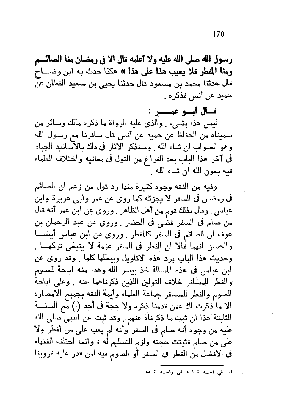 رَسُولِ اللَّهِ صَلَّى اللَّهُ عَلَيْهِ وَسَلَّمَ وَلَا أَعْلَمُهُ قَالَ إِلَّا فِي رَمَضَانَ مِنَّا الصَّائِمُ وَمِنَّا الْمُفْطِرُ فَلَا يَعِيبُ هَذَا عَلَى هَذَا هَكَذَا حَدَّثَ بِهِ ابْنُ وَضَّاحٍ قَالَ حَدَّثَنَا مُحَمَّدُ بْنُ مَسْعُودٍ قَالَ حَدَّثَنَا يَحْيَى بْنُ سَعِيدٍ الْقَطَّانُ عَنْ حُمَيْدٍ عَنْ أَنَسٍ فَذَكَرَهُ قَالَ أَبُو عُمَرَ لَيْسَ هَذَا بِشَيْءٍ وَالَّذِي عَلَيْهِ الرُّوَاةُ مَا ذَكَرَهُ مَالِكٌ وَسَائِرُ مَنْ سَمَّيْنَاهُ مِنَ الْحُفَّاظِ عَنْ حُمَيْدٍ عَنْ أَنَسٍ قَالَ سَافَرْنَا مَعَ رَسُولِ اللَّهِ وَهُوَ الصَّوَابُ إِنْ شَاءَ اللَّهُ وَسَنَذْكُرُ الْآثَارَ فِي ذَلِكَ بِالْأَسَانِيدِ الْجِيَادِ فِي آخِرِ هَذَا الْبَابِ بَعْدَ الْفَرَاغِ مِنَ الْقَوْلِ فِي مَعَانِيهِ وَاخْتِلَافِ الْعُلَمَاءِ فِيهِ بِعَوْنِ اللَّهِ إِنْ شَاءَ اللَّهُ وَفِيهِ مِنَ الْفِقْهِ وُجُوهٌ كَثِيرَةٌ مِنْهَا رَدُّ قَوْلِ مَنْ زَعَمَ أَنَّ الصَّائِمَ فِي رَمَضَانَ فِي السَّفَرِ لَا يُجْزِئُهُ كَمَا رُوِيَ عَنْ عُمَرَ وَأَبِي هُرَيْرَةَ وَابْنِ عَبَّاسٍ وَقَالَ بِذَلِكَ قَوْمٌ مِنْ أَهْلِ الظَّاهِرِ وَرُوِيَ عَنِ ابْنِ عُمَرَ أَنَّهُ قَالَ مَنْ صَامَ فِي السَّفَرِ قضى في الحضر وروى عن عبد الرحمان بْنِ عَوْفٍ أَنَّ الصَّائِمَ فِي السَّفَرِ كَالْمُفْطِرِ وَرُوِيَ عَنِ ابْنِ عَبَّاسٍ أَيْضًا وَالْحَسَنِ أَنَّهُمَا قَالَا إِنَّ الْفِطْرَ فِي السَّفَرِ عَزْمَةٌ لَا يَنْبَغِي تَرْكُهَا وَحَدِيثُ هَذَا الْبَابِ يَرُدُّ هَذِهِ الْأَقَاوِيلَ وَيُبْطِلُهَا كُلَّهَا وَقَدْ رُوِيَ عَنِ ابْنِ عَبَّاسٍ فِي هَذِهِ الْمَسْأَلَةِ خُذْ بِيُسْرِ اللَّهِ وَهَذَا مِنْهُ إِبَاحَةٌ لِلصَّوْمِ وَالْفِطْرِ لِلْمُسَافِرِ خِلَافَ الْقَوْلَيْنِ اللَّذَيْنِ ذَكَرْنَاهُمَا عَنْهُ وَعَلَى إِبَاحَةِ الصَّوْمِ والفطر للمسافر جماعة العلماء وأيمة الْفِقْهِ بِجَمِيعِ الْأَمْصَارِ إِلَّا مَا ذَكَرْتُ لَكَ عَمَّنْ قَدَّمْنَا ذِكْرَهُ وَلَا حُجَّةَ فِي أَحَدٍ مَعَ السُّنَّةِ الثَّابِتَةِ هَذَا إِنْ ثَبَتَ مَا ذَكَرْنَاهُ عَنْهُمْ وَقَدْ ثَبَتَ عَنِ النَّبِيِّ صَلَّى اللَّهُ عَلَيْهِ وَسَلَّمَ مِنْ وُجُوهٍ أَنَّهُ صَامَ فِي السَّفَرِ وَأَنَّهُ لَمْ يَعِبْ عَلَى مَنْ أَفْطَرَ وَلَا عَلَى مَنْ صَامَ فَثَبَتَتْ حُجَّتُهُ وَلَزِمَ التَّسْلِيمُ لَهُ وَإِنَّمَا اخْتَلَفَ الْفُقَهَاءُ فِي الْأَفْضَلِ مِنَ الْفِطْرِ فِي السَّفَرِ أَوِ الصَّوْمِ فِيهِ لِمَنْ قَدَرَ عَلَيْهِ فَرُوِّينَا