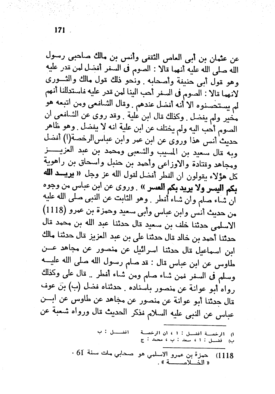 عَنْ عُثْمَانَ بْنِ أَبِي الْعَاصِ الثَّقَفِيِّ وَأَنَسِ بْنِ مَالِكٍ صَاحِبَيْ رَسُولِ اللَّهِ صَلَّى اللَّهُ عَلَيْهِ وَسَلَّمَ أَنَّهُمَا قَالَا الصَّوْمُ فِي السَّفَرِ أَفْضَلُ لِمَنْ قَدَرَ عَلَيْهِ وَهُوَ قَوْلُ أَبِي حَنِيفَةَ وَأَصْحَابِهِ وَنَحْوُ ذَلِكَ قَوْلُ مَالِكٍ وَالثَّوْرِيِّ لِأَنَّهُمَا قَالَا الصَّوْمُ فِي السَّفَرِ أَحَبُّ إِلَيْنَا لِمَنْ قَدَرَ عَلَيْهِ فَاسْتَدْلَلْنَا أَنَّهُمْ لَمْ يَسْتَحْسِنُوهُ إِلَّا أَنَّهُ أَفْضَلُ عِنْدَهُمْ وَقَالَ الشَّافِعِيُّ وَمَنِ اتَّبَعَهُ هُوَ مُخَيَّرٌ وَلَمْ يُفَضِّلْ وَكَذَلِكَ قَالَ ابْنُ عُلَيَّةَ وَقَدْ رُوِيَ عَنِ الشَّافِعِيِّ أَنَّ الصَّوْمَ أَحَبُّ إِلَيْهِ وَلَمْ يَخْتَلِفْ عَنِ ابْنِ عُلَيَّةَ أَنَّهُ لَا يُفَضِّلُ وَهُوَ ظَاهِرُ حَدِيثِ أَنَسٍ هَذَا وَرُوِيَ عَنِ ابْنِ عُمَرَ وَابْنِ عَبَّاسٍ الرُّخْصَةُ أَفْضَلُ وَبِهِ قَالَ سَعِيدُ بْنُ الْمُسَيَّبِ وَالشَّعْبِيُّ وَمُحَمَّدُ بْنُ عَبْدِ الْعَزِيزِ وَمُجَاهِدٌ وقتادة وَالْأَوْزَاعِيُّ وَأَحْمَدُ بْنُ حَنْبَلٍ وَإِسْحَاقُ بْنُ رَاهَوَيْهِ كُلُّ هَؤُلَاءِ يَقُولُونَ إِنَّ الْفِطْرَ أَفْضَلُ لِقَوْلِ اللَّهِ عَزَّ وَجَلَّ يُرِيدُ اللَّهُ بِكُمُ الْيُسْرَ وَلَا يُرِيدُ بِكُمُ الْعُسْرَ وَرُوِيَ عَنِ ابْنِ عَبَّاسٍ مِنْ وُجُوهٍ إِنْ شَاءَ صَامَ وَإِنْ شَاءَ أَفْطَرَ وَهُوَ الثَّابِتُ عَنِ النَّبِيِّ صَلَّى اللَّهُ عَلَيْهِ وَسَلَّمَ مِنْ حَدِيثِ أَنَسٍ وَابْنِ عَبَّاسٍ وَأَبِي سَعِيدٍ وَحَمْزَةَ بْنِ عَمْرٍو الْأَسْلَمِيِّ حَدَّثَنَا خَلَفُ بْنُ سَعِيدٍ قَالَ حَدَّثَنَا عَبْدُ اللَّهِ بْنُ مُحَمَّدٍ قَالَ حَدَّثَنَا أَحْمَدُ بْنُ خَالِدٍ قَالَ حَدَّثَنَا عَلِيُّ بْنُ عَبْدِ الْعَزِيزِ قَالَ حدثنا مالك ابن إِسْمَاعِيلَ قَالَ حَدَّثَنَا إِسْرَائِيلُ عَنْ مَنْصُورٍ عَنْ مُجَاهِدٍ عَنْ طَاوُسٍ عَنِ ابْنِ عَبَّاسٍ قَالَ قَدْ صَامَ رَسُولُ اللَّهِ صَلَّى اللَّهُ عَلَيْهِ وَسَلَّمَ فِي السَّفَرِ فَمَنْ شَاءَ صَامَ وَمَنْ شَاءَ أَفْطَرَ قَالَ عَلِيٌّ وَكَذَلِكَ رَوَاهُ أَبُو عَوَانَةَ عَنْ مَنْصُورٍ بِإِسْنَادِهِ حَدَّثَنَاهُ فَضْلُ بْنُ عَوْفٍ قَالَ حَدَّثَنَا أَبُو عَوَانَةَ عَنْ مَنْصُورٍ عَنْ مُجَاهِدٍ عَنْ طَاوُسٍ عَنِ ابْنِ عَبَّاسٍ عَنِ النَّبِيِّ عَلَيْهِ السَّلَامُ فَذَكَرَ الْحَدِيثَ قَالَ وَرَوَاهُ شُعْبَةُ عَنْ