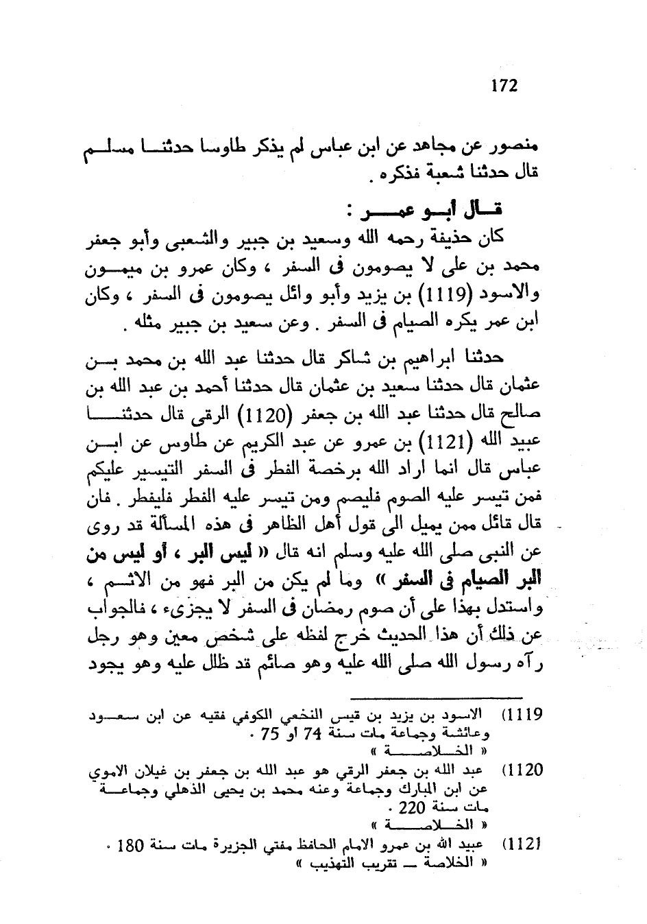 مَنْصُورٍ عَنْ مُجَاهِدٍ عَنِ ابْنِ عَبَّاسٍ لَمْ يَذْكُرْ طَاوُسًا حَدَّثَنَا مُسْلِمٌ قَالَ حَدَّثَنَا شُعْبَةُ فَذَكَرَهُ قَالَ أَبُو عُمَرَ كَانَ حُذَيْفَةُ رَحِمَهُ اللَّهُ وَسَعِيدُ بْنُ جُبَيْرٍ وَالشَّعْبِيُّ وَأَبُو جَعْفَرٍ مُحَمَّدُ بْنُ عَلِيٍّ لَا يَصُومُونَ فِي السَّفَرِ وَكَانَ عَمْرُو بْنُ مَيْمُونٍ وَالْأَسْوَدُ بْنُ يَزِيدَ وَأَبُو وَائِلٍ يَصُومُونَ فِي السَّفَرِ وَكَانَ ابْنُ عُمَرَ يَكْرَهُ الصِّيَامَ فِي السَّفَرِ وَعَنْ سَعِيدِ بْنِ جُبَيْرٍ مِثْلُهُ حَدَّثَنَا إِبْرَاهِيمُ بْنُ شَاكِرٍ قَالَ حَدَّثَنَا عَبْدُ اللَّهِ بْنُ مُحَمَّدِ بْنِ عُثْمَانَ قَالَ حَدَّثَنَا سَعِيدُ بْنُ عُثْمَانَ قَالَ حَدَّثَنَا أَحْمَدُ بْنُ عَبْدِ اللَّهِ بْنِ صَالِحٍ قَالَ حَدَّثَنَا عَبْدُ اللَّهِ بْنُ جَعْفَرٍ الرَّقِّيُّ قَالَ حَدَّثَنَا عُبَيْدُ اللَّهِ بْنُ عَمْرٍو عَنْ عَبْدِ الْكَرِيمِ عَنْ طَاوُسٍ عَنِ ابْنِ عَبَّاسٍ قَالَ إِنَّمَا أَرَادَ اللَّهُ بِرُخْصَةِ الْفِطْرِ فِي السَّفَرِ التَّيْسِيرَ عَلَيْكُمْ فَمَنْ تَيَسَّرَ عَلَيْهِ الصَّوْمُ فَلْيَصُمْ وَمِنْ تَيَسَّرَ عَلَيْهِ الْفِطْرُ فَلْيُفْطِرْ فَإِنْ قَالَ قَائِلٌ مِمَّنْ يَمِيلُ إِلَى قَوْلِ أَهْلِ الظَّاهِرِ فِي هَذِهِ الْمَسْأَلَةِ قَدْ رُوِيَ عَنِ النَّبِيِّ صَلَّى اللَّهُ عَلَيْهِ وَسَلَّمَ أَنَّهُ قَالَ لَيْسَ الْبَرُّ أَوْ لَيْسَ مِنَ الْبِرِّ الصِّيَامُ فِي السَّفَرِ وَمَا لَمْ يَكُنْ مِنَ الْبِرِّ فَهُوَ مِنَ الْإِثْمِ وَاسْتُدِلَّ بِهَذَا عَلَى أَنَّ صَوْمَ رَمَضَانَ فِي السَّفَرِ لَا يُجْزِئُ فَالْجَوَابُ عَنْ ذَلِكَ أَنَّ هَذَا الْحَدِيثَ خَرَجَ لَفْظُهُ عَلَى شَخْصٍ مُعَيَّنٍ وَهُوَ رَجُلٌ رَآهُ رَسُولُ اللَّهِ صَلَّى اللَّهُ عَلَيْهِ وَسَلَّمَ وَهُوَ صَائِمٌ قَدْ ظَلَّلَ عَلَيْهِ وَهُوَ يَجُودُ
