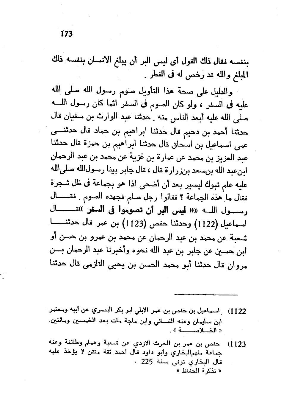 بِنَفْسِهِ فَقَالَ ذَلِكَ الْقَوْلَ أَيْ لَيْسَ الْبِرُّ أَنْ يَبْلُغَ الْإِنْسَانُ بِنَفْسِهِ ذَلِكَ الْمَبْلَغَ وَاللَّهُ قَدْ رَخَّصَ لَهُ فِي الْفِطْرِ وَالدَّلِيلُ عَلَى صِحَّةِ هَذَا التَّأْوِيلِ صَوْمُ رَسُولِ اللَّهِ صَلَّى اللَّهُ عَلَيْهِ وَسَلَّمَ فِي السَّفَرِ وَلَوْ كَانَ الصَّوْمُ إِثْمًا كَانَ رَسُولُ اللَّهِ صَلَّى اللَّهُ عَلَيْهِ وَسَلَّمَ أَبْعَدَ النَّاسِ مِنْهُ حَدَّثَنَا عَبْدُ الْوَارِثِ بْنُ سُفْيَانَ قَالَ حَدَّثَنَا أَحْمَدُ بْنُ دُحَيْمٍ قَالَ حَدَّثَنَا إِبْرَاهِيمُ بْنُ حَمَّادٍ قَالَ حَدَّثَنِي عَمِّي إِسْمَاعِيلُ بْنُ إِسْحَاقَ قَالَ حَدَّثَنَا إِبْرَاهِيمُ بْنُ حَمْزَةَ قَالَ حَدَّثَنَا عَبْدُ الْعَزِيزِ بْنُ مُحَمَّدٍ عَنْ عُمَارَةَ بْنِ غَزِيَّةَ عَنْ مُحَمَّدِ بْنِ عبد الرحمان ابن عَبْدِ اللَّهِ بْنِ سَعْدِ بْنِ زُرَارَةَ قَالَ قَالَ جَابِرٌ بَيْنَا رَسُولُ اللَّهِ صَلَّى اللَّهُ عَلَيْهِ وَسَلَّمَ عَامَ تَبُوكَ لَيَسِيرُ بَعْدَ أَنْ أَضْحَى إِذَا هُوَ بِجَمَاعَةٍ فِي ظِلِّ شَجَرَةٍ فَقَالَ مَا هَذِهِ الْجَمَاعَةُ فَقَالُوا رَجُلٌ صَامَ فَجَهَدَهُ الصَّوْمُ فَقَالَ رَسُولُ اللَّهِ لَيْسَ الْبِرُّ أَنْ تَصُومُوا فِي السَّفَرِ قَالَ إِسْمَاعِيلُ وَحَدَّثَنَا حَفْصُ بْنُ عُمَرَ قَالَ حَدَّثَنَا شُعْبَةُ عَنْ محمد بن عبد الرحمان عَنْ مُحَمَّدِ بْنِ عَمْرِو بْنِ حَسَنٍ أَوِ ابْنِ حُسَيْنٍ عَنْ جَابِرِ بْنِ عَبْدِ اللَّهِ نحوه وأخبرنا عبد الرحمان بْنُ مَرْوَانَ قَالَ حَدَّثَنَا أَبُو مُحَمَّدٍ الْحَسَنُ بْنُ يَحْيَى الْقَلْزُمِيُّ قَالَ حَدَّثَنَا