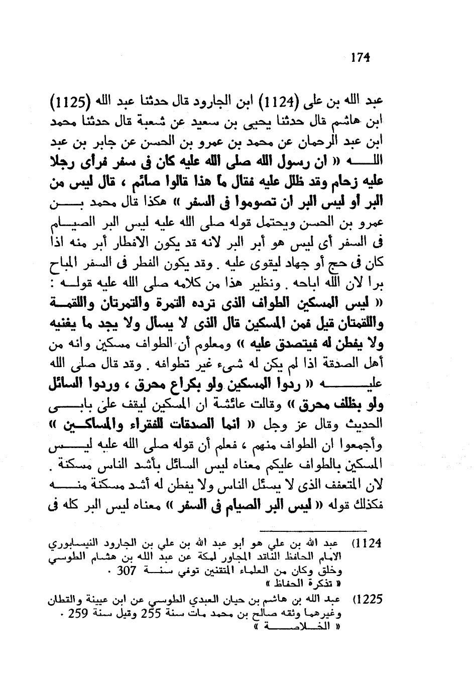 عبد الله بن علي ابن الجارود قال حدثنا عبد الله ابن هَاشِمٍ قَالَ حَدَّثَنَا يَحْيَى بْنُ سَعِيدٍ عَنْ شعبة قال حدثنا محمد بن عبد الرحمان عَنْ مُحَمَّدِ بْنِ عَمْرِو بْنِ الْحَسَنِ عَنْ جَابِرِ بْنِ عَبْدِ اللَّهِ أَنَّ رَسُولَ اللَّهِ صَلَّى اللَّهُ عَلَيْهِ وَسَلَّمَ كَانَ فِي سَفَرٍ فَرَأَى رَجُلًا عَلَيْهِ زِحَامٌ وَقَدْ ظَلَّلَ عَلَيْهِ فَقَالَ مَا هَذَا قَالُوا صَائِمٌ قَالَ لَيْسَ مِنَ الْبِرِّ أَوْ لَيْسَ الْبِرُّ أَنْ تَصُومُوا فِي السَّفَرِ هَكَذَا قَالَ مُحَمَّدُ بْنُ عَمْرِو بْنِ الْحَسَنِ وَيُحْتَمَلُ قَوْلُهُ صَلَّى اللَّهُ عَلَيْهِ وَسَلَّمَ لَيْسَ الْبِرَّ الصِّيَامُ فِي السَّفَرِ أَيْ لَيْسَ هُوَ أَبَرُّ الْبِرِّ لِأَنَّهُ قَدْ يَكُونُ الْإِفْطَارُ أَبَرَّ مِنْهُ إِذَا كَانَ فِي حَجٍّ أَوْ جِهَادٍ لِيَقْوَى عَلَيْهِ وَقَدْ يَكُونُ الْفِطْرُ فِي السَّفَرِ الْمُبَاحِ بِرَّا لِأَنَّ اللَّهَ أَبَاحَهُ وَنَظِيرُ هَذَا مِنْ كَلَامِهِ صَلَّى اللَّهُ عَلَيْهِ وَسَلَّمَ قَوْلُهُ لَيْسَ الْمِسْكِينَ الطَّوَّافُ الَّذِي تَرُدُّهُ التَّمْرَةُ وَالتَّمْرَتَانِ وَاللُّقْمَةُ وَاللُّقْمَتَانِ قِيلَ فَمَنِ الْمِسْكِينُ قَالَ الَّذِي لَا يَسْأَلُ وَلَا يَجِدُ مَا يُغْنِيهِ وَلَا يُفْطَنُ لَهُ فَيُتَصَدَّقُ عَلَيْهِ وَمَعْلُومٌ أَنَّ الطَّوَّافَ مِسْكِينٌ وَأَنَّهُ مِنْ أَهْلِ الصَّدَقَةِ إِذَا لَمْ يَكُنْ لَهُ شَيْءٌ غَيْرَ تَطْوَافِهِ وَقَدْ قَالَ صَلَّى اللَّهُ عَلَيْهِ وَسَلَّمَ رَدُّوا الْمِسْكِينَ وَلَوْ بِكَرَاعٍ مُحْرَقٍ وَرُدُّوا السَّائِلَ لَوْ بِظِلْفٍ مُحْرَقٍ وَقَالَتْ عَائِشَةُ إِنَّ الْمِسْكِينَ لَيَقِفُ عَلَى بَابِي الْحَدِيثَ وَقَالَ عَزَّ وَجَلَّ إِنَّمَا الصَّدَقَاتُ لِلْفُقَرَاءِ وَالْمَسَاكِينِ وَأَجْمَعُوا أَنَّ الطَّوَّافَ مِنْهُمْ فَعُلِمَ أَنَّ قَوْلَهُ صَلَّى اللَّهُ عَلَيْهِ وَسَلَّمَ لَيْسَ الْمِسْكِينُ بِالطَّوَّافِ عَلَيْكُمْ مَعْنَاهُ لَيْسَ السَّائِلُ بِأَشَدِّ النَّاسِ مَسْكَنَةً لِأَنَّ الْمُتَعَفِّفَ الَّذِي لَا يسئل النَّاسَ وَلَا يُفْطَنُ لَهُ أَشَدُّ مَسْكَنَةً مِنْهُ فَكَذَلِكَ قَوْلُهُ لَيْسَ الْبِرَّ الصِّيَامُ فِي السَّفَرِ مَعْنَاهُ لَيْسَ الْبِرُّ كُلُّهُ فِي
