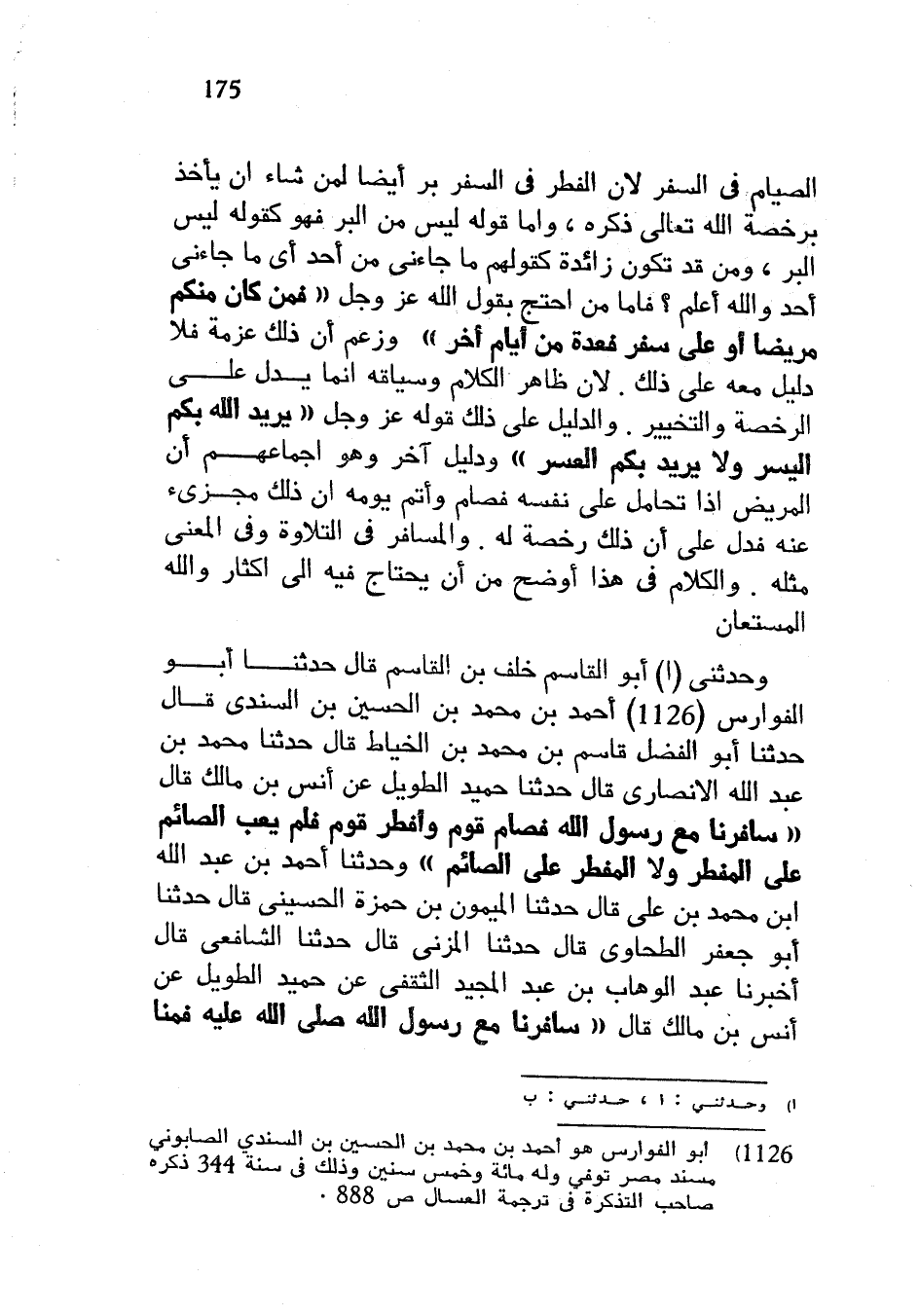 الصِّيَامِ فِي السَّفَرِ لِأَنَّ الْفِطْرَ فِي السَّفَرِ بِرٌّ أَيْضًا لِمَنْ شَاءَ أَنْ يَأْخُذَ بِرُخْصَةِ اللَّهِ تَعَالَى ذِكْرُهُ وَأَمَّا قَوْلُهُ لَيْسَ مِنَ البر فهو كقوله ليس البر ومن قَدْ تَكُونُ زَائِدَةً كَقَوْلِهِمْ مَا جَاءَنِي مِنْ أَحَدٍ أَيْ مَا جَاءَنِي أَحَدٌ وَاللَّهُ أَعْلَمُ فَأَمَّا مَنِ احْتَجَّ بِقَوْلِ اللَّهِ عَزَّ وَجَلَّ فَمَنْ كَانَ مِنْكُمْ مَرِيضًا أَوْ عَلَى سَفَرٍ فَعِدَّةٌ مِنْ أَيَّامٍ أُخَرَ وَزَعَمَ أَنَّ ذَلِكَ عَزْمَةٌ فَلَا دَلِيلَ مَعَهُ عَلَى ذَلِكَ لِأَنَّ ظاهر الكلام وسياقه إنا يَدُلُّ عَلَى الرُّخْصَةِ وَالتَّخْيِيرِ وَالدَّلِيلُ عَلَى ذَلِكَ قَوْلُهُ عَزَّ وَجَلَّ يُرِيدُ اللَّهُ بِكُمُ الْيُسْرَ وَلَا يُرِيدُ بِكُمُ الْعُسْرَ وَدَلِيلٌ آخَرُ وَهُوَ إِجْمَاعُهُمْ أَنَّ الْمَرِيضَ إِذَا تَحَامَلَ عَلَى نَفْسِهِ فَصَامَ وَأَتَمَّ يَوْمَهُ أَنَّ ذَلِكَ مُجْزِئٌ عَنْهُ فَدَلَّ عَلَى أَنَّ ذَلِكَ رُخْصَةٌ لَهُ وَالْمُسَافِرُ فِي التِّلَاوَةِ وَفِي الْمَعْنَى مِثْلُهُ وَالْكَلَامُ فِي هَذَا أَوْضَحُ مِنْ أَنْ يُحْتَاجَ فِيهِ إِلَى إِكْثَارٍ وَاللَّهُ الْمُسْتَعَانُ وَحَدَّثَنِي أَبُو الْقَاسِمِ خَلَفُ بْنُ الْقَاسِمِ قَالَ حَدَّثَنَا أَبُو الْفَوَارِسِ أَحْمَدُ بْنُ مُحَمَّدِ بْنِ الْحُسَيْنِ بْنِ السِّنْدِيِّ قَالَ حَدَّثَنَا أَبُو الْفَضْلِ قَاسِمُ بْنُ مُحَمَّدِ بْنِ الْخَيَّاطِ قَالَ حَدَّثَنَا مُحَمَّدُ بْنُ عَبْدِ اللَّهِ الْأَنْصَارِيُّ قَالَ حَدَّثَنَا حُمَيْدٌ الطَّوِيلُ عَنْ أَنَسِ بْنِ مَالِكٍ قَالَ سَافَرْنَا مَعَ رَسُولِ اللَّهِ فَصَامَ قَوْمٌ وَأَفْطَرَ قَوْمٌ فَلَمْ يَعِبِ الصَّائِمُ عَلَى الْمُفْطِرِ وَلَا الْمُفْطِرُ عَلَى الصَّائِمِ وَحَدَّثَنَا احمد بن عبد الله ابن مُحَمَّدِ بْنِ عَلِيٍّ قَالَ حَدَّثَنَا الْمَيْمُونُ بْنُ حَمْزَةَ الْحُسَيْنِيُّ قَالَ حَدَّثَنَا أَبُو جَعْفَرٍ الطَّحَاوِيُّ قَالَ حَدَّثَنَا الْمُزَنِيُّ قَالَ حَدَّثَنَا الشَّافِعِيُّ قَالَ أَخْبَرَنَا عَبْدُ الْوَهَّابِ بْنُ عَبْدِ الْمَجِيدِ الثَّقَفِيُّ عَنْ حُمَيْدٍ الطَّوِيلِ عَنْ أَنَسِ بْنِ مَالِكٍ قَالَ سَافَرْنَا مَعَ رَسُولِ اللَّهِ صَلَّى اللَّهُ عَلَيْهِ وَسَلَّمَ فَمِنَّا