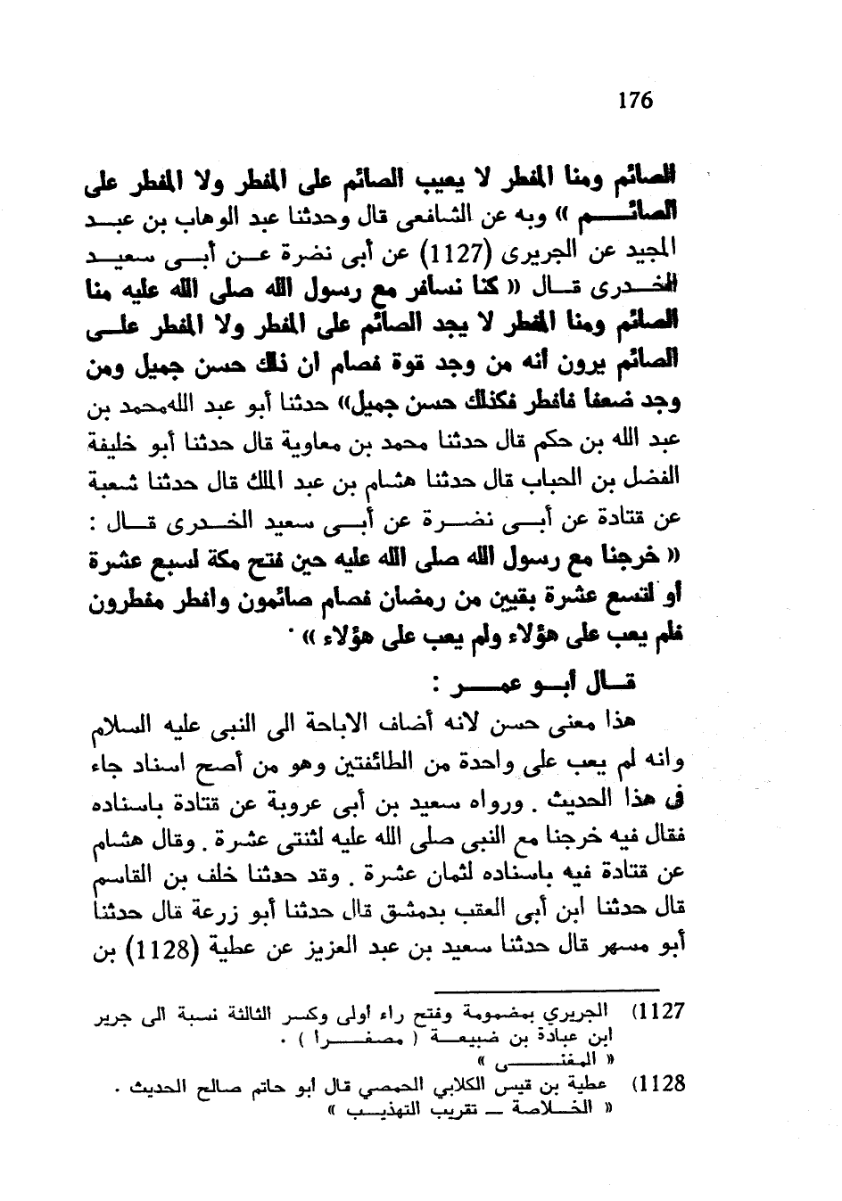 الصَّائِمُ وَمِنَّا الْمُفْطِرُ لَا يَعِيبُ الصَّائِمُ عَلَى الْمُفْطِرِ وَلَا الْمُفْطِرُ عَلَى الصَّائِمِ وَبِهِ عَنِ الشَّافِعِيِّ قَالَ وَحَدَّثَنَا عَبْدُ الْوَهَّابِ بْنُ عَبْدِ الْمَجِيدِ عَنِ الْجُرَيْرِيِّ عَنْ أَبِي نَضْرَةَ عَنْ أَبِي سَعِيدٍ الْخُدْرِيِّ قَالَ كُنَّا نُسَافِرُ مَعَ رَسُولِ اللَّهِ صَلَّى اللَّهُ عَلَيْهِ وَسَلَّمَ مِنَّا الصَّائِمُ وَمِنَّا الْمُفْطِرُ لَا يَجِدُ الصَّائِمُ عَلَى الْمُفْطِرِ وَلَا الْمُفْطِرُ عَلَى الصَّائِمِ يَرَوْنَ أَنَّهُ مَنْ وَجَدَ قُوَّةً فَصَامَ أَنَّ ذَلِكَ حَسَنٌ جَمِيلٌ وَمَنْ وَجَدَ ضَعْفًا فَأَفْطَرَ فَكَذَلِكَ حَسَنٌ جَمِيلٌ حَدَّثَنَا أَبُو عَبْدِ اللَّهِ مُحَمَّدُ بْنُ عَبْدِ اللَّهِ بْنِ حَكَمٍ قَالَ حَدَّثَنَا مُحَمَّدُ بْنُ مُعَاوِيَةَ قَالَ حَدَّثَنَا أَبُو خَلِيفَةَ الْفَضْلُ بْنُ الْحُبَابِ قَالَ حَدَّثَنَا هِشَامُ بْنُ عَبْدِ الْمَلِكِ قَالَ حَدَّثَنَا شُعْبَةُ عَنْ قَتَادَةَ عَنْ أَبِي نَضْرَةَ عَنْ أَبِي سَعِيدٍ الْخُدْرِيِّ قَالَ خَرَجْنَا مَعَ رَسُولِ اللَّهِ صَلَّى اللَّهُ عَلَيْهِ وَسَلَّمَ حِينَ فَتْحِ مَكَّةَ لِسَبْعَ عَشْرَةَ أَوْ لِتِسْعَ عَشْرَةَ بَقِينَ مِنْ رَمَضَانَ فَصَامَ صَائِمُونَ وَأَفْطَرَ مُفْطِرُونَ فَلَمْ يَعِبْ عَلَى هَؤُلَاءِ وَلَمْ يَعِبْ عَلَى هَؤُلَاءِ قَالَ أَبُو عُمَرَ هَذَا مَعْنًى حَسَنٌ لِأَنَّهُ أَضَافَ الْإِبَاحَةَ إِلَى النَّبِيِّ عَلَيْهِ السَّلَامُ وَأَنَّهُ لَمْ يَعِبْ عَلَى وَاحِدَةٍ مِنَ الطَّائِفَتَيْنِ وَهُوَ مِنْ أَصَحِّ إِسْنَادٍ جَاءَ فِي هَذَا الْحَدِيثِ وَرَوَاهُ سَعِيدُ بْنُ أَبِي عَرُوبَةَ عَنْ قَتَادَةَ بِإِسْنَادِهِ فَقَالَ فِيهِ خَرَجْنَا مَعَ النَّبِيِّ صَلَّى اللَّهُ عَلَيْهِ وَسَلَّمَ لِثِنْتَيْ عَشْرَةَ وَقَالَ هِشَامٌ عَنْ قَتَادَةَ فِيهِ بِإِسْنَادِهِ لِثَمَانَ عَشْرَةَ وَقَدْ حَدَّثَنَا خَلَفُ بْنُ الْقَاسِمِ قَالَ حَدَّثَنَا ابْنُ أَبِي الْعَقِبِ بِدِمَشْقَ قَالَ حَدَّثَنَا أَبُو زُرْعَةَ قَالَ حَدَّثَنَا أَبُو مُسْهِرٍ قَالَ حَدَّثَنَا سَعِيدُ بْنُ عَبْدِ الْعَزِيزِ عَنْ عَطِيَّةَ بن