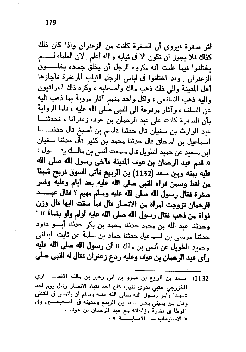 أَثَرُ صُفْرَةٍ فَيُرْوَى أَنَّ الصُّفْرَةَ كَانَتْ مِنَ الزَّعْفَرَانِ وَإِذَا كَانَ ذَلِكَ كَذَلِكَ فَلَا يَجُوزُ أَنْ تَكُونَ إِلَّا فِي ثِيَابِهِ وَاللَّهُ أَعْلَمُ لِأَنَّ الْعُلَمَاءَ لَمْ يَخْتَلِفُوا فِيمَا عَلِمْتُ أَنَّهُ مَكْرُوهٌ لِلرَّجُلِ أَنْ يُخْلِقَ جَسَدَهُ بِخَلُوقِ الزَّعْفَرَانِ وَقَدِ اخْتَلَفُوا فِي لِبَاسِ الرَّجُلِ لِلثِّيَابِ الْمُزَعْفَرَةِ فَأَجَازَهَا أَهْلُ الْمَدِينَةِ وَإِلَى ذَلِكَ ذَهَبَ مَالِكٌ وَأَصْحَابُهُ وَكَرِهَ ذَلِكَ الْعِرَاقِيُّونَ وَإِلَيْهِ ذَهَبَ الشَّافِعِيُّ وَلِكُلِّ وَاحِدٍ مِنْهُمْ آثَارٌ مَرْوِيَّةٌ بِمَا ذَهَبَ إِلَيْهِ عَنِ السَّلَفِ وَآثَارٌ مَرْفُوعَةٌ إِلَى النَّبِيِّ صَلَّى اللَّهُ عَلَيْهِ وَسَلَّمَ فَأَمَّا الرِّوَايَةُ بِأَنَّ الصفرة كانت على عبد الرحمان بْنِ عَوْفٍ زَعْفَرَانًا فَحَدَّثَنَا عَبْدُ الْوَارِثِ بْنُ سُفْيَانَ قَالَ حَدَّثَنَا قَاسِمُ بْنُ أَصْبَغَ قَالَ حَدَّثَنَا إِسْمَاعِيلُ بْنُ إِسْحَاقَ قَالَ حَدَّثَنَا مُحَمَّدُ بْنُ كَثِيرٍ قَالَ حَدَّثَنَا سفيان ابن سَعِيدٍ عَنْ حُمَيْدٍ الطَّوِيلِ قَالَ سَمِعْتُ أَنَسَ بن مالك يقول قدم عبد الرحمان بْنُ عَوْفٍ الْمَدِينَةَ فَآخَى رَسُولُ اللَّهِ صَلَّى اللَّهُ عَلَيْهِ وَسَلَّمَ بَيْنَهُ وَبَيْنَ سَعْدِ بْنِ الرَّبِيعِ فَأَتَى السُّوقَ فَرَبِحَ شَيْئًا مِنْ أَقِطٍ وَسَمْنٍ فَرَآهُ النَّبِيُّ صَلَّى اللَّهُ عَلَيْهِ وَسَلَّمَ بَعْدَ أَيَّامٍ وَعَلَيْهِ وَضَرُ صُفْرَةٍ فَقَالَ رَسُولُ اللَّهِ صَلَّى اللَّهُ عَلَيْهِ وَسَلَّمَ مَهْيَمْ فَقَالَ عبد الرحمان تَزَوَّجْتُ امْرَأَةً مِنَ الْأَنْصَارِ قَالَ فَمَا سُقْتَ إِلَيْهَا قَالَ وَزْنَ نَوَاةٍ مِنْ ذَهَبٍ فَقَالَ رَسُولُ اللَّهِ صَلَّى اللَّهُ عَلَيْهِ وَسَلَّمَ أَوْلِمْ وَلَوْ بِشَاةٍ وَحَدَّثَنَا عَبْدُ اللَّهِ بْنُ مُحَمَّدٍ حَدَّثَنَا مُحَمَّدُ بْنُ بَكْرٍ حَدَّثَنَا أَبُو دَاوُدَ حَدَّثَنَا مُوسَى بْنُ إِسْمَاعِيلَ حَدَّثَنَا حَمَّادُ بْنُ سَلَمَةَ عَنْ ثَابِتٍ الْبُنَانِيِّ وَحُمَيْدٍ الطَّوِيلِ عَنْ أَنَسِ بْنِ مَالِكٍ أَنَّ رَسُولَ اللَّهِ صَلَّى اللَّهُ عليه وسلم رأى عبد الرحمان بْنَ عَوْفٍ وَعَلَيْهِ رَدْعُ زَعْفَرَانٍ فَقَالَ لَهُ النَّبِيُّ صَلَّى