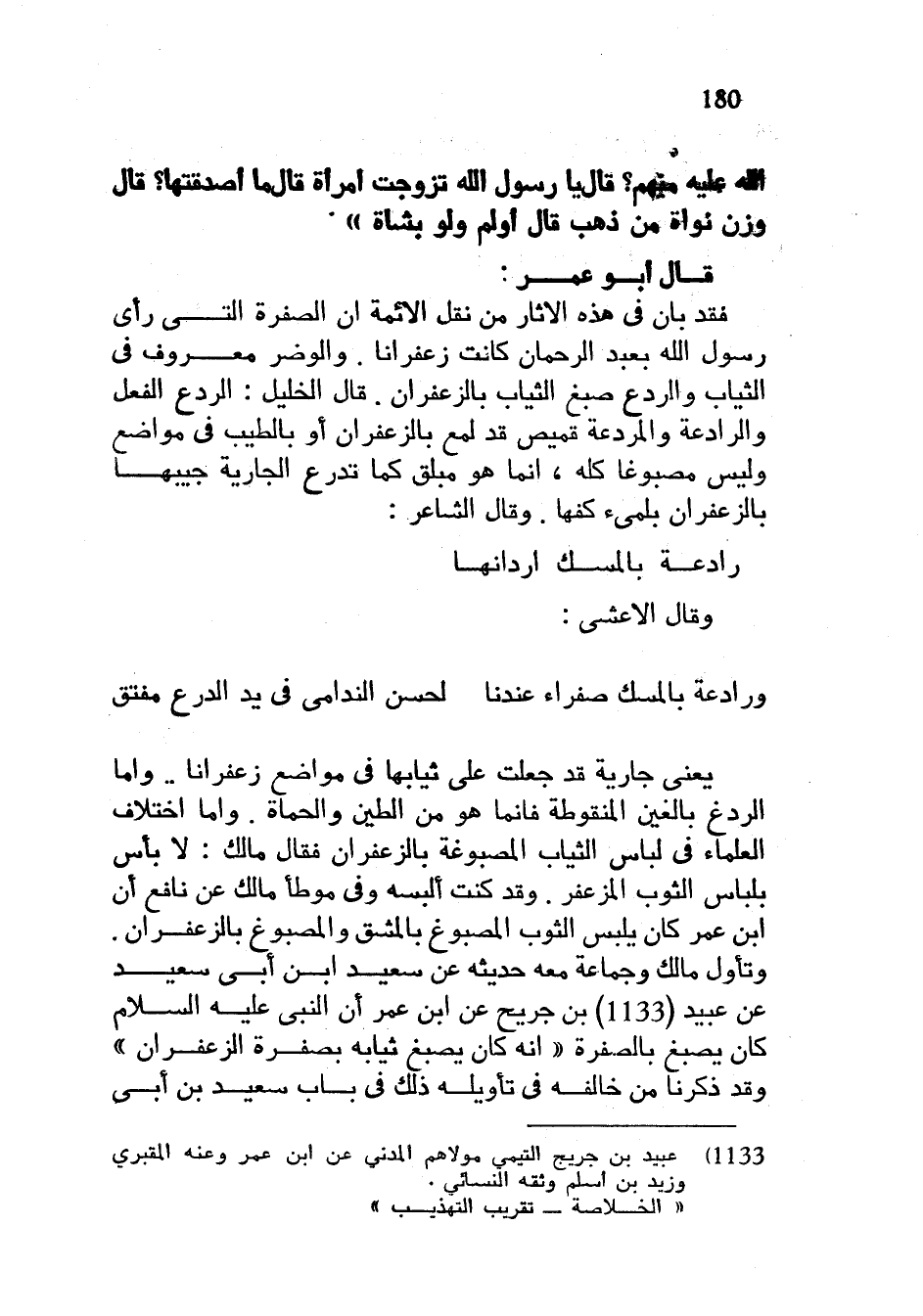 الله عليه وسلم ميهم قَالَ يَا رَسُولَ اللَّهِ تَزَوَّجْتُ امْرَأَةً قَالَ مَا أَصْدَقْتَهَا قَالَ وَزْنَ نَوَاةٍ مِنْ ذَهَبٍ قَالَ أَوْلِمْ وَلَوْ بِشَاةٍ قَالَ أَبُو عُمَرَ فَقَدْ بَانَ فِي هَذِهِ الْآثَارِ مِنْ نَقْلِ الْأَئِمَّةِ أَنَّ الصُّفْرَةَ الَّتِي رَأَى رَسُولُ اللَّهِ بعبد الرحمان كَانَتْ زَعْفَرَانًا وَالْوَضَرُ مَعْرُوفٌ فِي الثِّيَابِ وَالرَّدْعُ صبغ الثياب بالزعفران قال الخيل الرَّدْعُ الْفِعْلُ وَالرَّادِعَةُ وَالْمُرَدَّعَةُ قَمِيصٌ قَدْ لَمَعَ بِالزَّعْفَرَانِ أَوْ بِالطِّيبِ فِي مَوَاضِعَ وَلَيْسَ مَصْبُوغًا كُلَّهُ إِنَّمَا هُوَ مُبَلَّقٌ كَمَا تُدْرِعُ الْجَارِيَةُ جيبها بالزعفران بلمىء كَفِّهَا وَقَالَ الشَّاعِرُ ... رَادِعَةٌ بِالْمِسْكِ أَرْدَانُهَا ... وَقَالَ الْأَعْشَى ... ... وَرَادِعَةٌ بِالْمِسْكِ صَفْرَاءُ عِنْدَنَا ... لِحُسْنِ النَّدَامَى فِي يَدِ الدِّرْعِ مُفْتَقِ ... يَعْنِي جَارِيَةً قَدْ جَعَلَتْ عَلَى ثِيَابِهَا فِي مَوَاضِعَ زَعْفَرَانًا وَأَمَّا الردع بِالْغَيْنِ الْمَنْقُوطَةِ فَإِنَّمَا هُوَ مِنَ الطِّينِ وَالْحَمَاةِ وَأَمَّا اخْتِلَافُ الْعُلَمَاءِ فِي لِبَاسِ الثِّيَابِ الْمَصْبُوغَةِ بِالزَّعْفَرَانِ فَقَالَ مَالِكٌ لَا بَأْسَ بِلِبَاسِ الثَّوْبِ الْمُزَعْفَرِ وَقَدْ كُنْتُ أَلْبَسُهُ وَفِي مُوَطَّأِ مَالِكٍ عَنْ نَافِعٍ أَنَّ ابْنَ عُمَرَ كَانَ يَلْبَسُ الثَّوْبَ الْمَصْبُوغَ بِالْمَشْقِ وَالْمَصْبُوغَ بِالزَّعْفَرَانِ وَتَأَوَّلَ مَالِكٌ وجماعة معه حديثه عن سعيد ابن أَبِي سَعِيدٍ عَنْ عُبَيْدِ بْنِ جُرَيْحٍ عَنِ ابْنِ عُمَرَ أَنَّ النَّبِيَّ عَلَيْهِ السَّلَامُ كَانَ يَصْبُغُ بِالصُّفْرَةِ إِنَّهُ كَانَ يَصْبُغُ ثِيَابَهُ بِصُفْرَةِ الزَّعْفَرَانِ وَقَدْ ذَكَرْنَا مَنْ خَالَفَهُ فِي تَأْوِيلِهِ ذَلِكَ فِي بَابِ سَعِيدِ بْنِ أَبِي
