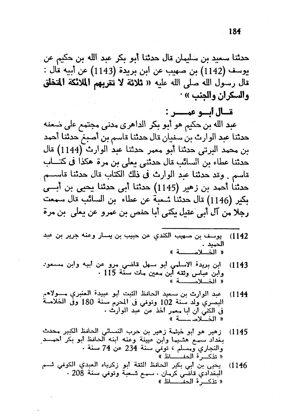 حَدَّثَنَا سَعِيدُ بْنُ سُلَيْمَانَ قَالَ حَدَّثَنَا أَبُو بَكْرٍ عَبْدُ اللَّهِ بْنُ حَكِيمٍ عَنْ يُوسُفَ بن صهيب عَنِ ابْنِ بُرَيْدَةَ عَنْ أَبِيهِ قَالَ قَالَ رَسُولُ اللَّهِ صَلَّى اللَّهُ عَلَيْهِ وَسَلَّمَ ثَلَاثَةٌ لَا تَقْرَبُهُمُ الْمَلَائِكَةُ الْمُتَخَلِّقُ وَالسَّكْرَانُ وَالْجَنُبُ قَالَ أَبُو عُمَرَ عَبْدُ اللَّهِ بْنُ حَكِيمٍ هُوَ أَبُو بَكْرٍ الدَّاهِرِيُّ مَدَّنِيٌّ مُجْتَمَعٌ عَلَى ضَعْفِهِ حَدَّثَنَا عَبْدُ الْوَارِثِ بْنُ سُفْيَانَ قَالَ حَدَّثَنَا قَاسِمُ بْنُ أَصْبَغَ حَدَّثَنَا أَحْمَدُ بْنُ مُحَمَّدٍ الْبِرْتِيُّ حَدَّثَنَا أَبُو مَعْمَرٍ حَدَّثَنَا عَبْدُ الْوَارِثِ قَالَ حَدَّثَنَا عَطَاءُ بْنُ السَّائِبِ قَالَ حَدَّثَنِي يَعْلَى بْنُ مُرَّةَ هَكَذَا فِي كِتَابِ قَاسِمٍ وَقَدْ حَدَّثَنَا عَبْدُ الْوَارِثِ فِي ذَلِكَ الْكِتَابِ قَالَ حَدَّثَنَا قَاسِمٌ حَدَّثَنَا أَحْمَدُ بْنُ زُهَيْرٍ حَدَّثَنَا أَبِي حَدَّثَنَا يَحْيَى بْنُ أَبِي بُكَيْرٍ قَالَ حَدَّثَنَا شُعْبَةُ عَنْ عَطَاءِ بْنِ السَّائِبِ قَالَ سَمِعَتُ رَجُلًا مِنْ آلِ أَبِي عَقِيلٍ يُكَنَّى أَبَا حَفْصِ بْنَ عَمْرٍو عَنْ يَعْلَى بْنِ مُرَّةَ