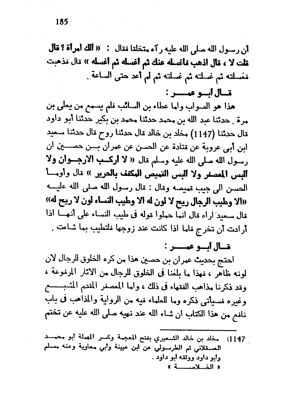 أن رسول الله صلى الله عليه وسلم رَآهُ مُتَخَلِّقًا فَقَالَ أَلَكَ امْرَأَةٌ قَالَ قُلْتُ لَا قَالَ اذْهَبْ فَاغْسِلْهُ عَنْكَ ثُمَّ اغْسِلْهُ ثُمَّ اغْسِلْهُ قَالَ فَذَهَبْتُ فَغَسَلْتُهُ ثُمَّ غَسَلْتُهُ ثُمَّ غَسَلْتُهُ ثُمَّ لَمْ أَعُدْ حَتَّى السَّاعَةِ قَالَ أَبُو عُمَرَ هَذَا هُوَ الصَّوَابُ وَأَمَّا عَطَاءُ بْنُ السَّائِبِ فَلَمْ يَسْمَعْ مِنْ يَعْلَى بْنِ مُرَّةَ حَدَّثَنَا عَبْدُ اللَّهِ بْنُ مُحَمَّدٍ حَدَّثَنَا مُحَمَّدُ بْنُ بُكَيْرٍ حَدَّثَنَا أَبُو دَاوُدَ قَالَ حَدَّثَنَا مَخْلَدُ بْنُ خَالِدٍ قَالَ حَدَّثَنَا رَوْحٌ قَالَ حَدَّثَنَا سَعِيدُ ابْنِ أَبِي عَرُوبَةَ عَنْ قَتَادَةَ عَنِ الْحَسَنِ عَنْ عِمْرَانَ بْنِ حُصَيْنٍ أَنَّ رَسُولَ اللَّهِ صَلَّى اللَّهُ عَلَيْهِ وَسَلَّمَ قَالَ لَا أَرْكَبُ الْأُرْجُوَانَ وَلَا أَلْبَسُ الْمُعَصْفَرَ وَلَا أَلْبَسُ الْقَمِيصَ الْمُكَفَّفَ بِالْحَرِيرِ قَالَ وَأَوْمَأَ الْحَسَنُ إِلَى جَيْبِ قَمِيصِهِ وَقَالَ قَالَ رَسُولُ اللَّهِ صَلَّى اللَّهُ عَلَيْهِ وَسَلَّمَ أَلَا وَطِيبُ الرِّجَالِ رِيحٌ لَا لَوْنَ لَهُ أَلَا وَطِيبُ النِّسَاءِ لَوْنٌ لَا رِيحَ لَهُ قَالَ سَعِيدٌ أَرَاهُ قَالَ إِنَّمَا حَمَلُوا قَوْلَهُ فِي طِيبِ النِّسَاءِ عَلَى أَنَّهَا إِذَا أَرَادَتْ أَنْ تَخْرُجَ فَأَمَّا إِذَا كَانَتْ عِنْدَ زوجها فلتتطيب بِمَا شَاءَتْ قَالَ أَبُو عُمَرَ احْتَجَّ بِحَدِيثِ عِمْرَانَ بْنِ حُصَيْنٍ هَذَا مَنْ كَرِهَ الْخَلُوقَ لِلرِّجَالِ لِأَنَّ لَوْنَهُ ظَاهِرٌ فَهَذَا مَا بَلَغَنَا فِي الْخَلُوقِ لِلرِّجَالِ مِنَ الْآثَارِ الْمَرْفُوعَةِ وَقَدْ ذَكَرْنَا مَذَاهِبَ الْفُقَهَاءِ فِي ذَلِكَ وَأَمَّا الْمُعَصْفَرُ الْمُقَدَّمُ الْمُشَبَّعُ وَغَيْرُهُ فَسَيَأْتِي ذِكْرُهُ وَمَا لِلْعُلَمَاءِ فِيهِ مِنَ الرِّوَايَةِ وَالْمَذَاهِبِ فِي بَابِ نَافِعٍ مِنْ هَذَا الْكِتَابِ إِنْ شَاءَ اللَّهُ عند نَهْيُهُ صَلَّى اللَّهُ عَلَيْهِ وَسَلَّمَ عَنْ تَخَتُّمِ