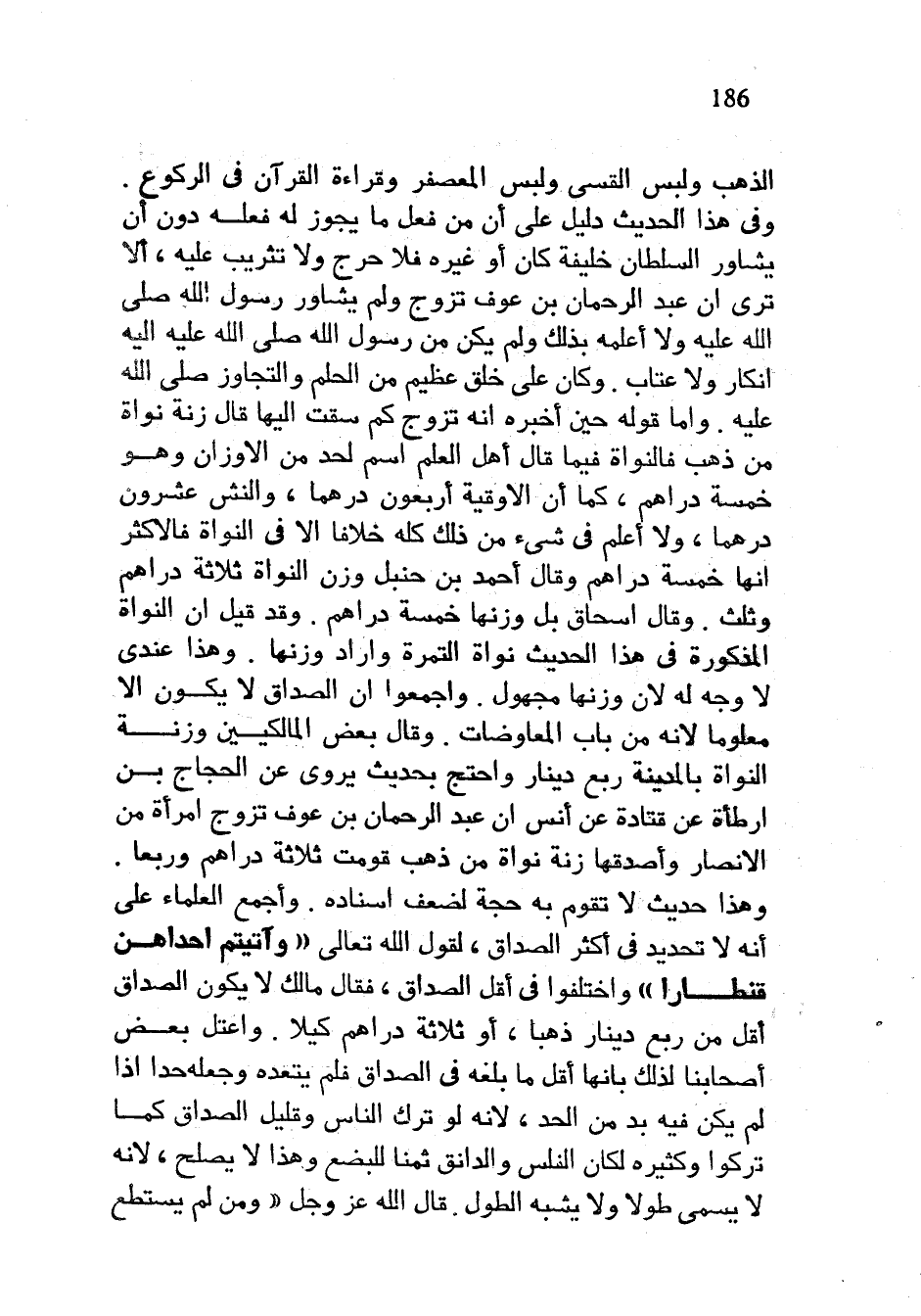 الذَّهَبِ وَلُبْسِ الْقِسِيِّ وَلُبْسِ الْمُعَصْفَرِ وَقِرَاءَةِ الْقُرْآنِ فِي الرُّكُوعِ وَفِي هَذَا الْحَدِيثِ دَلِيلٌ عَلَى أَنَّ مَنْ فَعَلَ مَا يَجُوزُ لَهُ فِعْلُهُ دُونَ أَنْ يُشَاوِرَ السُّلْطَانَ خَلِيفَةً كَانَ أَوْ غَيْرَهُ فَلَا حَرَجَ وَلَا تَثْرِيبَ عَلَيْهِ أَلَا ترى أن عبد الرحمان بْنَ عَوْفٍ تَزَوَّجَ وَلَمْ يُشَاوِرْ رَسُولَ اللَّهِ صَلَّى اللَّهُ عَلَيْهِ وَسَلَّمَ وَلَا أَعْلَمَهُ بِذَلِكَ وَلَمْ يَكُنْ مِنْ رَسُولِ اللَّهِ صَلَّى اللَّهُ عَلَيْهِ وَسَلَّمَ إِلَيْهِ إِنْكَارٌ وَلَا عِتَابٌ وَكَانَ عَلَى خُلُقٍ عَظِيمٍ مِنَ الْحِلْمِ وَالتَّجَاوُزِ صَلَّى اللَّهُ عَلَيْهِ وَسَلَّمَ وَأَمَّا قَوْلُهُ حِينَ أَخْبَرَهُ أَنَّهُ تَزَوَّجَ كَمْ سُقْتَ إِلَيْهَا قَالَ زِنَةَ نَوَاةٍ مِنْ ذَهَبٍ فَالنَّوَاةُ فِيمَا قَالَ أَهْلُ الْعِلْمِ اسْمٌ لِحَدٍّ مِنَ الْأَوْزَانِ وَهُوَ خَمْسَةُ دَرَاهِمَ كَمَا أَنَّ الْأُوقِيَّةَ أَرْبَعُونَ دِرْهَمًا وَالَنَّشُّ عِشْرُونَ دِرْهَمًا وَلَا أَعْلَمُ فِي شَيْءٍ مِنْ ذَلِكَ كُلِّهِ خِلَافًا إِلَّا فِي النَّوَاةِ فَالْأَكْثَرُ أَنَّهَا خَمْسَةُ دَرَاهِمَ وَقَالَ أَحْمَدُ بْنُ حَنْبَلٍ وزن النواة ثلاثة دراهم وثلث وَقَالَ إِسْحَاقُ بَلْ وَزْنُهَا خَمْسَةُ دَرَاهِمَ وَقَدْ قِيلَ إِنَّ النَّوَاةَ الْمَذْكُورَةَ فِي هَذَا الْحَدِيثِ نَوَاةُ التَّمْرَةِ وَأَرَادَ وَزْنَهَا وَهَذَا عِنْدِي لَا وَجْهَ لَهُ لِأَنَّ وَزْنَهَا مَجْهُولٌ وَأَجْمَعُوا أَنَّ الصَّدَاقَ لَا يَكُونُ إِلَّا مَعْلُومًا لِأَنَّهُ مِنْ بَابِ الْمُعَاوَضَاتِ وَقَالَ بَعْضُ الْمَالِكِيِّينَ وَزِنَةُ النَّوَاةِ بِالْمَدِينَةِ رُبْعُ دِينَارٍ وَاحْتَجَّ بِحَدِيثٍ يُرْوَى عَنِ الْحَجَّاجِ بْنِ أَرْطَأَةَ عَنْ قَتَادَةَ عَنْ أَنَسٍ ان عبد الرحمان بْنَ عَوْفٍ تَزَوَّجَ امْرَأَةً مِنَ الْأَنْصَارِ وَأَصْدَقَهَا زِنَةَ نَوَاةٍ مِنْ ذَهَبٍ قَوَّمَتْ ثَلَاثَةَ دَرَاهِمَ وَرُبْعًا وَهَذَا حَدِيثٌ لَا تَقُومُ بِهِ حُجَّةٌ لِضَعْفِ إِسْنَادِهِ وَأَجْمَعَ الْعُلَمَاءُ عَلَى أَنَّهُ لَا تَحْدِيدَ فِي أَكْثَرِ الصَّدَاقِ لِقَوْلِ اللَّهِ تَعَالَى وَآتَيْتُمْ إِحْدَاهُنَّ قِنْطَارًا وَاخْتَلَفُوا فِي أَقَلِّ الصَّدَاقِ فَقَالَ مَالِكٌ لَا يَكُونُ الصَّدَاقُ أَقَلَّ مِنْ رُبْعِ دِينَارٍ ذَهَبًا أَوْ ثَلَاثَةِ دَرَاهِمَ كَيْلًا وَاعْتَلَّ بَعْضُ أَصْحَابِنَا لِذَلِكَ بِأَنَّهَا أَقَلُّ مَا بَلَغَهُ فِي الصَّدَاقِ فَلَمْ يَتَعَدَّهُ وَجَعَلَهُ حَدًّا إِذَا لَمْ يَكُنْ فِيهِ بُدٌّ مِنَ الْحَدِّ لِأَنَّهُ لَوْ تَرَكَ النَّاسَ وَقَلِيلَ الصَّدَاقِ كَمَا تُرِكُوا وَكَثِيرُهُ لَكَانَ الْفَلْسُ وَالدَّانِقُ ثَمَنًا لِلْبُضْعِ وَهَذَا لَا يَصْلُحُ لِأَنَّهُ لَا يُسَمَّى طَوْلًا وَلَا يُشْبِهُ الطَّوْلَ قَالَ اللَّهُ عَزَّ وَجَلَّ وَمَنْ لَمْ يَسْتَطِعْ
