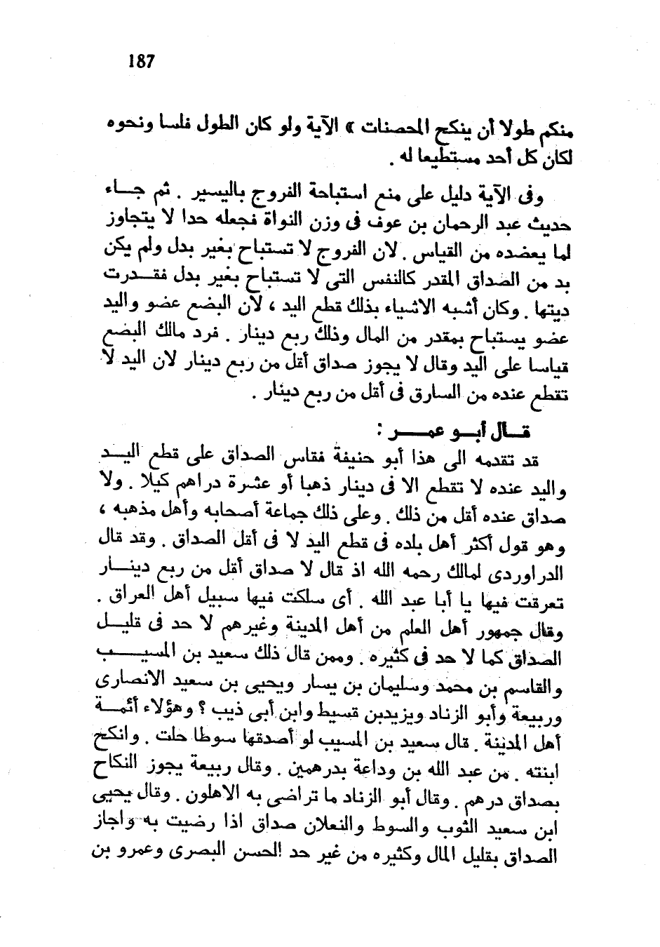 قَالَ أَبُو عُمَرَ قَدْ تَقَدَّمَهُ إِلَى هَذَا أَبُو حَنِيفَةَ فَقَاسَ الصَّدَاقَ عَلَى قَطْعِ الْيَدِ وَالْيَدُ عِنْدَهُ لَا تُقْطَعُ إِلَّا فِي دِينَارٍ ذَهَبًا أَوْ عَشَرَةِ دَرَاهِمَ كَيْلًا وَلَا صَدَاقَ عِنْدَهُ أَقَلَّ مِنْ ذَلِكَ وَعَلَى ذَلِكَ جَمَاعَةُ أَصْحَابِهِ وَأَهْلُ مَذْهَبِهِ وَهُوَ قَوْلُ أَكْثَرِ أَهْلِ بَلَدِهِ فِي قَطْعِ الْيَدِ لَا فِي أَقَلِّ الصَّدَاقِ وَقَدْ قَالَ الدَّرَاوَرْدِيُّ لِمَالِكٍ رَحِمَهُ اللَّهُ إِذْ قَالَ لَا صَدَاقَ أَقَلَّ مِنْ رُبْعِ دِينَارٍ تَعَرَّقْتَ فِيهَا يَا أَبَا عَبْدِ اللَّهِ أَيْ سَلَكْتَ فِيهَا سَبِيلَ أَهْلِ الْعِرَاقِ وَقَالَ جُمْهُورُ أَهْلِ الْعِلْمِ مِنْ أَهْلِ الْمَدِينَةِ وَغَيْرِهِمْ لَا حَدَّ فِي قَلِيلِ الصَّدَاقِ كَمَا لَا حَدَّ فِي كَثِيرِهِ وَمِمَّنْ قَالَ ذَلِكَ سَعِيدُ بْنُ الْمُسَيَّبِ وَالْقَاسِمُ بْنُ مُحَمَّدٍ وَسُلَيْمَانُ بْنُ يَسَارٍ وَيَحْيَى بْنُ سَعِيدٍ الْأَنْصَارِيُّ وَرَبِيعَةُ وَأَبُو الزِّنَادِ وَيَزِيدُ بن قسيط وابن أبي ذيب وَهَؤُلَاءِ أَئِمَّةُ أَهْلِ الْمَدِينَةِ قَالَ سَعِيدُ بْنُ الْمُسَيَّبِ لَوْ أَصْدَقَهَا سَوْطًا حَلَّتْ وَأَنْكَحَ ابْنَتَهُ مِنْ عَبْدِ اللَّهِ بْنِ وَدَاعَةَ بِدِرْهَمَيْنِ وَقَالَ رَبِيعَةُ يَجُوزُ النِّكَاحُ بِصَدَاقِ دِرْهَمٍ وَقَالَ أَبُو الزِّنَادِ مَا تَرَاضَى بِهِ الْأَهْلُونَ وَقَالَ يَحْيَى بْنُ سَعِيدٍ الثَّوْبُ وَالسَّوْطُ وَالنَّعْلَانِ صَدَاقٌ إِذَا رَضِيَتْ بِهِ وَأَجَازَ الصَّدَاقَ بِقَلِيلِ الْمَالِ وَكَثِيرِهِ مِنْ غَيْرِ حَدٍّ الْحَسَنُ الْبَصْرِيُّ وَعَمْرُو بْنُ