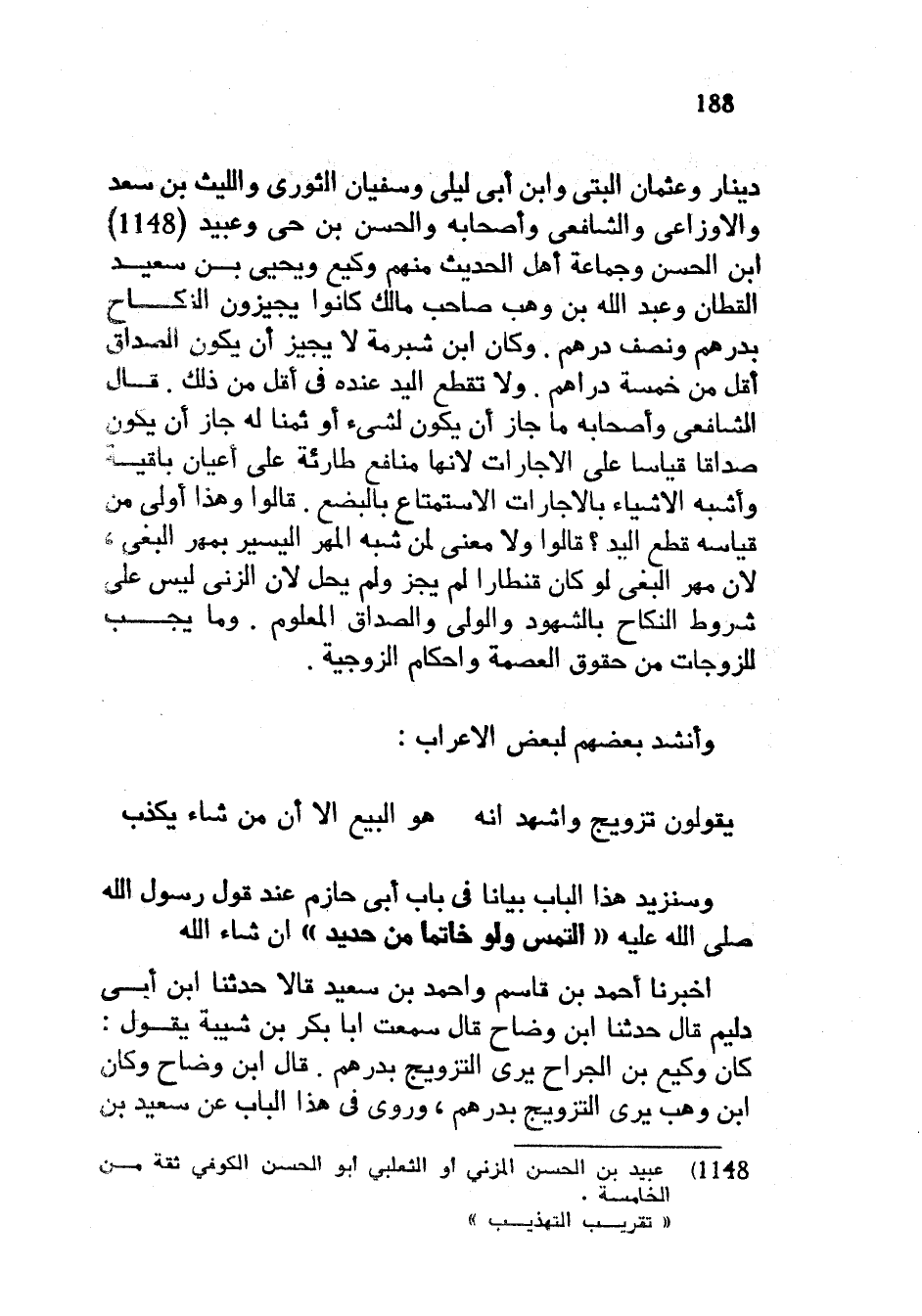 دِينَارٍ وَعُثْمَانُ الْبَتِّيُّ وَابْنُ أَبِي لَيْلَى وَسُفْيَانُ الثَّوْرِيُّ وَاللَّيْثُ بْنُ سَعْدٍ وَالْأَوْزَاعِيُّ وَالشَّافِعِيُّ وَأَصْحَابُهُ والحسن بن حي وعبيد ابن الْحَسَنِ وَجَمَاعَةُ أَهْلِ الْحَدِيثِ مِنْهُمْ وَكِيعٌ وَيَحْيَى بْنُ سَعِيدٍ الْقَطَّانُ وَعَبْدُ اللَّهِ بْنُ وَهْبٍ صَاحِبُ مَالِكٍ كَانُوا يُجِيزُونَ النِّكَاحَ بِدِرْهَمٍ وَنِصْفِ دِرْهَمٍ وَكَانَ ابْنُ شُبْرُمَةَ لَا يُجِيزُ أَنْ يَكُونَ الصَّدَاقُ أَقَلَّ مِنْ خَمْسَةِ دَرَاهِمَ وَلَا تُقْطَعُ الْيَدُ عِنْدَهُ فِي أَقَلَّ مِنْ ذَلِكَ قَالَ الشَّافِعِيُّ وَأَصْحَابُهُ مَا جَازَ أَنْ يَكُونَ لِشَيْءٍ أَوْ ثَمَنًا لَهُ جَازَ أَنْ يَكُونَ صَدَاقًا قِيَاسًا عَلَى الْإِجَارَاتِ لِأَنَّهَا مَنَافِعُ طَارِئَةٌ عَلَى أَعْيَانٍ بَاقِيَةٍ وَأَشْبَهُ الْأَشْيَاءِ بِالْإِجَارَاتِ الِاسْتِمْتَاعُ بِالْبُضْعِ قَالُوا وَهَذَا أَوْلَى مِنْ قِيَاسِهِ قَطْعَ الْيَدِ قَالُوا وَلَا مَعْنًى لِمَنْ شَبَّهَ الْمَهْرَ الْيَسِيرَ بِمَهْرِ الْبَغِيِّ لِأَنَّ مَهْرَ الْبَغِيِّ لَوْ كَانَ قِنْطَارًا لَمْ يَجُزْ وَلَمْ يَحِلَّ لِأَنَّ الزنى لَيْسَ عَلَى شُرُوطِ النِّكَاحِ بِالشُّهُودِ وَالْوَلِيِّ وَالصَّدَاقِ الْمَعْلُومِ وَمَا يَجِبُ لِلزَّوْجَاتِ مِنْ حُقُوقِ الْعِصْمَةِ وَأَحْكَامِ الزَّوْجِيَّةِ وَأَنْشَدَ بَعْضُهُمْ لِبَعْضِ الْأَعْرَابِ ... يَقُولُونَ تَزْوِيجٌ وَأَشْهَدُ أَنَّهُ ... هُوَ الْبَيْعُ إِلَّا أَنَّ مَنْ شَاءَ يَكْذِبُ ... ... وَسَنَزِيدُ هَذَا الْبَابَ بَيَانًا فِي بَابِ أَبِي حَازِمٍ عِنْدَ قَوْلِ رَسُولِ اللَّهِ صَلَّى اللَّهُ عَلَيْهِ وَسَلَّمَ الْتَمِسْ وَلَوْ خَاتَمًا مِنْ حَدِيدٍ إِنْ شَاءَ اللَّهُ أَخْبَرَنَا أَحْمَدُ بْنُ قَاسِمٍ وَأَحْمَدُ بْنُ سَعِيدٍ قَالَا حَدَّثَنَا ابْنُ أَبِي دُلَيْمٍ قَالَ حَدَّثَنَا ابْنُ وَضَّاحٍ قَالَ سَمِعْتُ أَبَا بَكْرِ بْنَ شَيْبَةَ يَقُولُ كَانَ وَكِيعُ بْنُ الْجَرَّاحِ يَرَى التَّزْوِيجَ بِدِرْهَمٍ قَالَ ابْنُ وَضَّاحٍ وَكَانَ ابْنُ وَهْبٍ يَرَى التَّزْوِيجَ بِدِرْهَمٍ وَرُوِيَ فِي هَذَا الْبَابِ عَنْ سَعِيدِ بْنِ