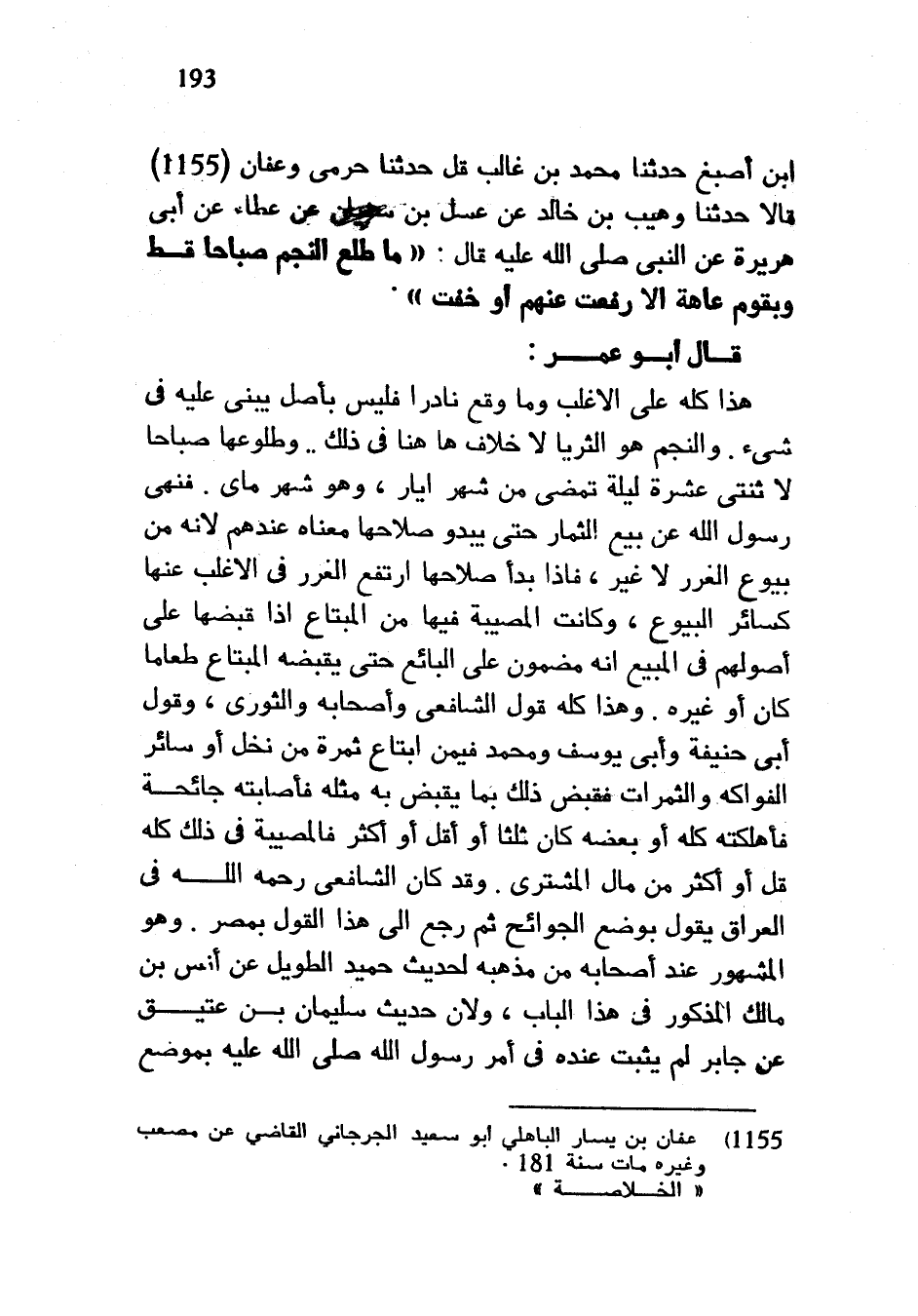 ابن أَصْبَغَ حَدَّثَنَا مُحَمَّدُ بْنُ غَالِبٍ قَالَ حَدَّثَنَا حَرَمِيُّ وَعَفَّانُ قَالَا حَدَّثَنَا وُهَيْبُ بْنُ خَالِدٍ عَنْ عِسْلِ بْنِ سُفْيَانَ عَنْ عَطَاءٍ عَنْ أَبِي هُرَيْرَةَ عَنِ النَّبِيِّ صَلَّى اللَّهُ عَلَيْهِ وَسَلَّمَ قَالَ مَا طَلَعَ النَّجْمُ صَبَاحًا قَطُّ وَبِقَوْمٍ عَاهَةٌ إِلَّا رُفِعَتْ عَنْهُمْ أَوْ خَفَتْ قَالَ أَبُو عُمَرَ هَذَا كُلُّهُ عَلَى الْأَغْلَبِ وَمَا وَقَعَ نَادِرًا فَلَيْسَ بِأَصْلٍ يُبْنَى عَلَيْهِ فِي شَيْءٍ وَالنَّجْمُ هُوَ الثُّرَيَّا لَا خِلَافَ ها هنا في ذلك وطولعها صباحا لا ثنتي عَشْرَةَ لَيْلَةً تَمْضِي مِنْ شَهْرِ أَيَارٍ وَهُوَ شَهْرٌ مَايٍ فَنَهْيُ رَسُولِ اللَّهِ عَنْ بَيْعِ الثِّمَارِ حَتَّى يَبْدُوَ صَلَاحُهَا مَعْنَاهُ عِنْدَهُمْ لِأَنَّهُ من بيوعا الْغَرَرِ لَا غَيْرَ فَإِذَا بَدَا صَلَاحُهَا ارْتَفَعَ الْغَرَرُ فِي الْأَغْلَبِ عَنْهَا كَسَائِرِ الْبُيُوعِ وَكَانَتِ الْمُصِيبَةُ فِيهَا مِنَ الْمُبْتَاعِ إِذَا قَبَضَهَا عَلَى أُصُولِهِمْ فِي الْمَبِيعِ أَنَّهُ مَضْمُونٌ عَلَى الْبَائِعِ حَتَّى يَقْبِضَهُ الْمُبْتَاعُ طَعَامًا كَانَ أَوْ غَيْرَهُ وَهَذَا كُلُّهُ قَوْلُ الشَّافِعِيِّ وَأَصْحَابِهِ وَالثَّوْرِيِّ وَقَوْلُ أَبِي حَنِيفَةَ وَأَبِي يُوسُفَ وَمُحَمَّدٍ فِيمَنِ ابْتَاعَ ثَمَرَةً مِنْ نَخْلٍ أَوْ سَائِرِ الْفَوَاكِهِ وَالثَّمَرَاتِ فَقَبَضَ ذَلِكَ بِمَا يُقْبَضُ بِهِ مِثْلُهُ فَأَصَابَتْهُ جَائِحَةٌ فَأَهْلَكَتْهُ كُلَّهُ أَوْ بَعْضَهُ كَانَ ثُلُثًا أَوْ أَقَلَّ أَوْ أَكْثَرَ فَالْمُصِيبَةُ فِي ذَلِكَ كله قل أو أكثر مِنْ مَالِ الْمُشْتَرِي وَقَدْ كَانَ الشَّافِعِيُّ رَحِمَهُ اللَّهُ فِي الْعِرَاقِ يَقُولُ بِوَضْعِ الْجَوَائِحِ ثُمَّ رجع إلى هذا القول بمصر وَهُوَ الْمَشْهُورُ عِنْدَ أَصْحَابِهِ مِنْ مَذْهَبِهِ لِحَدِيثِ حُمَيْدٍ الطَّوِيلِ عَنْ أَنَسِ بْنِ مَالِكٍ الْمَذْكُورِ فِي هَذَا الْبَابِ وَلِأَنَّ حَدِيثَ سُلَيْمَانَ بْنِ عَتِيقٍ عَنْ جَابِرٍ لَمْ يَثْبُتْ عِنْدَهُ فِي أَمْرِ رَسُولِ اللَّهِ صَلَّى اللَّهُ عَلَيْهِ وَسَلَّمَ بموضع