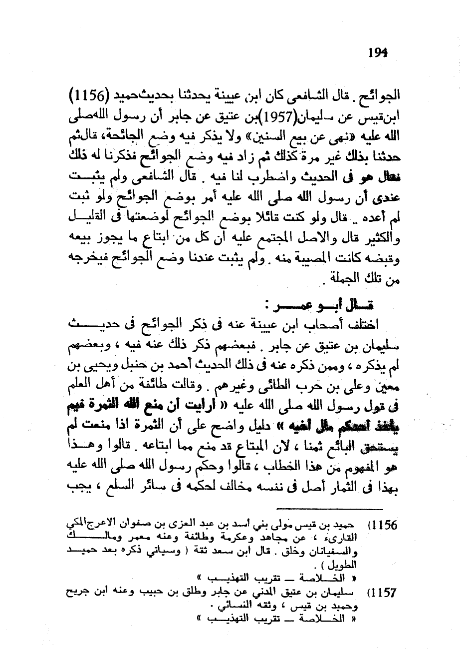 الْجَوَائِحِ قَالَ الشَّافِعِيُّ كَانَ ابْنُ عُيَيْنَةَ يُحَدِّثُنَا بحديث حميد ابن قَيْسٍ عَنْ سُلَيْمَانَ بْنِ عَتِيقٍ عَنْ جَابِرٍ أَنَّ رَسُولَ اللَّهِ صَلَّى اللَّهُ عليه وسلم نَهَى عَنْ بَيْعِ السِّنِينَ وَلَا يَذْكُرُ فِيهِ وَضْعَ الْجَائِحَةِ قَالَ ثُمَّ حَدَّثَنَا بِذَلِكَ غَيْرَ مَرَّةٍ كَذَلِكَ ثُمَّ زَادَ فِيهِ وَضْعَ الْجَوَائِحِ فَذَكَرْنَا لَهُ ذَلِكَ فَقَالَ هُوَ فِي الْحَدِيثِ وَاضْطَرَبَ لَنَا فِيهِ قَالَ الشَّافِعِيُّ وَلَمْ يَثْبُتْ عِنْدِي أَنَّ رَسُولَ اللَّهِ صَلَّى اللَّهُ عَلَيْهِ وَسَلَّمَ أَمَرَ بِوَضْعِ الْجَوَائِحِ وَلَوْ ثَبَتَ لَمْ أُعِدْهُ قَالَ وَلَوْ كُنْتُ قَائِلًا بِوَضْعِ الْجَوَائِحِ لَوَضَعْتُهَا فِي الْقَلِيلِ وَالْكَثِيرِ قَالَ وَالْأَصْلُ الْمُجْتَمَعُ عَلَيْهِ أَنَّ كُلَّ مَنِ ابْتَاعَ مَا يَجُوزُ بَيْعُهُ وَقَبْضُهُ كَانَتِ الْمُصِيبَةُ مِنْهُ وَلَمْ يَثْبُتْ عِنْدَنَا وَضْعُ الْجَوَائِحِ فَيُخْرِجُهُ مِنْ تِلْكَ الْجُمْلَةِ قَالَ أَبُو عُمَرَ اخْتَلَفَ أَصْحَابُ ابْنِ عُيَيْنَةَ عَنْهُ فِي ذِكْرِ الْجَوَائِحِ فِي حَدِيثِ سُلَيْمَانَ بن عتبق عَنْ جَابِرٍ فَبَعْضُهُمْ ذُكِرَ ذَلِكَ عَنْهُ فِيهِ وَبَعْضُهُمْ لَمْ يَذْكُرْهُ وَمِمَّنْ ذَكَرَهُ عَنْهُ فِي ذَلِكَ الْحَدِيثِ أَحْمَدُ بْنُ حَنْبَلٍ وَيَحْيَى بْنُ مَعِينٍ وَعَلِيُّ بْنُ حَرْبٍ الطَّائِيُّ وَغَيْرُهُمْ وَقَالَتْ طَائِفَةٌ مِنْ أَهْلِ الْعِلْمِ فِي قَوْلِ رَسُولِ اللَّهِ صَلَّى اللَّهُ عَلَيْهِ وَسَلَّمَ أَرَأَيْتَ إِنْ مَنَعَ اللَّهُ الثَّمَرَةَ فِيمَ يَأْخُذُ أَحَدُكُمْ مَالَ أَخِيهِ دَلِيلٌ وَاضِحٌ عَلَى أَنَّ الثَّمَرَةَ إِذَا مُنِعَتْ لَمْ يَسْتَحِقَّ الْبَائِعُ ثَمَنًا لِأَنَّ الْمُبْتَاعَ قَدْ مَنَعَ مِمَّا ابْتَاعَهُ قَالُوا وَهَذَا هُوَ الْمَفْهُومُ مِنْ هَذَا الْخِطَابِ قَالُوا وَحَكَمَ رَسُولُ اللَّهِ صَلَّى اللَّهُ عَلَيْهِ وَسَلَّمَ بِهَذَا فِي الثِّمَارِ أَصْلٌ فِي نَفْسِهِ مُخَالِفٌ لِحُكْمِهِ فِي سَائِرِ السِّلَعِ يَجِبُ