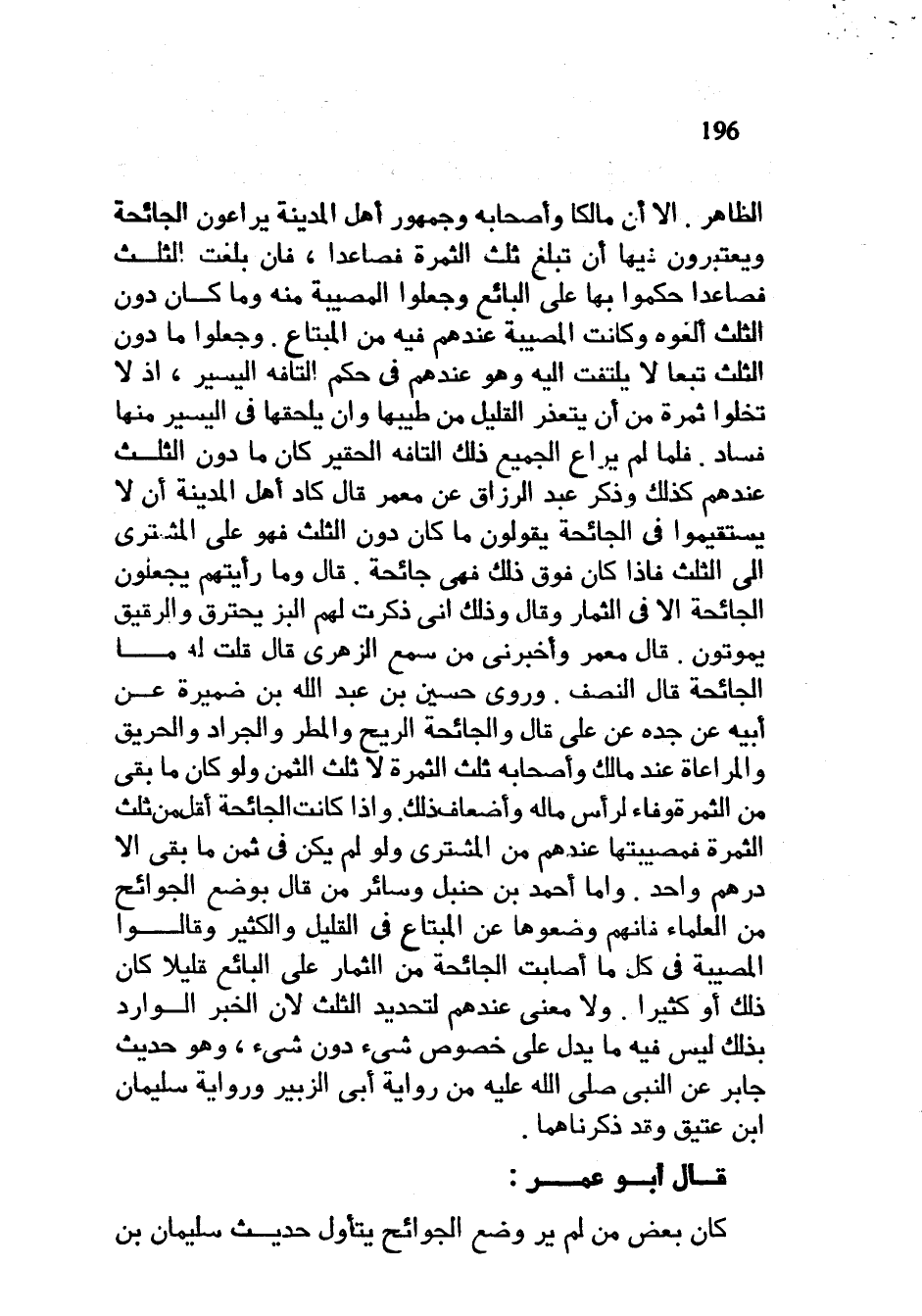 الظَّاهِرِ إِلَّا أَنَّ مَالِكًا وَأَصْحَابَهُ وَجُمْهُورَ أَهْلِ الْمَدِينَةِ يُرَاعُونَ الْجَائِحَةَ وَيَعْتَبِرُونَ فِيهَا أَنْ تَبْلُغَ ثُلُثَ الثَّمَرَةِ فَصَاعِدًا فَإِنْ بَلَغَتِ الثُّلُثَ فَصَاعِدًا حَكَمُوا بِهَا عَلَى الْبَائِعِ وَجَعَلُوا الْمُصِيبَةَ مِنْهُ وَمَا كَانَ دُونَ الثُّلْثِ أَلْغَوْهُ وَكَانَتِ الْمُصِيبَةُ عِنْدَهُمْ فِيهِ مِنَ الْمُبْتَاعِ وَجَعَلُوا مَا دُونَ الثُّلُثِ تَبَعًا لَا يُلْتَفَتُ إِلَيْهِ وَهُوَ عِنْدُهُمْ فِي حُكْمِ التَّافِهِ الْيَسِيرِ إِذْ لَا تَخْلُو ثَمَرَةٌ مِنْ أَنْ يَتَعَذَّرَ الْقَلِيلُ مِنْ طِيبِهَا وَأَنْ يَلْحَقَهَا فِي الْيَسِيرِ مِنْهَا فَسَادٌ فَلَمَّا لَمْ يُرَاعِ الْجَمِيعُ ذَلِكَ التَّافِهَ الْحَقِيرَ كَانَ مَا دُونَ الثُّلْثِ عِنْدَهُمْ كَذَلِكَ وَذَكَرَ عَبْدُ الرَّزَّاقِ عَنْ مَعْمَرٍ قَالَ كَادَ أَهْلُ الْمَدِينَةِ أَنْ لَا يَسْتَقِيمُوا فِي الْجَائِحَةِ يَقُولُونَ مَا كَانَ دُونَ الثُّلُثِ فَهُوَ عَلَى الْمُشْتَرِي إِلَى الثُّلُثِ فَإِذَا كَانَ فَوْقَ ذَلِكَ فَهِيَ جَائِحَةٌ قَالَ وَمَا رَأَيْتُهُمْ يَجْعَلُونَ الْجَائِحَةَ إِلَّا فِي الثِّمَارِ وَقَالَ وَذَلِكَ أَنِّي ذَكَرْتُ لَهُمُ الْبَزَّ يَحْتَرِقُ وَالرَّقِيقَ يَمُوتُونَ قَالَ مَعْمَرٌ وَأَخْبَرَنِي مَنْ سَمِعَ الزُّهْرِيَّ قَالَ قُلْتُ لَهُ مَا الْجَائِحَةُ قَالَ النِّصْفُ وَرَوَى حُسَيْنُ بْنُ عَبْدِ اللَّهِ بْنِ ضُمَيْرَةَ عَنْ أَبِيهِ عَنْ جَدِّهِ عَنْ عَلِيٍّ قَالَ وَالْجَائِحَةُ الرِّيحُ وَالْمَطَرُ وَالْجَرَادُ وَالْحَرِيقُ وَالْمُرَاعَاةُ عِنْدَ مَالِكٍ وَأَصْحَابِهِ ثُلُثُ الثَّمَرَةِ لَا ثُلُثُ الثَّمَنِ وَلَوْ كَانَ مَا بَقِيَ مِنَ الثمرة وفاء لرأسماله وَأَضْعَافَ ذَلِكَ وَإِذَا كَانَتِ الْجَائِحَةُ أَقَلَّ مِنْ ثُلُثِ الثَّمَرَةِ فَمُصِيبَتُهَا عِنْدَهُمْ مِنَ الْمُشْتَرِي وَلَوْ لَمْ يَكُنْ فِي ثَمَنِ مَا بَقِيَ إِلَّا دِرْهَمٌ وَاحِدٌ وَأَمَّا أَحْمَدُ بْنُ حَنْبَلٍ وَسَائِرُ مَنْ قَالَ بِوَضْعِ الْجَوَائِحِ مِنَ الْعُلَمَاءِ فَإِنَّهُمْ وَضَعُوهَا عَنِ الْمُبْتَاعِ فِي الْقَلِيلِ وَالْكَثِيرِ وَقَالُوا الْمُصِيبَةُ فِي كُلِّ مَا أَصَابَتِ الْجَائِحَةُ مِنَ الثِّمَارِ عَلَى الْبَائِعِ قَلِيلًا كَانَ ذَلِكَ أَوْ كَثِيرًا وَلَا مَعْنًى عِنْدَهُمْ لِتَحْدِيدِ الثُّلُثِ لِأَنَّ الْخَبَرَ الْوَارِدَ بِذَلِكَ لَيْسَ فِيهِ مَا يَدُلُّ عَلَى خُصُوصِ شَيْءٍ دُونَ شَيْءٍ وَهُوَ حَدِيثُ جَابِرٍ عَنِ النَّبِيِّ صَلَّى اللَّهُ عَلَيْهِ وَسَلَّمَ من رواية أبي الزبير ورواية سليمان ابن عَتِيقٍ وَقَدْ ذَكَرْنَاهُمَا قَالَ أَبُو عُمَرَ كَانَ بَعْضُ مَنْ لَمْ يَرَ وَضْعَ الْجَوَائِحِ يَتَأَوَّلُ حَدِيثُ سُلَيْمَانَ بْنِ