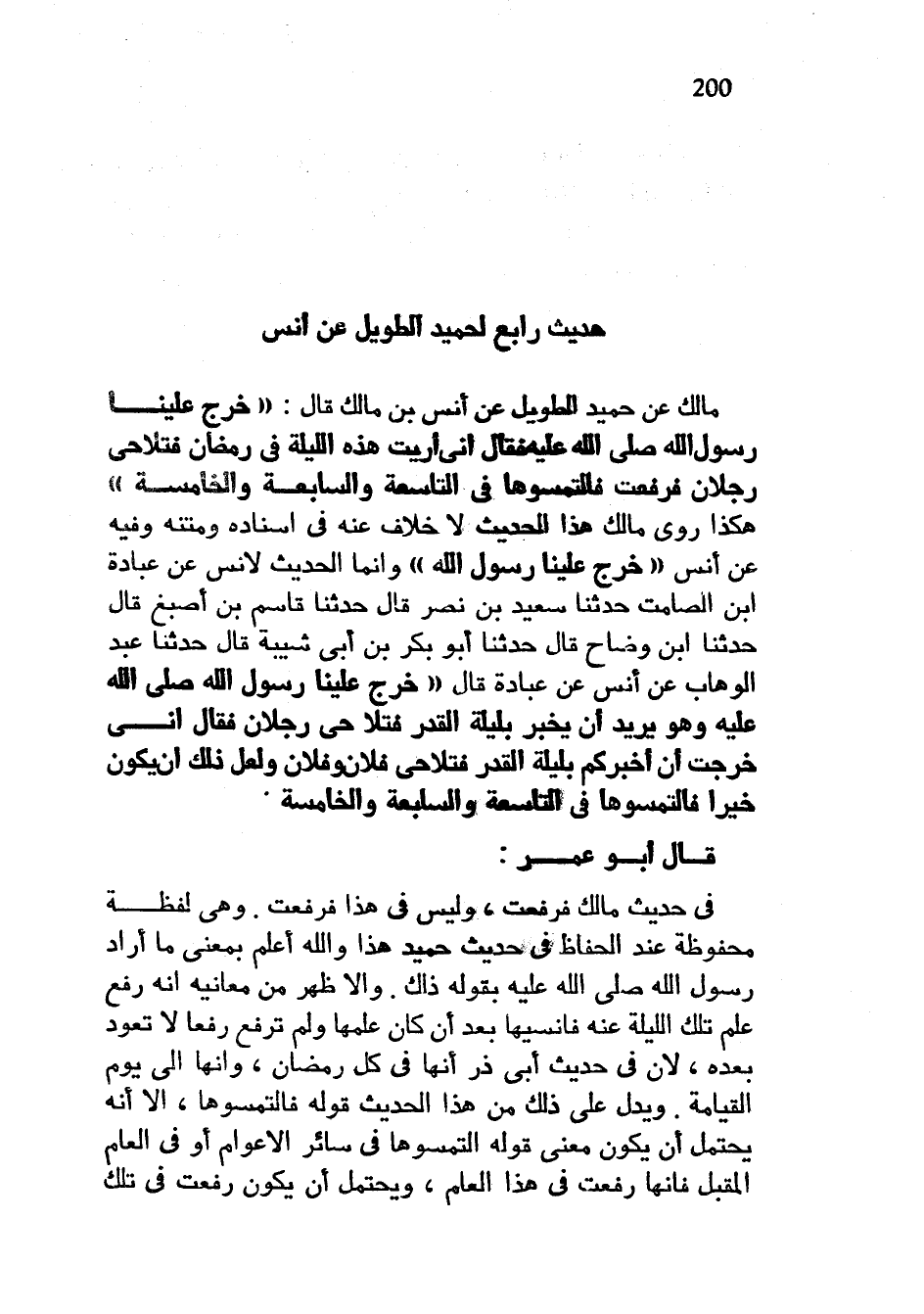 حَدِيثٌ رَابِعٌ لِحُمَيْدٍ الطَّوِيلِ عَنْ أَنَسٍ مَالِكٌ عَنْ حُمَيْدٍ الطَّوِيلِ عَنْ أَنَسِ بْنِ مَالِكٍ قَالَ خَرَجَ عَلَيْنَا رَسُولُ اللَّهِ صَلَّى اللَّهُ عَلَيْهِ وَسَلَّمَ فَقَالَ إِنِّي أُرِيتُ هَذِهِ اللَّيْلَةَ فِي رَمَضَانَ فَتَلَاحَى رَجُلَانِ فَرُفِعَتْ فَالْتَمِسُوهَا فِي التَّاسِعَةِ وَالسَّابِعَةِ وَالْخَامِسَةِ هَكَذَا رَوَى مَالِكٌ هَذَا الْحَدِيثَ لَا خِلَافَ عَنْهُ فِي إِسْنَادِهِ وَمَتْنِهِ وَفِيهِ عَنْ أَنَسٍ خَرَجَ عَلَيْنَا رَسُولُ اللَّهِ وإنما الحديث لأنس عن عبادة ابن الصَّامِتِ حَدَّثَنَا سَعِيدُ بْنُ نَصْرٍ قَالَ حَدَّثَنَا قَاسِمُ بْنُ أَصْبَغَ قَالَ حَدَّثَنَا ابْنُ وَضَّاحٍ قَالَ حَدَّثَنَا أَبُو بَكْرِ بْنُ أَبِي شَيْبَةَ قَالَ حَدَّثَنَا عَبْدُ الْوَهَّابِ عَنْ أَنَسٍ عَنْ عُبَادَةَ قَالَ خَرَجَ عَلَيْنَا رَسُولُ اللَّهِ صَلَّى اللَّهُ عَلَيْهِ وَسَلَّمَ وَهُوَ يُرِيدُ أَنْ يُخْبِرَ بِلَيْلَةِ الْقَدْرِ فَتَلَاحَى رَجُلَانِ فَقَالَ إِنِّي خَرَجْتُ أَنْ أُخْبِرَكُمْ بِلَيْلَةِ الْقَدْرِ فَتَلَاحَى فُلَانٌ وَفُلَانٌ وَلَعَلَّ ذَلِكَ أَنْ يَكُونَ خَيْرًا فَالْتَمِسُوهَا فِي التَّاسِعَةِ وَالسَّابِعَةِ وَالْخَامِسَةِ قَالَ أَبُو عُمَرَ فِي حَدِيثِ مَالِكٍ فَرُفِعَتْ وَلَيْسَ فِي هَذَا فَرُفِعَتْ وَهِيَ لَفْظَةٌ مَحْفُوظَةٌ عِنْدَ الْحُفَّاظِ فِي حَدِيثِ حُمَيْدٍ هَذَا وَاللَّهُ أَعْلَمُ بِمَعْنَى مَا أَرَادَ رَسُولُ اللَّهِ صَلَّى اللَّهُ عَلَيْهِ وَسَلَّمَ بِقَوْلِهِ ذلك وإلا ظهر مِنْ مَعَانِيهِ أَنَّهُ رُفِعَ عِلْمُ تِلْكَ اللَّيْلَةِ عَنْهُ فَأُنْسِيَهَا بَعْدَ أَنْ كَانَ عَلِمَهَا وَلَمْ تُرْفَعْ رَفْعًا لَا تَعُودُ بَعْدَهُ لِأَنَّ فِي حَدِيثِ أَبِي ذَرٍ أَنَّهَا فِي كُلِّ رَمَضَانَ وَأَنَّهَا إِلَى يَوْمِ الْقِيَامَةِ وَيَدُلُّ عَلَى ذَلِكَ مِنْ هَذَا الْحَدِيثِ قَوْلُهُ فَالْتَمِسُوهَا إِلَّا أَنَّهُ يُحْتَمَلُ أَنْ يَكُونَ مَعْنَى قَوْلِهِ الْتَمِسُوهَا فِي سَائِرِ الْأَعْوَامِ أَوْ فِي الْعَامِ الْمُقْبِلِ فَإِنَّهَا رُفِعَتْ فِي هَذَا الْعَامِ وَيُحْتَمَلُ أَنْ يَكُونَ رُفِعَتْ فِي تِلْكَ