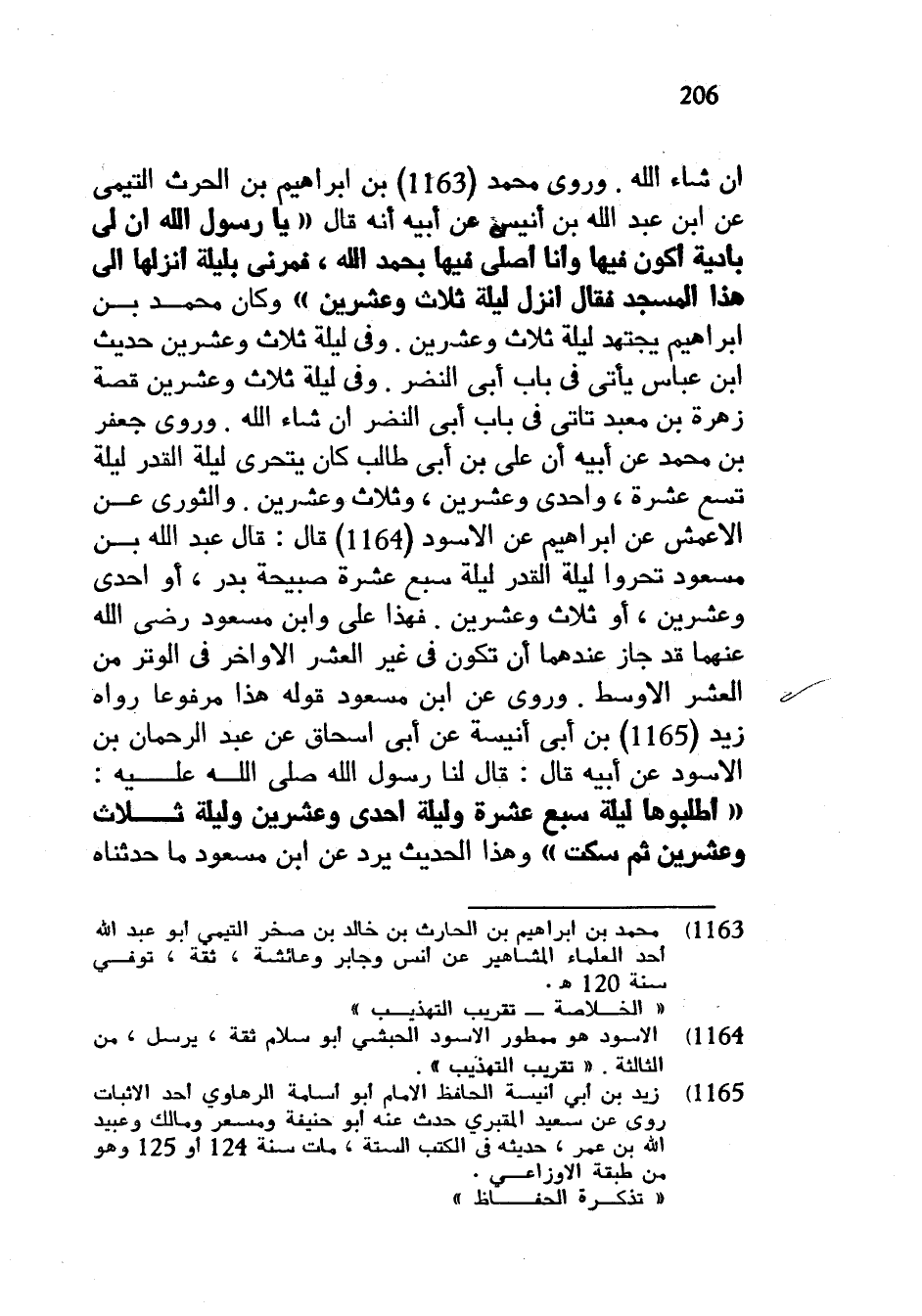 إِنْ شَاءَ اللَّهُ وَرَوَى مُحَمَّدُ بْنُ إِبْرَاهِيمَ بن الحرث التَّيْمِيُّ عَنِ ابْنِ عَبْدِ اللَّهِ بْنِ أُنَيْسٍ عَنْ أَبِيهِ أَنَّهُ قَالَ يَا رَسُولَ اللَّهِ إِنَّ لِي بَادِيَةً أَكُونُ فِيهَا وَأَنَا أُصَلِّي فِيهَا بِحَمْدِ اللَّهِ فَمُرْنِي بِلَيْلَةٍ أَنْزِلُهَا إِلَى هَذَا الْمَسْجِدِ فَقَالَ انْزِلْ لَيْلَةَ ثَلَاثٍ وَعِشْرِينَ وَكَانَ مُحَمَّدُ بْنُ إِبْرَاهِيمَ يَجْتَهِدُ لَيْلَةَ ثَلَاثٍ وَعِشْرِينَ وَفِي لَيْلَةِ ثَلَاثٍ وَعِشْرِينَ حَدِيثُ ابْنِ عَبَّاسٍ يَأْتِي فِي بَابِ أَبِي النَّضْرِ وَفِي لَيْلَةِ ثَلَاثٍ وَعِشْرِينَ قِصَّةُ زُهْرَةَ بْنِ مَعْبَدٍ تَأْتِي فِي بَابِ أَبِي النَّضْرِ إِنْ شَاءَ اللَّهُ وَرَوَى جَعْفَرُ بْنُ مُحَمَّدٍ عَنْ أَبِيهِ أَنَّ عَلِيَّ بْنَ أَبِي طَالِبٍ كَانَ يَتَحَرَّى لَيْلَةَ الْقَدْرِ لَيْلَةَ تِسْعَ عَشْرَةَ وَإِحْدَى وَعِشْرِينَ وَثَلَاثٍ وَعِشْرِينَ وَالثَّوْرِيُّ عَنِ الْأَعْمَشِ عَنْ إِبْرَاهِيمَ عَنِ الْأَسْوَدِ قَالَ قَالَ عَبْدُ اللَّهِ بْنُ مَسْعُودٍ تَحَرَّوْا لَيْلَةَ الْقَدْرِ لَيْلَةَ سَبْعَ عَشْرَةَ صَبِيحَةَ بَدْرٍ أَوْ إِحْدَى وَعِشْرِينَ أَوْ ثَلَاثٍ وَعِشْرِينَ فَهَذَا عَلِيٌّ وَابْنُ مَسْعُودٍ رَضِيَ اللَّهُ عَنْهُمَا قَدْ جَازَ عِنْدَهُمَا أَنْ تَكُونَ فِي غَيْرِ الْعَشْرِ الْأَوَاخِرِ فِي الْوِتْرِ مِنَ الْعَشْرِ الْأَوْسَطِ وَرُوِيَ عَنِ ابْنِ مَسْعُودٍ قَوْلُهُ هَذَا مَرْفُوعًا رَوَاهُ زَيْدُ بْنُ أَبِي أُنَيْسَةَ عَنْ أَبِي إِسْحَاقَ عن عبد الرحمان بْنِ الْأَسْوَدِ عَنْ أَبِيهِ قَالَ قَالَ لَنَا رَسُولُ اللَّهِ صَلَّى اللَّهُ عَلَيْهِ وَسَلَّمَ اطْلُبُوهَا لَيْلَةَ سَبْعَ عَشْرَةَ وَلَيْلَةَ إِحْدَى وَعِشْرِينَ وَلَيْلَةَ ثَلَاثٍ وَعِشْرِينَ ثُمَّ سَكَتَ وَهَذَا الْحَدِيثُ يَرِدُ عَنِ ابْنِ مَسْعُودٍ مَا حَدَّثَنَاهُ