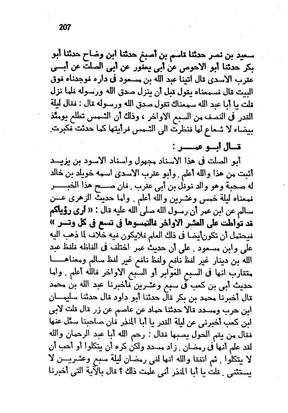 سَعِيدُ بْنُ نَصْرٍ حَدَّثَنَا قَاسِمُ بْنُ أَصْبَغَ حَدَّثَنَا ابْنُ وَضَّاحٍ حَدَّثَنَا أَبُو بَكْرٍ حَدَّثَنَا أَبُو الْأَحْوَصِ عَنْ أَبِي يَعْفُورٍ عَنْ أَبِي الصَّلْتِ عَنْ أَبِي عَقْرَبٍ الْأَسَدِيِّ قَالَ أَتَيْنَا عَبْدَ اللَّهِ بْنَ مَسْعُودٍ فِي دَارِهِ فَوَجَدْنَاهُ فَوْقَ الْبَيْتِ قَالَ فَسَمِعْنَاهُ يَقُولُ قَبْلَ أَنْ يَنْزِلَ صَدَقَ اللَّهُ وَرَسُولُهُ فَلَمَّا نَزَلَ قُلْتُ يَا أَبَا عَبْدِ اللَّهِ سَمِعْنَاكَ تَقُولُ صَدَقَ اللَّهُ وَرَسُولُهُ قَالَ فَقَالَ لَيْلَةُ الْقَدْرِ فِي النِّصْفِ مِنَ السَّبْعِ الْأَوَاخِرِ وَذَلِكَ أَنَّ الشَّمْسَ تَطْلُعُ يَوْمَئِذٍ بَيْضَاءَ لَا شُعَاعَ لَهَا فَنَظَرْتُ إِلَى الشَّمْسِ فَرَأَيْتُهَا كَمَا حَدَّثْتَ فَكَبَّرْتُ قَالَ أَبُو عُمَرَ أَبُو الصَّلْتِ فِي هَذَا الْإِسْنَادِ مَجْهُولٌ وَإِسْنَادُ الْأَسْوَدِ بْنِ يَزِيدَ أَثْبَتُ مِنْ هَذَا وَاللَّهُ أَعْلَمُ وَأَبُو عَقْرَبٍ الْأَسَدِيُّ اسْمُهُ خُوَيْلِدُ بْنُ خَالِدٍ لَهُ صُحْبَةٌ وَهُوَ وَالِدُ نَوْفَلِ بْنِ أَبِي عَقْرَبٍ فَإِنْ صَحَّ هَذَا الْخَبَرُ فَمَعْنَاهُ لَيْلَةَ خَمْسٍ وَعِشْرِينَ وَاللَّهُ أَعْلَمُ وَأَمَّا حَدِيثُ الزُّهْرِيِّ عَنْ سَالِمٍ عَنِ ابْنِ عُمَرَ أَنَّ رَسُولَ اللَّهِ صَلَّى اللَّهُ عَلَيْهِ وسلم قال أرى رؤياكم قد تواطت عَلَى الْعَشْرِ الْأَوَاخِرِ فَالْتَمِسُوهَا فِي تِسْعٍ فِي كُلِّ وِتْرٍ فَيُحْتَمَلُ أَنْ تَكُونَ أَيْضًا فِي ذَلِكَ الْعَامِ فَلَا يَكُونُ فِيهِ خِلَافٌ لِمَا ذَهَبَ إِلَيْهِ عَلِيٌّ وَابْنُ مَسْعُودٍ عَلَى أَنَّ حَدِيثَ عُمَرَ اخْتُلِفَ فِي أَلْفَاظِهِ فَلَفْظُ عَبْدِ اللَّهِ بْنِ دِينَارٍ غَيْرُ لَفْظِ نَافِعٍ وَلَفْظُ نَافِعٍ غَيْرُ لَفْظِ سَالِمٍ وَمَعْنَاهَا مُتَقَارِبٌ أَنَّهَا فِي السَّبْعِ الْغَوَابِرِ أَوِ السَّبْعِ الْأَوَاخِرِ فَاللَّهُ أَعْلَمُ وَأَمَّا حَدِيثُ أُبَيِّ بْنِ كَعْبٍ فِي سَبْعٍ وَعِشْرِينَ فَأَخْبَرَنَا عَبْدُ اللَّهِ بْنُ مُحَمَّدٍ قَالَ أَخْبَرَنَا مُحَمَّدُ بْنُ بَكْرٍ قَالَ حَدَّثَنَا أَبُو دَاوُدَ قَالَ حدثنا سليمان ابن حَرْبٍ وَمُسَدَّدٌ قَالَا حَدَّثَنَا حَمَّادٌ عَنْ عَاصِمٍ عن زر قال قلت لأبي ابن كَعْبٍ أَخْبِرْنِي عَنْ لَيْلَةِ الْقَدْرِ يَا أَبَا الْمُنْذِرِ فَإِنَّ صَاحِبَنَا سُئِلَ عَنْهَا فَقَالَ مَنْ يَقُمِ الْحَوْلَ يُصِبْهَا فَقَالَ رَحِمَ اللَّهُ أَبَا عبد الرحمان وَاللَّهِ لَقَدْ عَلِمَ أَنَّهَا فِي رَمَضَانَ زَادَ مُسَدَّدٌ وَلَكِنْ كَرِهَ أَنْ يَتَّكِلُوا أَوْ أَحَبَّ أَنْ لَا يَتَّكِلُوا ثُمَّ اتَّفَقَا وَاللَّهِ إِنَّهَا لَفِي رَمَضَانَ لَيْلَةَ سَبْعٍ وَعِشْرِينَ لَا يُسْتَثْنَى قُلْتُ يَا أَبَا الْمُنْذِرِ أَنَّى عَلِمْتَ ذَلِكَ قَالَ بِالْآيَةِ الَّتِي أَخْبَرَنَا