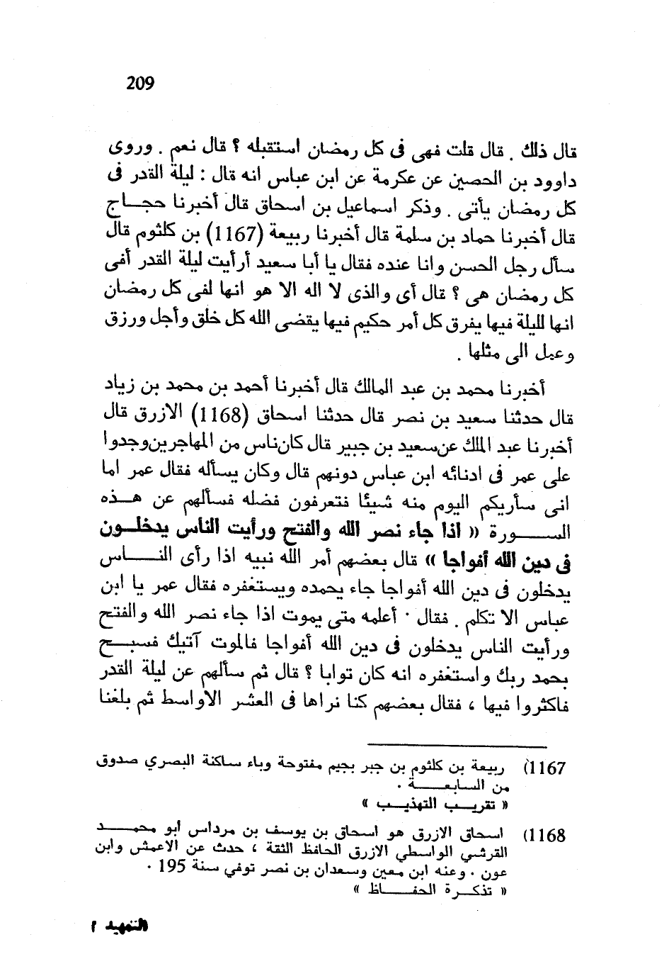 قَالَ ذَلِكَ قَالَ قُلْتُ فَهِيَ فِي كُلِّ رَمَضَانَ أَسْتَقْبِلُهُ قَالَ نَعَمْ وَرَوَى دَاوُدُ بْنُ الْحُصَيْنِ عَنْ عِكْرِمَةَ عَنِ ابْنِ عَبَّاسٍ أَنَّهُ قَالَ لَيْلَةُ الْقَدْرِ فِي كُلِّ رَمَضَانَ يَأْتِي وَذَكَرَ إِسْمَاعِيلُ بْنُ إِسْحَاقَ قَالَ أَخْبَرَنَا حَجَّاجٌ قَالَ أَخْبَرَنَا حَمَّادُ بْنُ سَلَمَةَ قَالَ أَخْبَرَنَا رَبِيعَةُ بْنُ كُلْثُومٍ قَالَ سَأَلَ رَجُلٌ الْحَسَنَ وَأَنَا عِنْدَهُ فَقَالَ يَا أَبَا سَعِيدٍ أَرَأَيْتَ لَيْلَةَ الْقَدْرِ أَفِي كُلِّ رَمَضَانَ هِيَ قَالَ إِي وَالَّذِي لَا إِلَهَ إِلَّا هُوَ إِنَّهَا لَفِي كُلِّ رَمَضَانَ إِنَّهَا لَلَيْلَةٌ فِيهَا يُفْرَقُ كُلُّ أَمْرٍ حَكِيمٍ فِيهَا يَقْضِي اللَّهُ كُلَّ خَلْقٍ وَأَجَلٍ وَرِزْقٍ وَعَمِلٍ إِلَى مِثْلِهَا أَخْبَرَنَا مُحَمَّدُ بْنُ عَبْدِ الْمَالِكِ قَالَ أَخْبَرَنَا أَحْمَدُ بْنُ مُحَمَّدِ بْنِ زِيَادٍ قَالَ حَدَّثَنَا سَعِيدُ بْنُ نَصْرٍ قَالَ حَدَّثَنَا إِسْحَاقُ الْأَزْرَقُ قَالَ أَخْبَرَنَا عَبْدُ الْمَلِكِ عَنْ سَعِيدِ بْنِ جُبَيْرٍ قَالَ كَانَ نَاسٌ مِنَ الْمُهَاجِرِينَ وَجَدُوا عَلَى عُمَرَ فِي إِدْنَائِهِ ابْنَ عَبَّاسٍ دُونَهُمْ قَالَ وَكَانَ يَسْأَلُهُ فَقَالَ عُمَرُ أَمَا إِنِّي سَأُرِيكُمُ الْيَوْمَ مِنْهُ شَيْئًا فَتَعْرِفُونَ فَضْلَهُ فَسَأَلَهُمْ عَنْ هَذِهِ السُّورَةِ إِذَا جَاءَ نَصْرُ اللَّهِ وَالْفَتْحُ وَرَأَيْتَ النَّاسَ يَدْخُلُونَ فِي دِينِ اللَّهِ أَفْوَاجًا قَالَ بَعْضُهُمْ أَمَرَ اللَّهُ نَبِيَّهُ إِذَا رَأَى النَّاسَ يَدْخُلُونَ فِي دِينِ اللَّهِ أَفْوَاجًا جَاءَ يَحْمَدُهُ وَيَسْتَغْفِرُهُ فَقَالَ عُمَرُ يَا ابْنَ عَبَّاسٍ أَلَا تَكَلَّمُ فَقَالَ أَعْلَمَهُ مَتَى يَمُوتُ إِذَا جَاءَ نَصْرُ اللَّهِ وَالْفَتْحُ وَرَأَيْتَ النَّاسَ يَدْخُلُونَ فِي دِينِ اللَّهِ أَفْوَاجًا فَالْمَوْتُ آتِيكَ فَسَبِّحْ بحمد ربك واستغفره إنه كان توبا قَالَ ثُمَّ سَأَلَهُمْ عَنْ لَيْلَةِ الْقَدْرِ فَأَكْثَرُوا فِيهَا فَقَالَ بَعْضُهُمْ كُنَّا نَرَاهَا فِي الْعَشْرِ الْأَوَاسِطِ ثُمَّ بَلَغَنَا