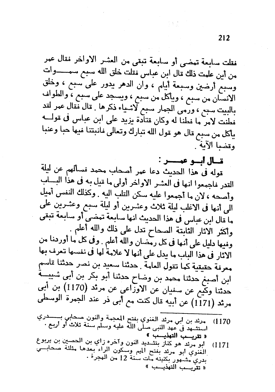 فَقُلْتُ سَابِعَةٌ تَمْضِي أَوْ سَابِعَةٌ تَبْقَى مِنَ الْعَشْرِ الْأَوَاخِرِ فَقَالَ عُمَرُ مِنْ أَيْنَ عَلِمْتَ ذَلِكَ قَالَ ابْنُ عَبَّاسٍ فَقُلْتُ خَلَقَ اللَّهُ سبع سموات وَسَبْعَ أَرَضِينَ وَسَبْعَةَ أَيَّامٍ وَإِنَّ الدَّهْرَ يَدُورُ عَلَى سَبْعٍ وَخُلِقَ الْإِنْسَانُ مِنْ سَبْعٍ وَيَأْكُلُ مِنْ سَبْعٍ وَيَسْجُدُ عَلَى سَبْعٍ وَالطَّوَافُ بِالْبَيْتِ سَبْعٌ وَرَمْيُ الْجِمَارِ سَبْعٌ لِأَشْيَاءَ ذَكَرَهَا قَالَ فَقَالَ عُمَرُ لَقَدْ فَطِنْتَ لِأَمْرٍ مَا فَطِنَّا لَهُ وَكَانَ قَتَادَةُ يَزِيدُ عَلَى ابْنِ عَبَّاسٍ فِي قَوْلِهِ يَأْكُلُ مِنْ سَبْعٍ قَالَ هُوَ قَوْلُ اللَّهِ تَبَارَكَ وَتَعَالَى فَأَنْبَتْنَا فِيهَا حَبًّا وَعِنَبًا وَقَضْبًا الْآيَةَ قَالَ أَبُو عُمَرَ قَوْلُهُ فِي هَذَا الْحَدِيثِ دَعَا عُمَرُ أَصْحَابَ مُحَمَّدٍ فَسَأَلَهُمْ عَنْ لَيْلَةِ الْقَدْرِ فَأَجْمَعُوا أَنَّهَا فِي الْعَشْرِ الْأَوَاخِرِ أَوْلَى مَا قِيلَ بِهِ فِي هَذَا الْبَابِ وَأَصَحُّهُ لِأَنَّ مَا أَجْمَعُوا عَلَيْهِ سَكَنَ الْقَلْبُ إِلَيْهِ وَكَذَلِكَ النَّفْسُ أَمْيَلُ إِلَى أَنَّهَا فِي الْأَغْلَبِ لَيْلَةُ ثَلَاثٍ وَعِشْرِينَ أَوْ لَيْلَةُ سَبْعٍ وَعِشْرِينَ عَلَى مَا قَالَ ابْنُ عَبَّاسٍ فِي هَذَا الْحَدِيثِ إِنَّهَا سَابِعَةٌ تَمْضِي أَوْ سَابِعَةٌ تَبْقَى وَأَكْثَرُ الْآثَارِ الثَّابِتَةِ الصِّحَاحِ تَدُلُّ عَلَى ذَلِكَ وَاللَّهُ أَعْلَمُ وَفِيهَا دَلِيلٌ عَلَى أَنَّهَا فِي كُلِّ رَمَضَانَ وَاللَّهُ أَعْلَمُ وَفِي كُلِّ مَا أَوْرَدْنَا مِنَ الْآثَارِ فِي هَذَا الْبَابِ مَا يَدُلُّ عَلَى أَنَّهَا لَا عَلَامَةَ لَهَا فِي نَفْسِهَا تُعْرَفُ بِهَا مَعْرِفَةً حَقِيقِيَّةً كَمَا تَقُولُ الْعَامَّةُ حَدَّثَنَا سَعِيدُ بْنُ نَصْرٍ حَدَّثَنَا قَاسِمُ بْنُ أَصْبَغَ حَدَّثَنَا مُحَمَّدُ بْنُ وَضَّاحٍ حَدَّثَنَا أَبُو بَكْرِ بْنُ أَبِي شَيْبَةَ حَدَّثَنَا وَكِيعٌ عَنْ سُفْيَانَ عَنِ الْأَوْزَاعِيِّ عَنْ مَرْثَدِ بْنِ أَبِي مَرْثَدٍ عَنْ أَبِيهِ قَالَ كُنْتُ مَعَ أَبِي ذَرٍّ عِنْدَ الْجَمْرَةِ الوسطى