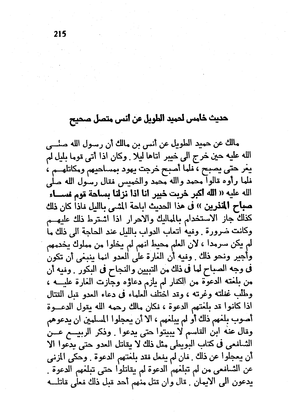 حَدِيثٌ خَامِسٌ لِحُمَيْدٍ الطَّوِيلِ عَنْ أَنَسٍ مُتَّصِلٌ صَحِيحٌ مَالِكٌ عَنْ حُمَيْدٍ الطَّوِيلِ عَنْ أَنَسِ بْنِ مَالِكٍ أَنَّ رَسُولَ اللَّهِ صَلَّى اللَّهُ عَلَيْهِ وَسَلَّمَ حِينَ خَرَجَ إِلَى خَيْبَرَ أَتَاهَا لَيْلًا وَكَانَ إِذَا أَتَى قَوْمًا بِلَيْلٍ لَمْ يُغِرْ حَتَّى يُصْبِحَ فَلَمَّا أَصْبَحَ خَرَجَتْ يَهُودُ بِمِسَاحِيهِمْ وَمَكَاتِلِهِمْ فَلَمَّا رَأَوْهُ قَالُوا مُحَمَّدٌ وَاللَّهِ مُحَمَّدٌ وَالْخَمِيسُ فَقَالَ رَسُولُ اللَّهِ صَلَّى اللَّهُ عَلَيْهِ وَسَلَّمَ اللَّهُ أَكْبَرُ خَرِبَتْ خَيْبَرُ إِنَّا إِذَا نَزَلْنَا بِسَاحَةِ قَوْمٍ فَسَاءَ صَبَاحُ الْمُنْذَرِينَ فِي هَذَا الْحَدِيثِ إِبَاحَةُ الْمَشْيِ بِاللَّيْلِ فَإِذَا كَانَ ذَلِكَ كَذَلِكَ جَازَ الِاسْتِخْدَامُ بِالْمَمَالِيكِ وَالْأَحْرَارِ إِذَا اشْتَرَطَ ذَلِكَ عَلَيْهِمْ وَكَانَتْ ضَرُورَةً وَفِيهِ إِتْعَابُ الدَّوَابِّ بِاللَّيْلِ عِنْدَ الْحَاجَةِ إِلَى ذَلِكَ مَا لَمْ يَكُنْ سَرْمَدًا لِأَنَّ الْعِلْمَ مُحِيطٌ أَنَّهُمْ لَمْ يَخْلُوا مِنْ مَمْلُوكٍ يَخْدِمُهُمْ وَأَجِيرٍ وَنَحْوِ ذَلِكَ وَفِيهِ أَنَّ الْغَارَةَ عَلَى الْعَدُوِّ إِنَّمَا يَنْبَغِي أَنْ تَكُونَ فِي وَجْهِ الصَّبَاحِ لِمَا فِي ذَلِكَ مِنَ التَّبْيِينِ وَالنَّجَاحِ فِي الْبُكُورِ وَفِيهِ أَنَّ مَنْ بَلَغَتْهُ الدَّعْوَةُ مِنَ الْكُفَّارِ لَمْ يَلْزَمْ دُعَاؤُهُ وَجَازَتِ الْغَارَةُ عَلَيْهِ وَطَلَبُ غَفْلَتِهِ وَغُرَّتِهِ وَقَدِ اخْتَلَفَ الْعُلَمَاءُ فِي دُعَاءِ الْعَدُوِّ قَبْلَ الْقِتَالِ إِذَا كَانُوا قَدْ بَلَغَتْهُمُ الدَّعْوَةُ فَكَانَ مَالِكٌ رَحِمَهُ اللَّهُ يَقُولُ الدَّعْوَةُ أَصْوَبُ بَلَغَهُمْ ذَلِكَ أَوْ لَمْ يَبْلُغْهُمْ إِلَّا أَنْ يُعْجِلُوا الْمُسْلِمِينَ أَنْ يَدْعُوهُمْ وَقَالَ عنه ابن القاسم لا يبيتوا حتى يدعو وَذَكَرَ الرَّبِيعُ عَنِ الشَّافِعِيِّ فِي كِتَابِ الْبُوَيْطِيِّ مِثْلَ ذَلِكَ لَا يُقَاتَلُ الْعَدُوُّ حَتَّى يُدْعَوْا إِلَّا أَنْ يَعْجَلُوا عَنْ ذَلِكَ فَإِنْ لَمْ يَفْعَلْ فَقَدْ بَلَغَتْهُمُ الدَّعْوَةُ وَحَكَى الْمُزَنِيُّ عَنِ الشَّافِعِيِّ مَنْ لَمْ تَبْلُغْهُمُ الدَّعْوَةُ لَمْ يُقَاتَلُوا حَتَّى تَبْلُغَهُمُ الدَّعْوَةُ يُدْعَوْنَ إِلَى الْإِيمَانِ قَالَ وَإِنْ قُتِلَ مِنْهُمْ أَحَدٌ قَبْلَ ذَلِكَ فَعَلَى قاتله
