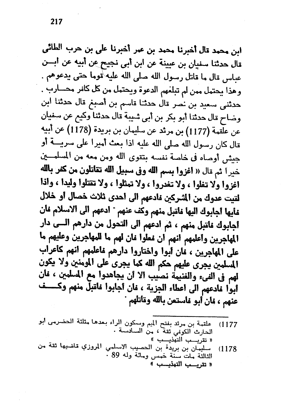 ابن مُحَمَّدٍ قَالَ أَخْبَرَنَا مُحَمَّدُ بْنُ عُمَرَ أَخْبَرَنَا عَلِيُّ بْنُ حَرْبٍ الطَّائِيُّ قَالَ حَدَّثَنَا سُفْيَانُ بْنُ عُيَيْنَةَ عَنِ ابْنِ أَبِي نَجِيحٍ عَنْ أَبِيهِ عَنِ ابْنِ عَبَّاسٍ قَالَ مَا قَاتَلَ رَسُولُ اللَّهِ صَلَّى اللَّهُ عَلَيْهِ وَسَلَّمَ قَوْمًا حَتَّى يَدْعُوَهُمْ وَهَذَا يُحْتَمَلُ مِمَّنْ لَمْ تَبْلُغْهُمُ الدَّعْوَةُ وَيُحْتَمَلُ مِنْ كُلِّ كَافِرٍ مُحَارِبٍ حَدَّثَنِي سَعِيدُ بْنُ نَصْرٍ قَالَ حَدَّثَنَا قَاسِمُ بْنُ أَصْبَغَ قَالَ حَدَّثَنَا ابْنُ وَضَّاحٍ قَالَ حَدَّثَنَا أَبُو بَكْرِ بْنُ أَبِي شَيْبَةَ قَالَ حَدَّثَنَا وَكِيعٌ عَنْ سُفْيَانَ عَنْ عَلْقَمَةَ بْنِ مَرْثَدٍ عَنْ سُلَيْمَانَ بْنِ بُرَيْدَةَ عَنْ أَبِيهِ قَالَ كَانَ رَسُولُ اللَّهِ صَلَّى اللَّهُ عَلَيْهِ وَسَلَّمَ إِذَا بَعَثَ أَمِيرًا عَلَى سَرِيَّةٍ أَوْ جَيْشٍ أَوْصَاهُ فِي خَاصَّةِ نَفْسِهِ بِتَقْوَى اللَّهِ وَمَنْ مَعَهُ مِنَ الْمُسْلِمِينَ خَيْرًا ثُمَّ قَالَ اغْزُوا بسم اللَّهِ وَفِي سَبِيلِ اللَّهِ تُقَاتِلُونَ مَنْ كَفَرَ بِاللَّهِ اغْزُوا وَلَا تَغُلُّوا وَلَا تَغْدِرُوا وَلَا تُمَثِّلُوا وَلَا تَقْتُلُوا وَلِيدًا وَإِذَا لَقِيتَ عَدُوَّكَ مِنَ الْمُشْرِكِينَ فَادْعُهُمْ إِلَى إِحْدَى ثَلَاثِ خِصَالٍ أَوْ خِلَالٍ فَأَيُّهَا أَجَابُوكَ إِلَيْهَا فَاقْبَلْ مِنْهُمْ وَكُفَّ عَنْهُمْ ادْعُهُمْ إِلَى الْإِسْلَامِ فَإِنْ أَجَابُوكَ فَاقْبَلْ مِنْهُمْ ثُمَّ ادْعُهُمْ إِلَى التَّحَوُّلِ مِنْ دارهم إلى دار المهارجين وَأَعْلِمْهُمْ أَنَّهُمْ إِنْ فَعَلُوا فَإِنَّ لَهُمْ مَا لِلْمُهَاجِرِينَ وَعَلَيْهِمْ مَا عَلَى الْمُهَاجِرِينَ فَإِنْ أَبَوْا وَاخْتَارُوا دَارَهُمْ فَأَعْلِمْهُمْ أَنَّهُمْ كَأَعْرَابِ الْمُسْلِمِينَ يَجْرِي عَلَيْهِمْ حُكْمُ اللَّهِ كَمَا يَجْرِي عَلَى الْمُؤْمِنِينَ وَلَا يَكُونُ لَهُمْ فِي الْفَيْءِ وَالْغَنِيمَةِ نَصِيبٌ إِلَّا أَنْ يُجَاهِدُوا مَعَ الْمُسْلِمِينَ فَإِنْ أَبَوْا فَادْعُهُمْ إِلَى إِعْطَاءِ الْجِزْيَةِ فَإِنْ أَجَابُوا فَاقْبَلْ مِنْهُمْ وَكُفَّ عَنْهُمْ فَإِنْ أَبَوْا فَاسْتَعِنْ بِاللَّهِ وقاتلهم