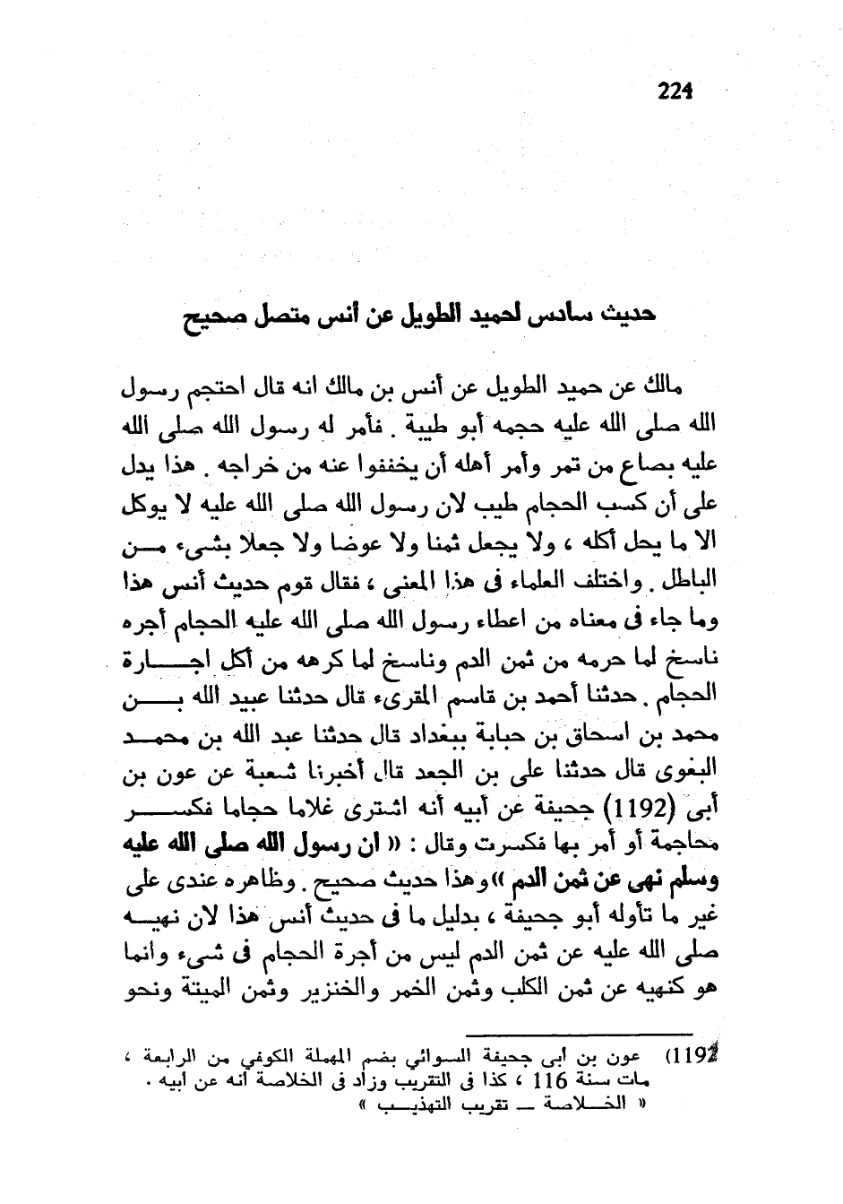 حَدِيثٌ سَادِسٌ لِحُمَيْدٍ الطَّوِيلِ عَنْ أَنَسٍ مُتَّصِلٌ صَحِيحٌ مَالِكٌ عَنْ حُمَيْدٍ الطَّوِيلِ عَنْ أَنَسِ بْنِ مَالِكٍ أَنَّهُ قَالَ احْتَجَمَ رَسُولُ اللَّهِ صَلَّى اللَّهُ عَلَيْهِ وَسَلَّمَ حَجَمَهُ أَبُو طَيْبَةَ فَأَمَرَ لَهُ رَسُولَ اللَّهِ صَلَّى اللَّهُ عَلَيْهِ وَسَلَّمَ بِصَاعٍ مِنْ تَمْرٍ وَأَمْرَ أَهْلَهُ أَنْ يُخَفِّفُوا عَنْهُ مِنْ خَرَاجِهِ هَذَا يَدُلُّ عَلَى أَنْ كَسْبَ الْحَجَّامِ طَيِّبٌ لِأَنَّ رَسُولَ اللَّهِ صَلَّى اللَّهُ عَلَيْهِ وَسَلَّمَ لَا يُوكِلُ إِلَّا مَا يَحِلُّ أَكْلُهُ وَلَا يَجْعَلُ ثَمَنًا وَلَا عِوَضًا وَلَا جُعْلًا بِشَيْءٍ مِنَ الْبَاطِلِ وَاخْتَلَفَ الْعُلَمَاءُ فِي هَذَا الْمَعْنَى فَقَالَ قَوْمٌ حَدِيثُ أَنَسٍ هَذَا وَمَا جَاءَ فِي مَعْنَاهُ مِنْ إِعْطَاءِ رَسُولِ اللَّهِ صَلَّى اللَّهُ عَلَيْهِ وَسَلَّمَ الْحَجَّامَ أَجْرَهُ نَاسِخٌ لِمَا حَرَّمَهُ مِنْ ثَمَنِ الدَّمِ وَنَاسِخٌ لِمَا كَرِهَهُ مِنْ أَكْلِ إِجَارَةِ الْحَجَّامِ حَدَّثَنَا أَحْمَدُ بْنُ قَاسِمٍ الْمُقْرِئُ قَالَ حَدَّثَنَا عُبَيْدُ اللَّهِ بْنُ مُحَمَّدِ بْنِ إِسْحَاقَ بْنِ حُبَابَةَ بِبَغْدَادَ قَالَ حَدَّثَنَا عَبْدُ اللَّهِ بْنُ مُحَمَّدٍ الْبَغَوِيُّ قَالَ حَدَّثَنَا عَلِيُّ بْنُ الْجَعْدِ قَالَ أَخْبَرَنَا شُعْبَةُ عَنْ عَوْنِ بْنِ أَبِي جُحَيْفَةَ عَنْ أَبِيهِ أَنَّهُ اشْتَرَى غُلَامًا حَجَّامًا فَكَسَرَ مَحَاجِمَهُ أَوْ أَمَرَ بِهَا فَكُسِرَتْ وَقَالَ إِنَّ رَسُولَ اللَّهِ صَلَّى اللَّهُ عَلَيْهِ وَسَلَّمَ نَهَى عَنْ ثَمَنِ الدَّمِ وَهَذَا حَدِيثٌ صَحِيحٌ وَظَاهِرُهُ عِنْدِي عَلَى غَيْرِ مَا تَأَوَّلَهُ أَبُو جُحَيْفَةَ بِدَلِيلِ مَا فِي حَدِيثِ أَنَسٍ هَذَا لِأَنَّ نَهْيَهُ صَلَّى اللَّهُ عَلَيْهِ وَسَلَّمَ عَنْ ثَمَنِ الدَّمِ لَيْسَ مِنْ أُجْرَةِ الْحَجَّامِ فِي شَيْءٍ وَإِنَّمَا هُوَ كَنَهْيِهِ عَنْ ثَمَنِ الْكَلْبِ وَثَمَنِ الْخَمْرِ وَالْخِنْزِيرِ وَثَمَنِ الْمَيْتَةِ وَنَحْوِ