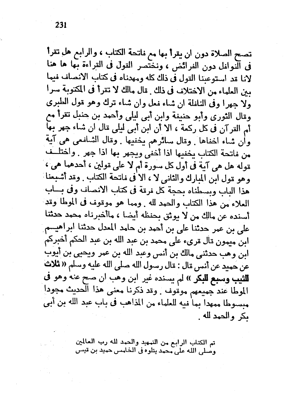 تَصِحُّ الصَّلَاةُ دُونَ أَنْ يُقْرَأَ بِهَا مَعَ فَاتِحَةِ الْكِتَابِ وَالرَّابِعُ هَلْ تُقْرَأُ فِي النَّوَافِلِ دون الفرائض ونختصر القول في القراة بها ها هنا لِأَنَّا قَدِ اسْتَوْعَبْنَا الْقَوْلَ فِي ذَلِكَ كُلِّهِ وَمَهَّدْنَاهُ فِي كِتَابِ الْإِنْصَافِ فِيمَا بَيْنَ الْعُلَمَاءِ مِنَ الِاخْتِلَافِ فِي ذَلِكَ قَالَ مَالِكٌ لَا تُقْرَأُ فِي الْمَكْتُوبَةِ سِرًّا وَلَا جَهْرًا وَفِي النَّافِلَةِ إِنْ شَاءَ فَعَلَ وَإِنْ شَاءَ تَرَكَ وَهُوَ قَوْلُ الطَّبَرَيِّ وَقَالَ الثَّوْرِيُّ وَأَبُو حَنِيفَةَ وَابْنُ أَبِي لَيْلَى وَأَحْمَدُ بْنُ حَنْبَلٍ تُقْرَأُ مَعَ أُمِّ الْقُرْآنِ فِي كُلِّ رَكْعَةٍ إِلَّا أَنَّ ابْنَ أَبِي لَيْلَى قَالَ إِنْ شَاءَ جَهَرَ بِهَا وَإِنْ شَاءَ أَخْفَاهَا وَقَالَ سَائِرُهُمْ يُخْفِيهَا وَقَالَ الشَّافِعِيُّ هِيَ آيَةٌ مِنْ فَاتِحَةِ الْكِتَابِ يُخْفِيهَا إِذَا أَخْفَى وَيَجْهَرُ بِهَا إِذَا جَهَرَ وَاخْتَلَفَ قَوْلُهُ هَلْ هِيَ آيَةٌ فِي أَوَّلِ كُلِّ سُورَةٍ أَمْ لَا عَلَى قَوْلَيْنِ أَحَدُهُمَا هِيَ وَهُوَ قَوْلُ ابْنِ الْمُبَارَكِ وَالثَّانِي لا إلا في فاتحة الكتاب وقد أشيعنا هَذَا الْبَابَ وَبَسَطْنَاهُ بِحُجَّةِ كُلِّ فِرْقَةٍ فِي كِتَابِ الْإِنْصَافِ وَفِي بَابِ الْعَلَاءِ مِنْ هَذَا الْكِتَابِ وَالْحَمْدُ لِلَّهِ وَمِمَّا هُوَ مَوْقُوفٌ فِي الْمُوَطَّأِ وَقَدْ أَسْنَدَهُ عَنْ مَالِكٌ مَنْ لَا يُوثَقُ بِحِفْظِهِ أَيْضًا مَا أَخْبَرَنَاهُ مُحَمَّدٌ حَدَّثَنَا عَلِيُّ بْنُ عُمَرَ حَدَّثَنَا عَلِيُّ بْنُ أَحْمَدَ بن حامد المعدل حدثنا إبراهيم ابن مَيْمُونٍ قَالَ قُرِئَ عَلَى مُحَمَّدِ بْنِ عَبْدِ اللَّهِ بْنِ عَبْدِ الْحَكَمِ أَخْبَرَكُمُ ابْنُ وَهْبٍ حَدَّثَنِي مَالِكُ بْنُ أَنَسٍ وَعَبْدُ اللَّهِ بْنُ عُمَرَ وَيَحْيَى بْنُ أَيُّوبَ عَنْ حُمَيْدٍ عَنْ أَنَسٍ قَالَ قَالَ رَسُولُ اللَّهِ صَلَّى اللَّهُ عَلَيْهِ وَسَلَّمَ ثَلَاثٌ لِلثَّيِّبِ وَسَبْعٌ لِلْبِكْرِ لَمْ يُسْنِدْهُ غَيْرُ ابْنِ وَهْبٍ إِنْ صَحَّ عَنْهُ وَهُوَ فِي الْمُوَطَّأِ عِنْدَ جَمِيعِهِمْ مَوْقُوفٌ وَقَدْ ذَكَرْنَا مَعْنَى هَذَا الْحَدِيثِ مُجَوَّدًا مَبْسُوطًا مُمَهَّدًا بِمَا فِيهِ لِلْعُلَمَاءِ مِنَ الْمَذَاهِبِ فِي بَابِ عَبْدِ اللَّهِ بْنِ أَبِي بَكْرٍ وَالْحَمْدُ لِلَّهِ